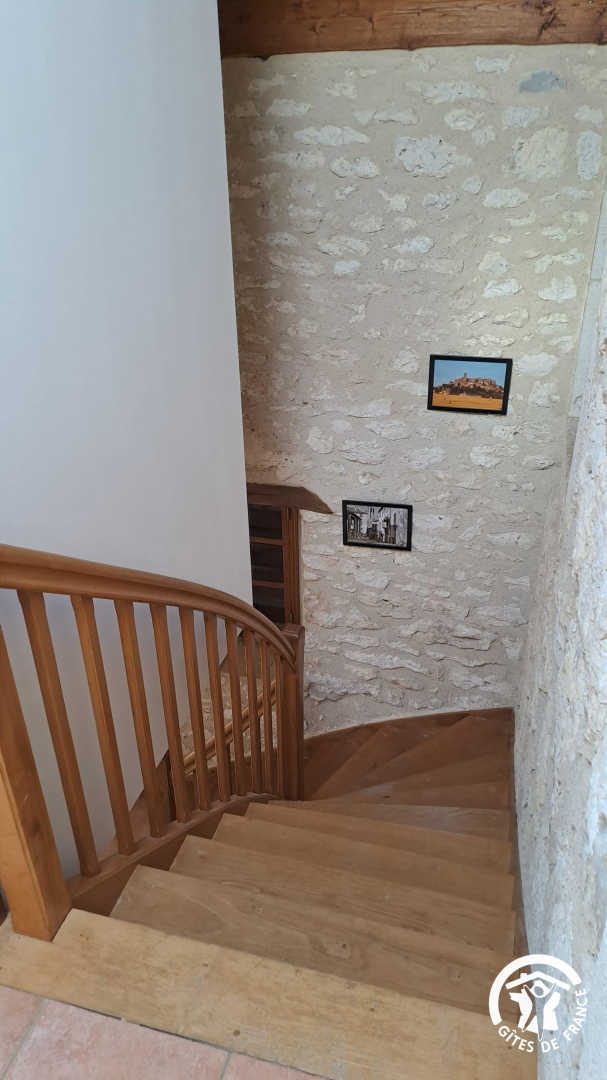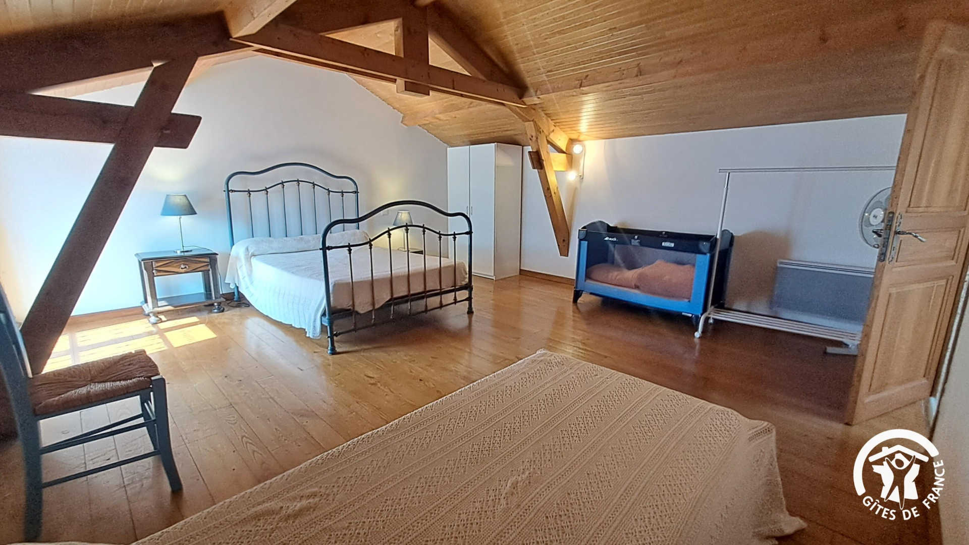 – À l’étage : chambre avec deux lits simples en 90x190cm, chambre avec un lit double en 140x190cm et lit tiroir en 90x190cm (couchage supplémentaire avec le lit tiroir en 90) et lit bébé. Salle d’eau avec douche, wc indépendant.
