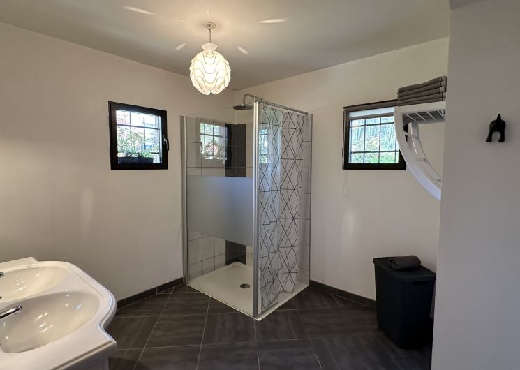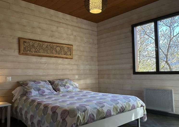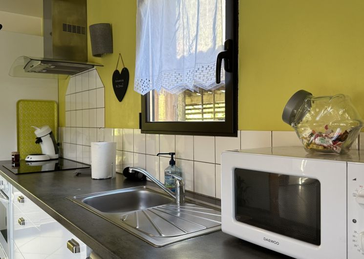 La maison peut accueillir jusqu’à six personnes et s’organise autour d’une grande pièce de vie conviviale réunissant salon, salle à manger et cuisine entièrement équipée. Une chambre avec lit double (140) se trouve au rez-de-chaussée, ainsi qu’une salle d’eau avec douche à l’italienne et des toilettes indépendantes. À l’étage, ouvert sur le séjour, deux chambres complètent l’espace nuit : l’une avec un lit double (140) et un lit bébé, l’autre avec deux lits simples (90).