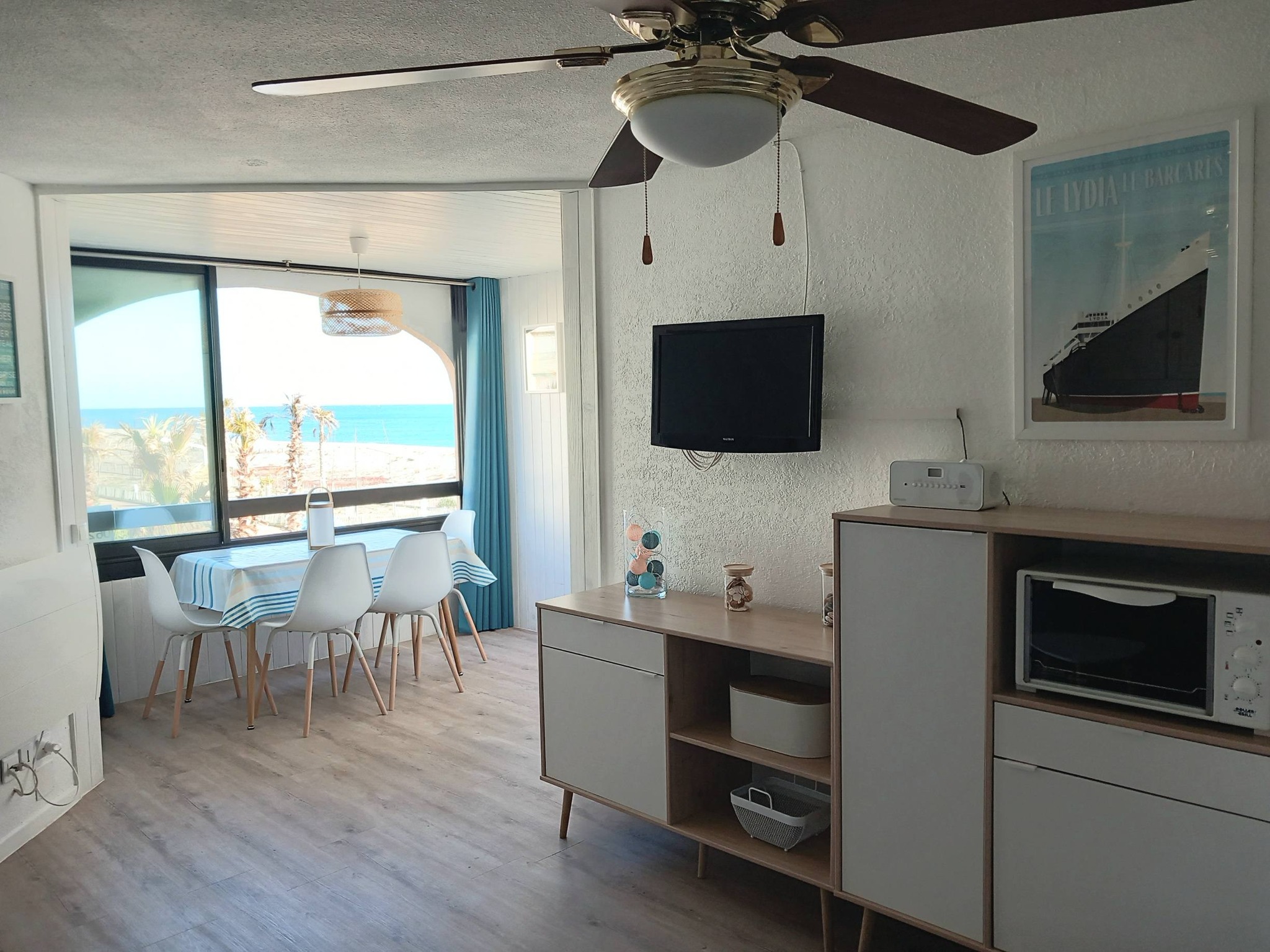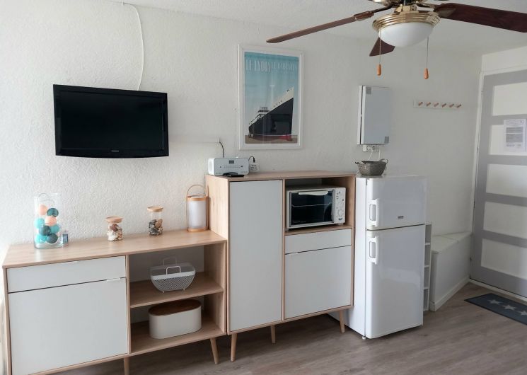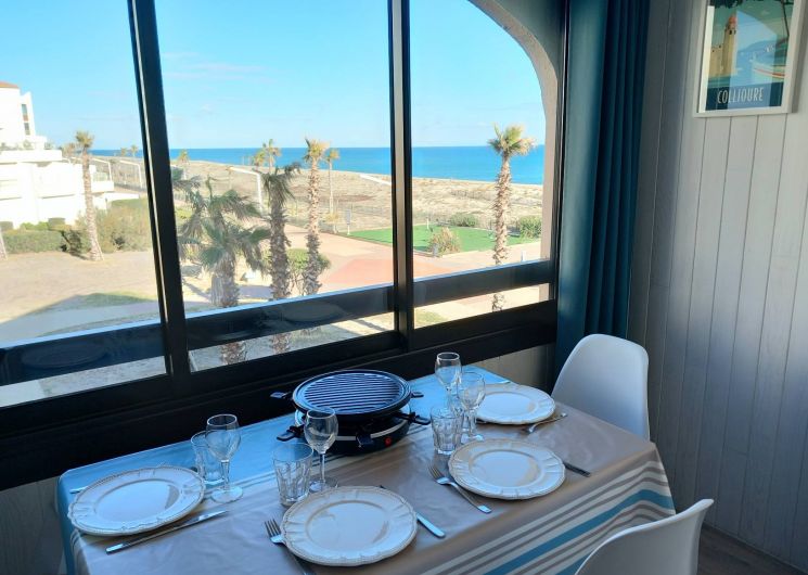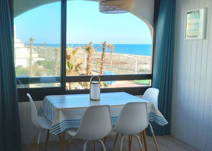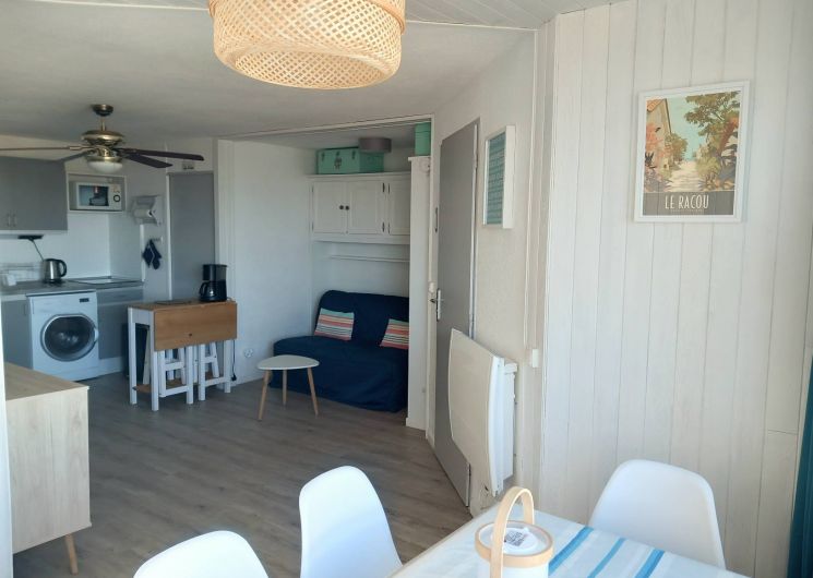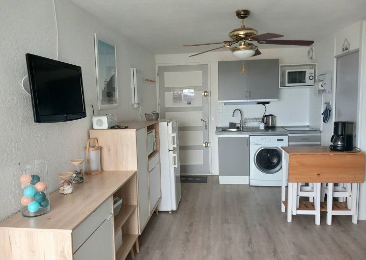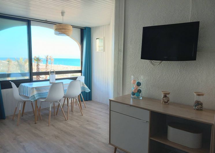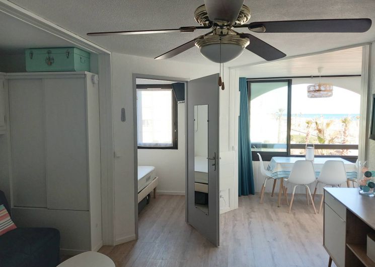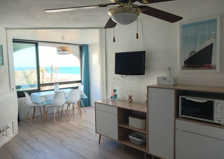 Vous souhaitez séjourner face à la mer à Le Barcarès ? Situé en front de mer au 2è étage d’une résidence dans le quartier du Tertre/Grande Plage, à 500m du Lydia et du festival Les Déferlantes Sud de France. Plage au pied de la résidence. Parking privé. Wi-Fi gratuit. Environnement calme, à deux pas des commerces et restaurants, et de lieux de divertissement (Aqualand, casino, parc aventure, base de sports nautiques…). Idéal pour tout faire à pieds en saison. Composition de l’appartement : – pièce à vivre avec coin cuisine + coin salon avec canapé convertible « rapido » NEUF (couchage 140×190 cm), TV, Wi-Fi, radiateur neuf à inertie, ventilateur de plafond, service à raclette, nombreux rangements. Loggia intégrée à l’appartement. – petite chambre-cabine avec fenêtre, lit 140×190 (matelas neuf), placard et TV. – salle de douche avec WC, sèche-serviette électrique, sèche-cheveux
