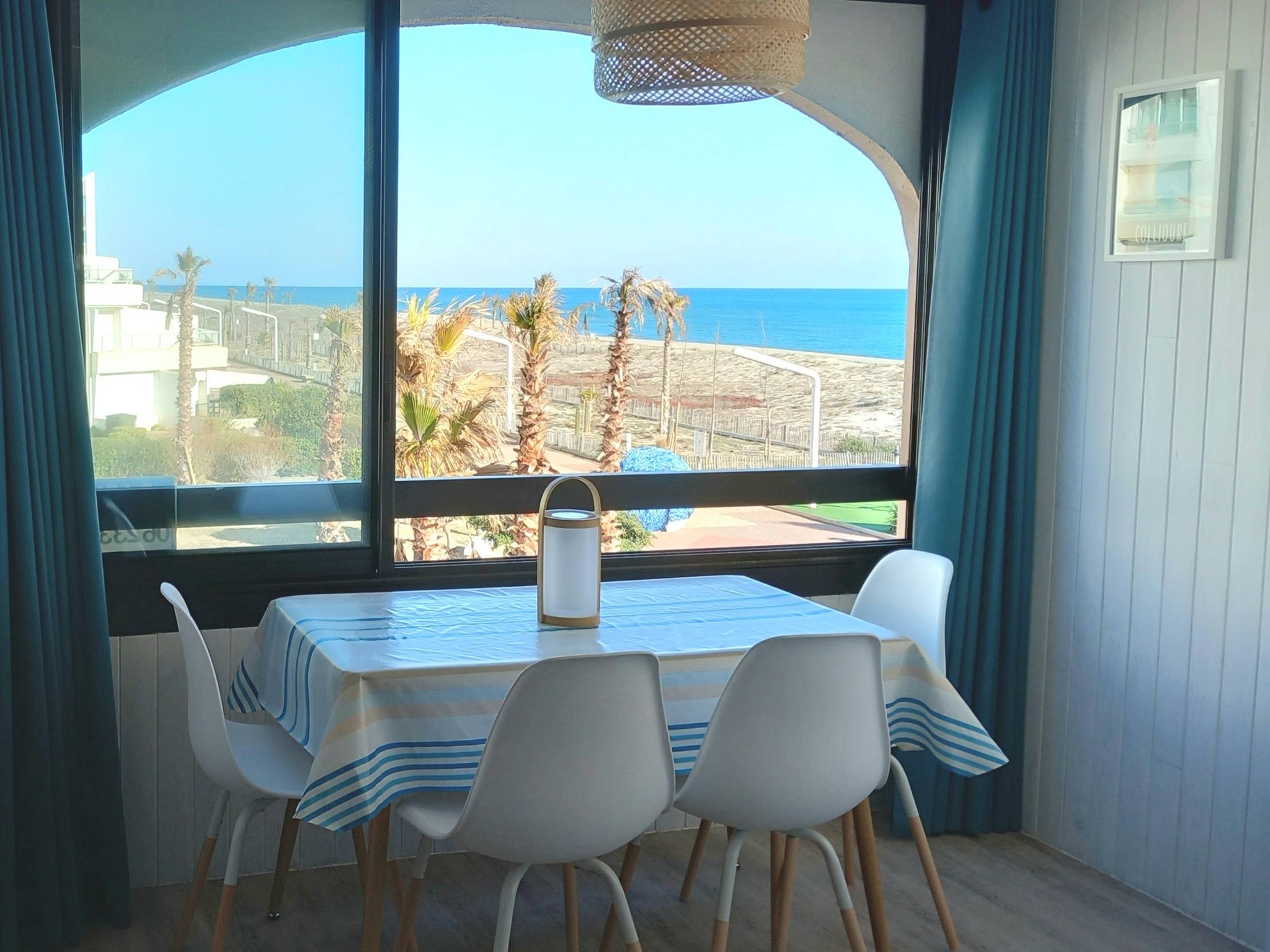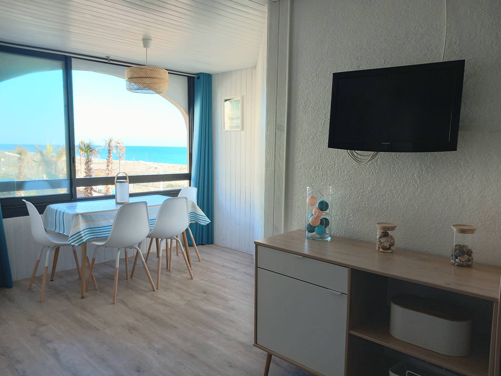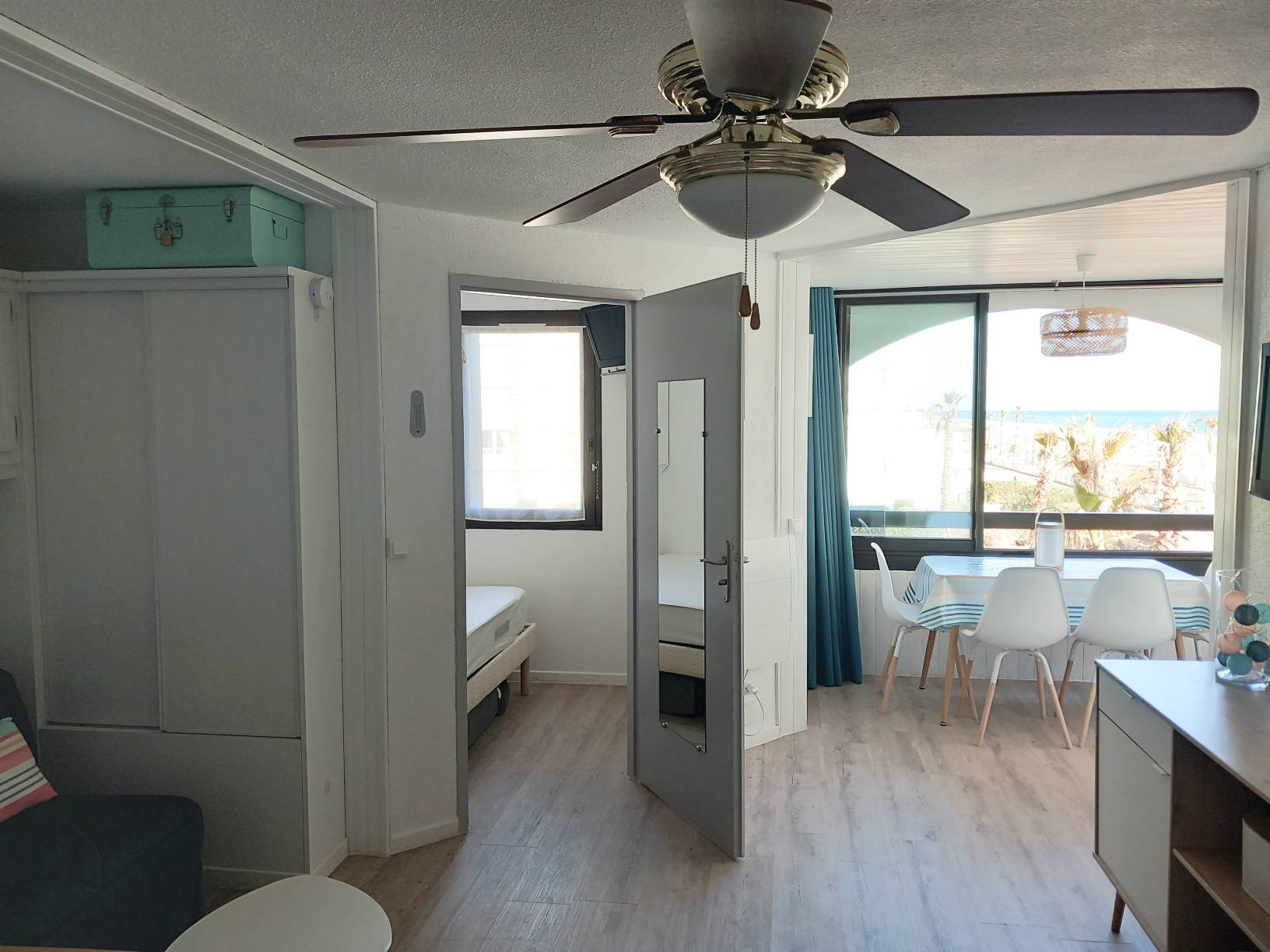 Vous souhaitez séjourner face à la mer à Le Barcarès ? Situé en front de mer au 2è étage d’une résidence dans le quartier du Tertre/Grande Plage, à 500m du Lydia et du festival Les Déferlantes Sud de France. Plage au pied de la résidence. Parking privé. Wi-Fi gratuit. Environnement calme, à deux pas des commerces et restaurants, et de lieux de divertissement (Aqualand, casino, parc aventure, base de sports nautiques…). Idéal pour tout faire à pieds en saison. Composition de l’appartement : – pièce à vivre avec coin cuisine + coin salon avec canapé convertible « rapido » NEUF (couchage 140×190 cm), TV, Wi-Fi, radiateur neuf à inertie, ventilateur de plafond, service à raclette, nombreux rangements. Loggia intégrée à l’appartement. – petite chambre-cabine avec fenêtre, lit 140×190 (matelas neuf), placard et TV. – salle de douche avec WC, sèche-serviette électrique, sèche-cheveux