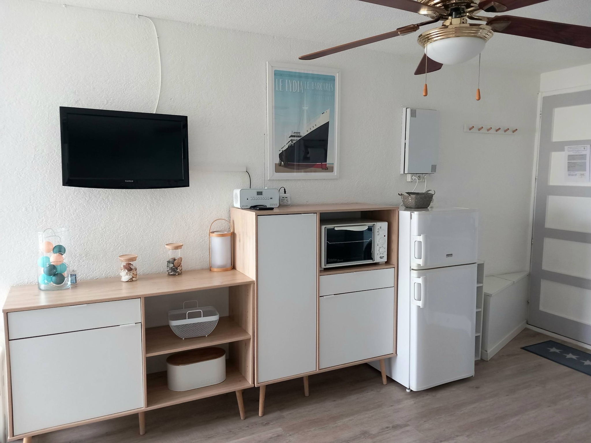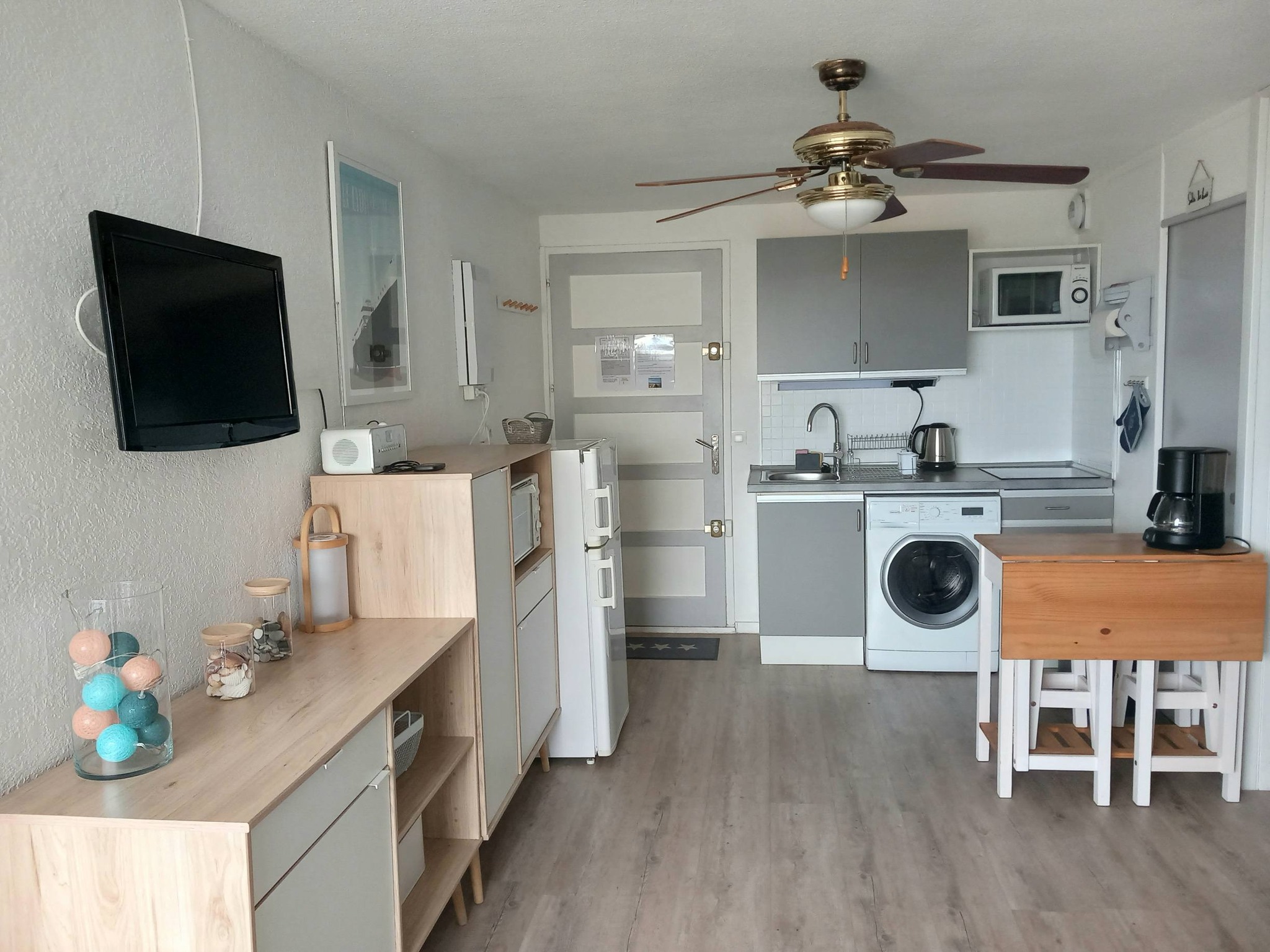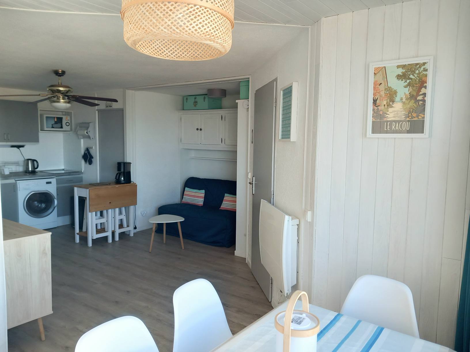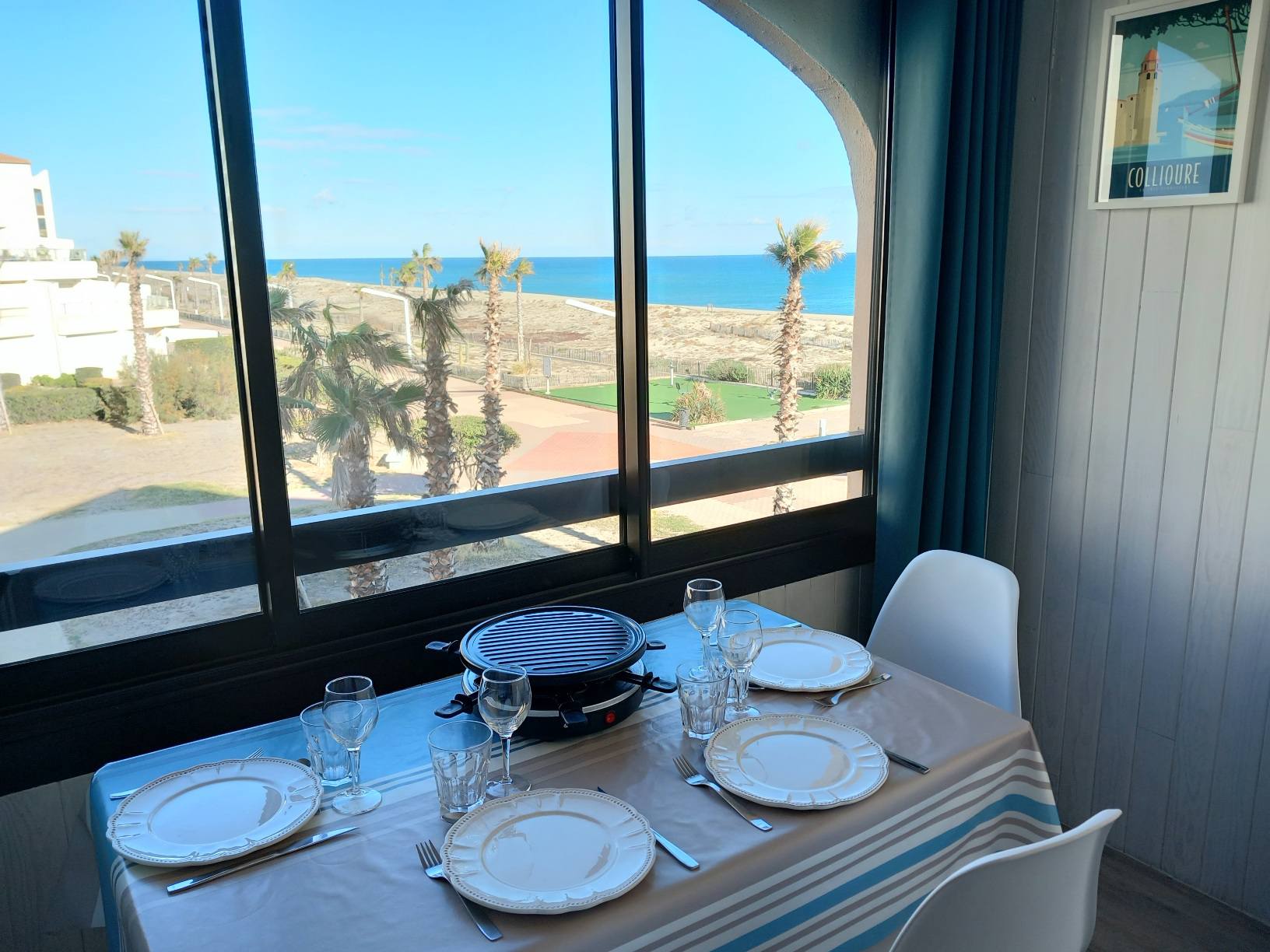 Vous souhaitez séjourner face à la mer à Le Barcarès ? Situé en front de mer au 2è étage d’une résidence dans le quartier du Tertre/Grande Plage, à 500m du Lydia et du festival Les Déferlantes Sud de France. Plage au pied de la résidence. Parking privé. Wi-Fi gratuit. Environnement calme, à deux pas des commerces et restaurants, et de lieux de divertissement (Aqualand, casino, parc aventure, base de sports nautiques…). Idéal pour tout faire à pieds en saison. Composition de l’appartement : – pièce à vivre avec coin cuisine + coin salon avec canapé convertible « rapido » NEUF (couchage 140×190 cm), TV, Wi-Fi, radiateur neuf à inertie, ventilateur de plafond, service à raclette, nombreux rangements. Loggia intégrée à l’appartement. – petite chambre-cabine avec fenêtre, lit 140×190 (matelas neuf), placard et TV. – salle de douche avec WC, sèche-serviette électrique, sèche-cheveux