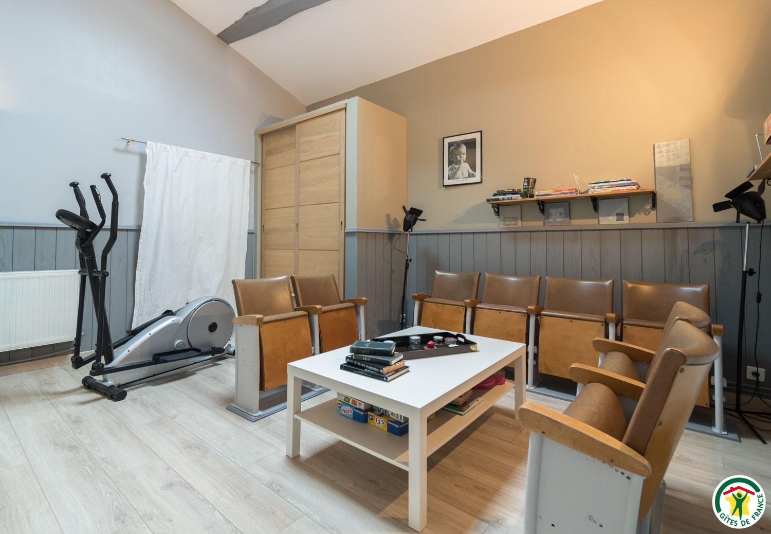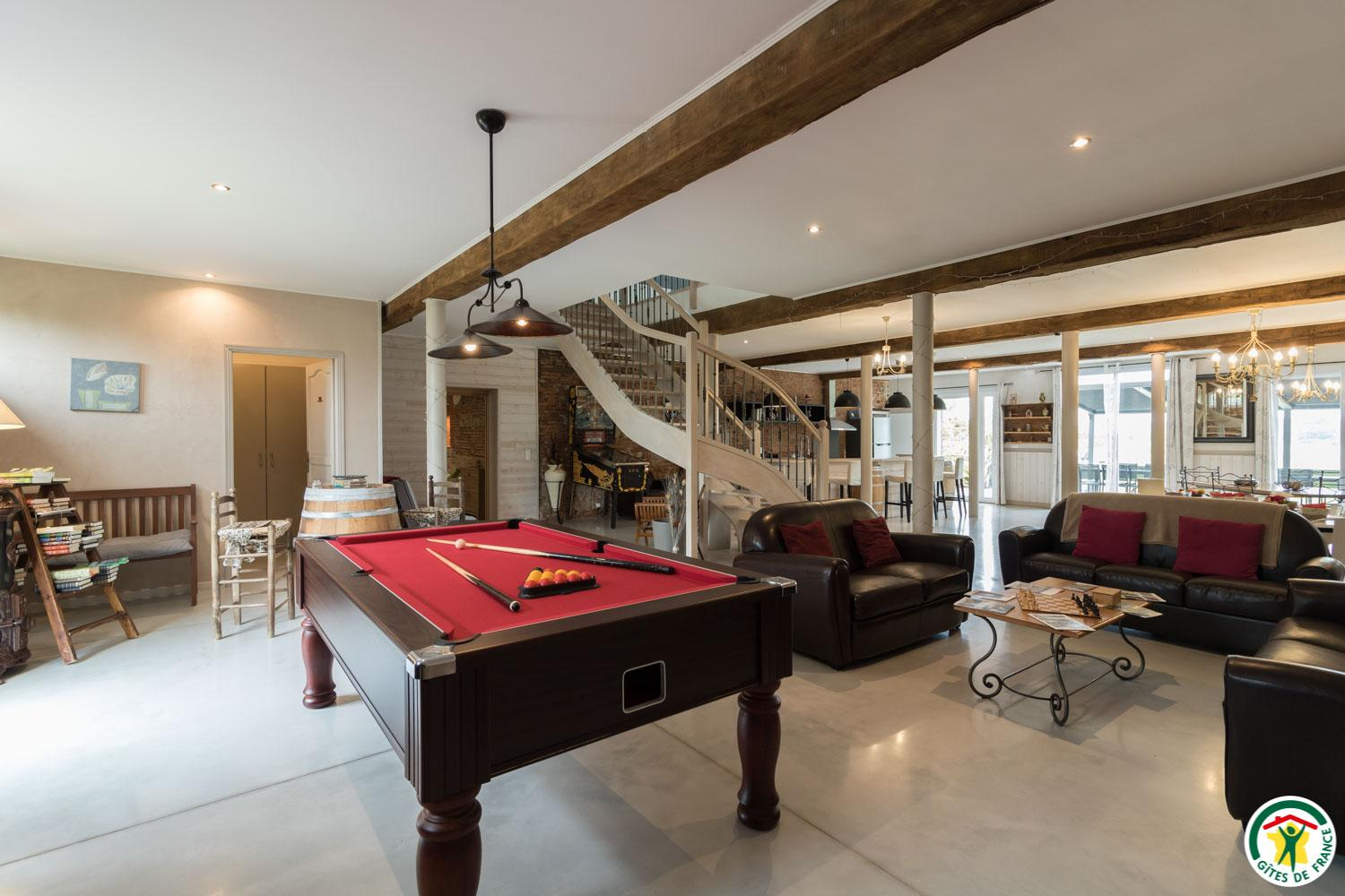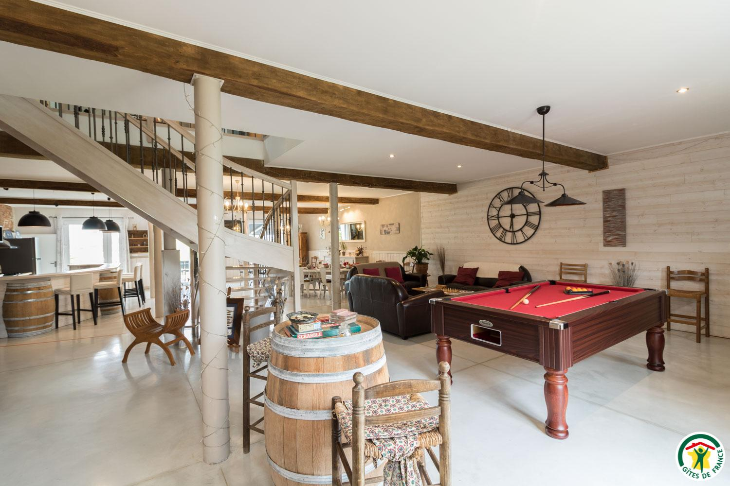 Au rez-de-chaussée : très grand pièce de vie répartie en plusieurs espaces ouverts : la cuisine derrière le bar, la salle à manger, le salon et le billard/flipper. Chambre accessible aux personnes à mobilité réduite (1 lit pour 2 personnes en 160cm + 2 lits gigogne pour 1 personne en 90cm + salle d’eau/WC), WC indépendant.