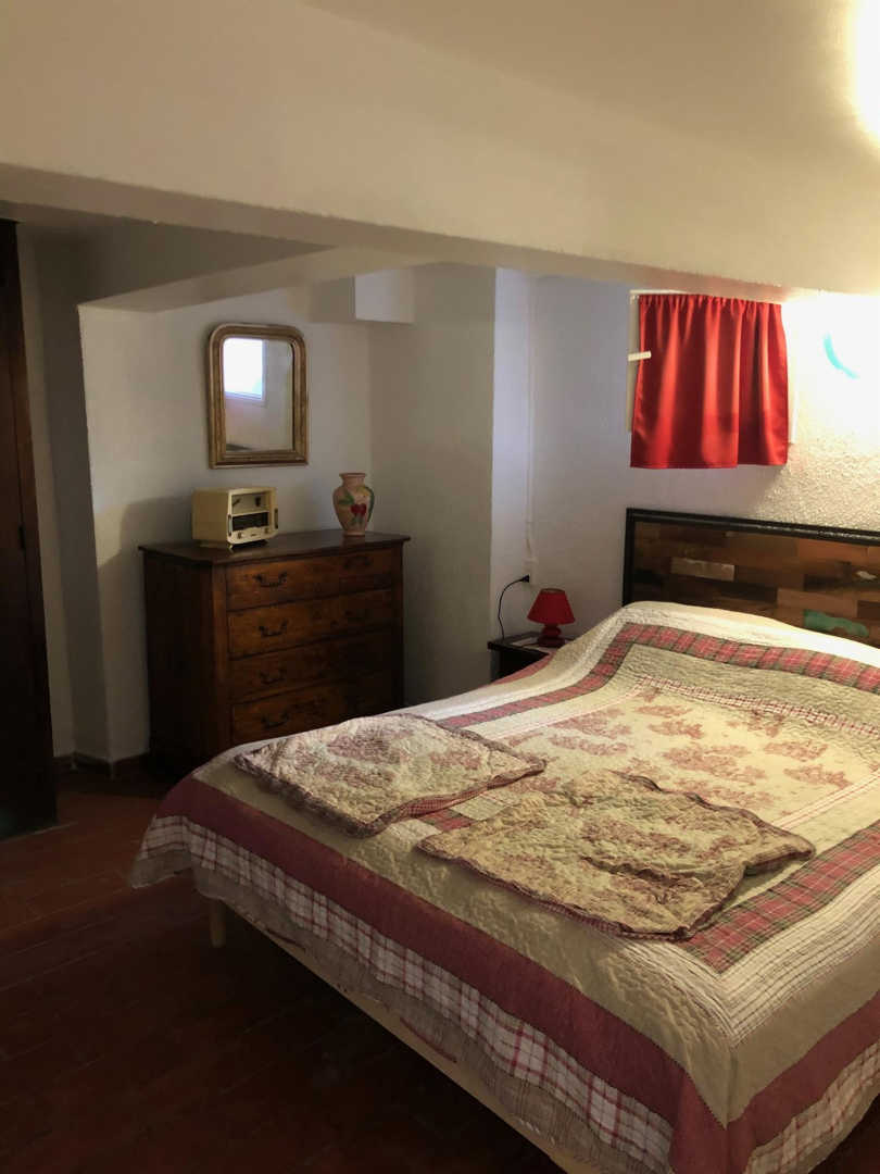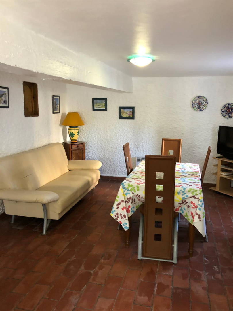 RDC (plafond bas) : séjour avec coin cuisine, 2 chambres (2 lits 1 pers en 90) (1 lit 2 pers en 160), salle d’eau (wc). Jardin commun (balançoire, toboggan, jeu de basket, barbecue, meubles de jardin communs). Terrasses, parking privé.