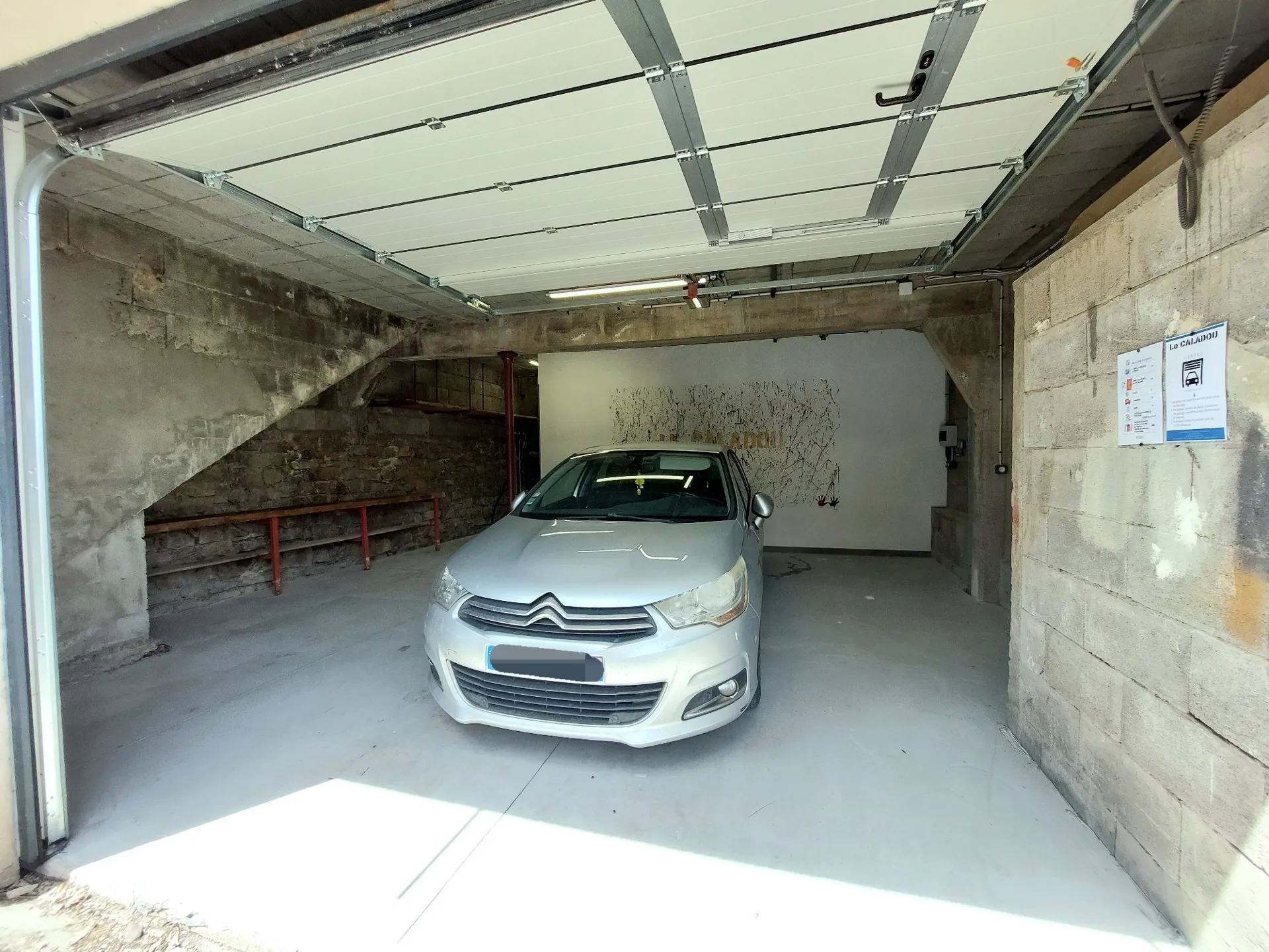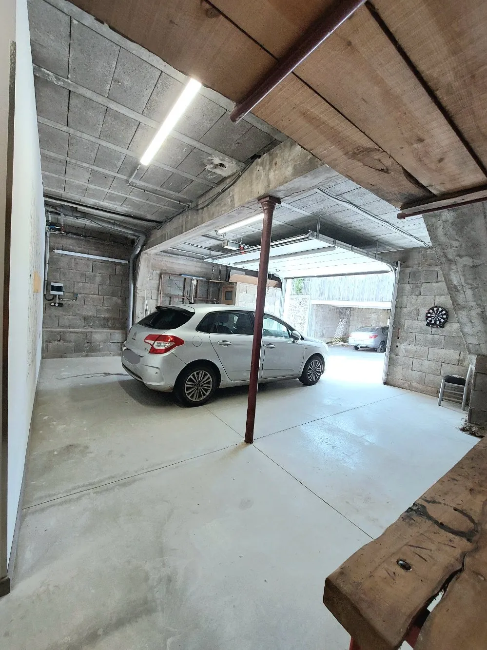 Un garage privé avec portail électrique de 45 m² avec accès direct à l’appartement, prise de recharge pour voiture électrique et jeux de fléchettes.