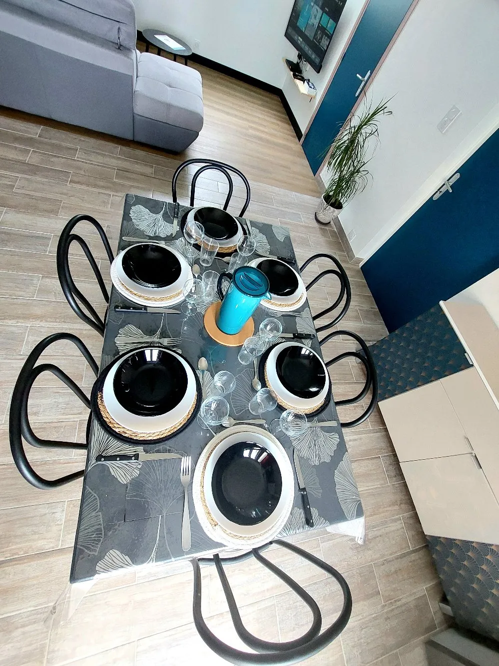 Une cuisine toute équipée avec plaque à induction, lave vaisselle, four, frigo et congélateur, micro ondes, Senseo, bouilloire, grille pain, etc.