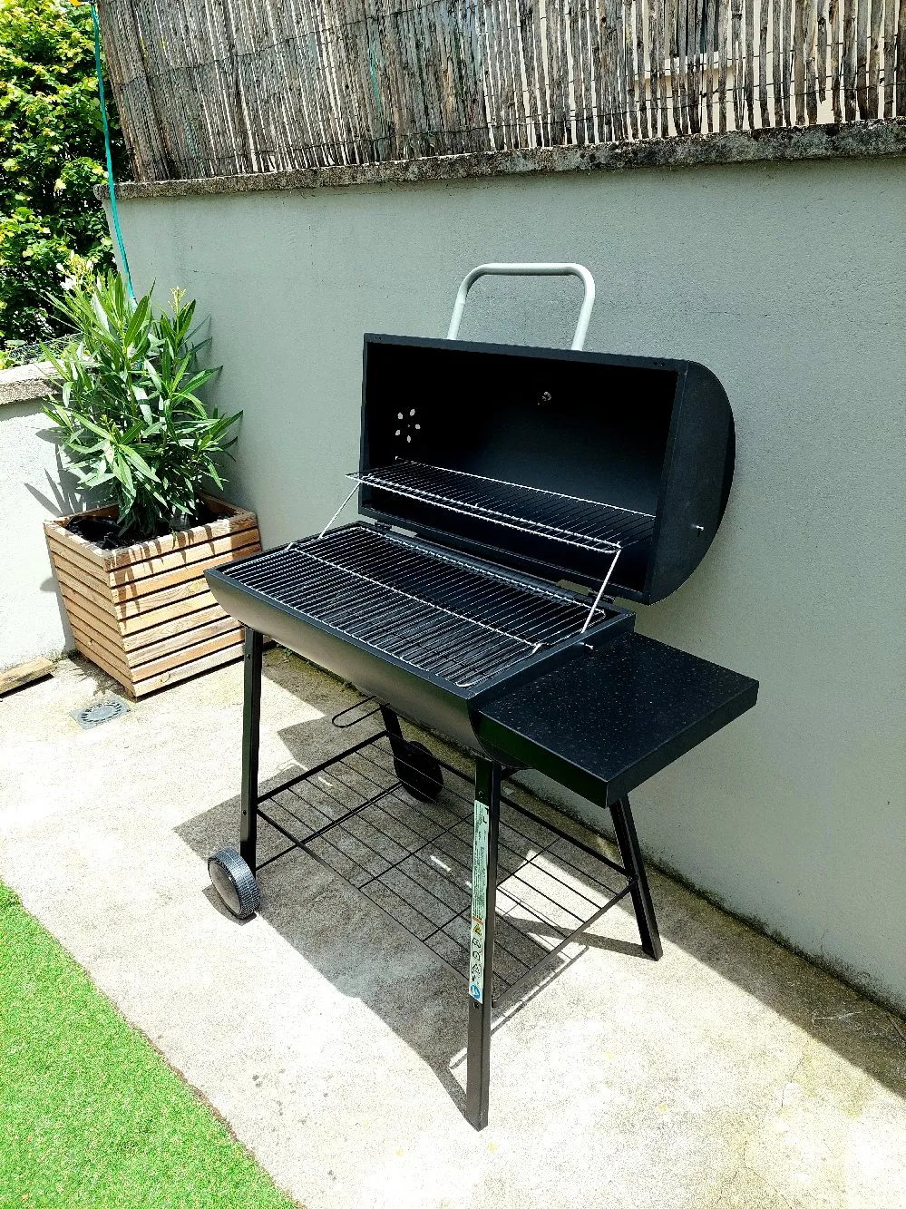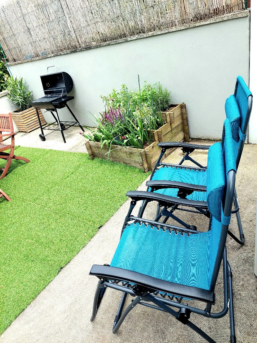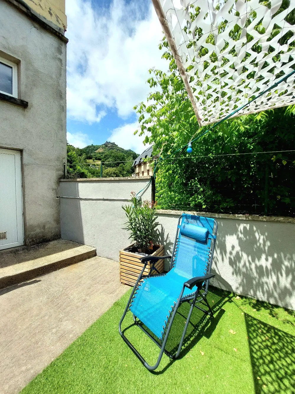 Une terrasse privée de 30 m² avec vue sur le Château de Calmont, table et chaises extérieures, deux relax et barbecue à disposition.