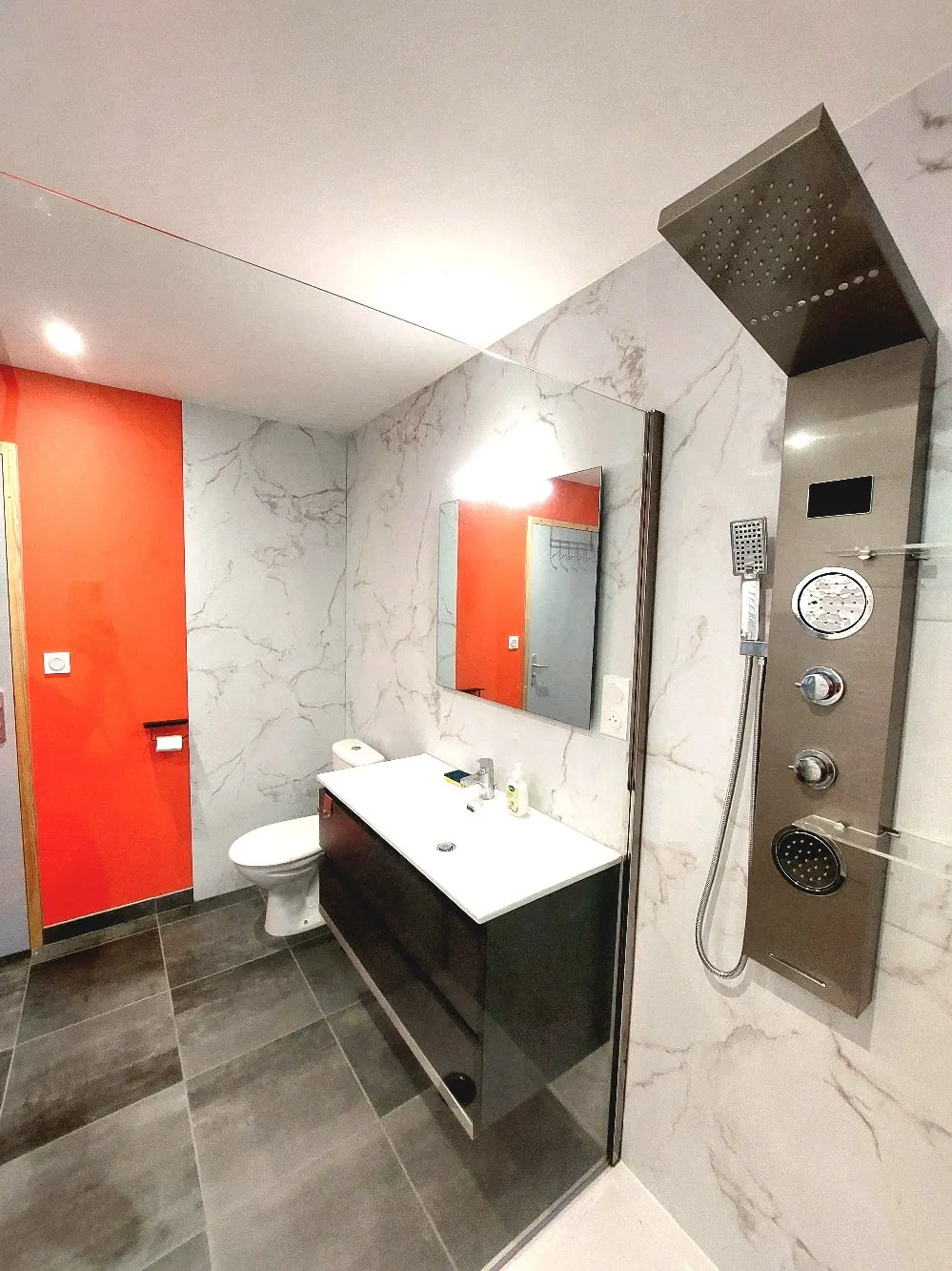 Une salle de bain spacieuse avec un receveur de 90x140cm et sa colonne de douche avec jets.