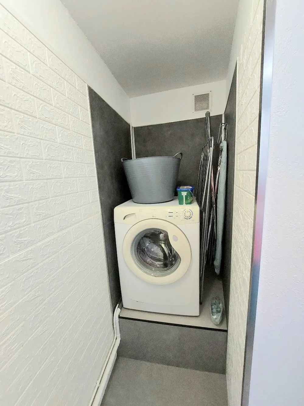 Un WC supplémentaire avec machine à laver, une table et un fer à repasser.