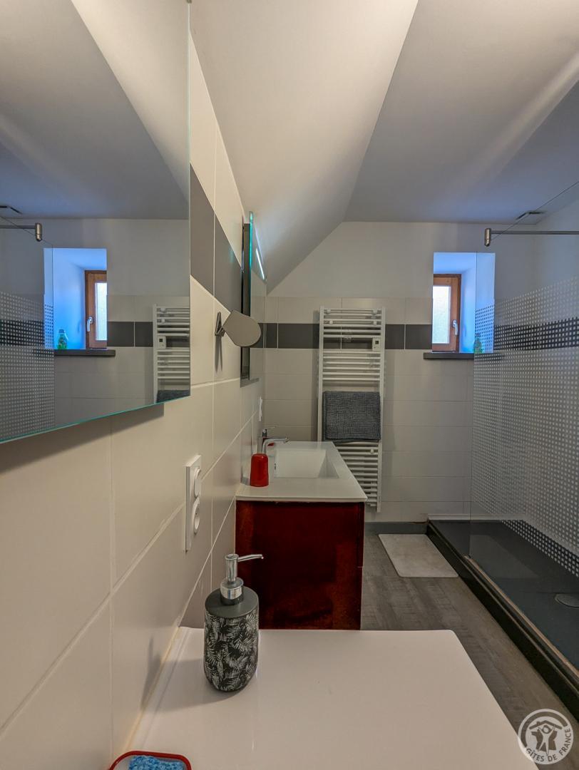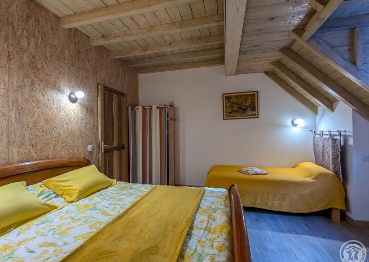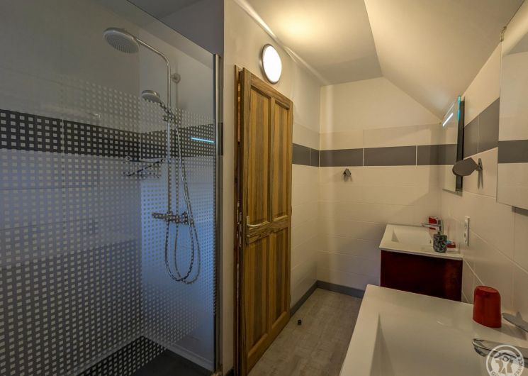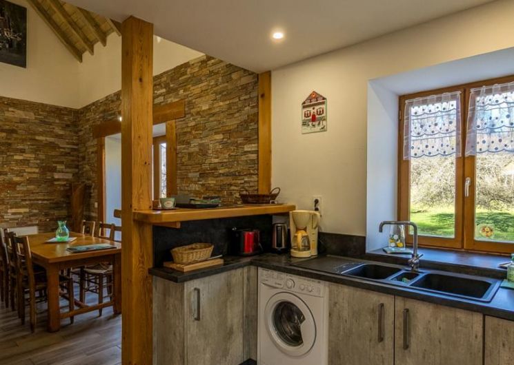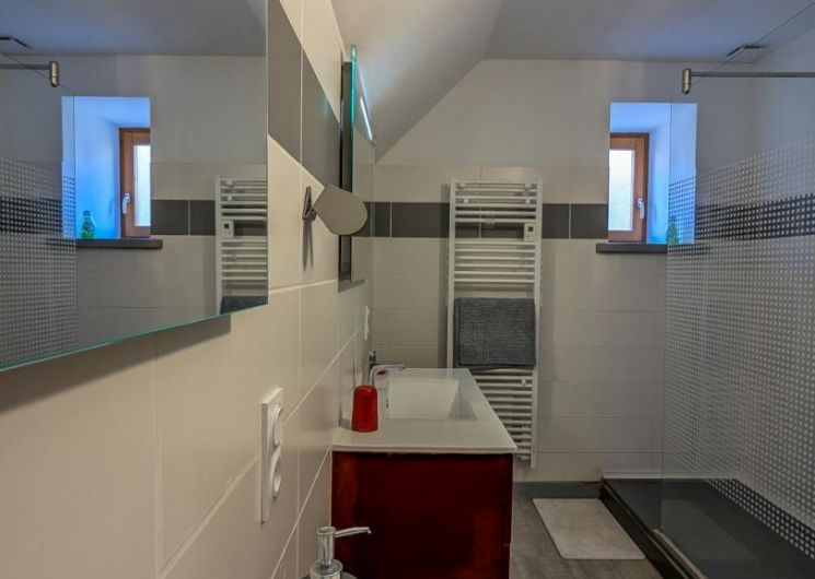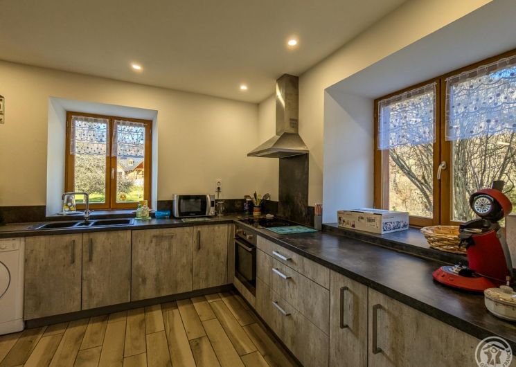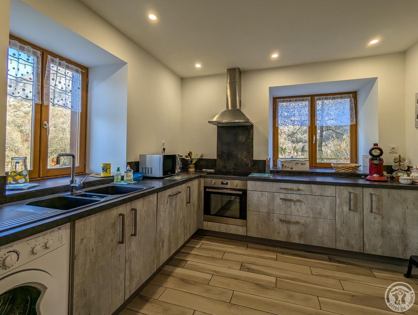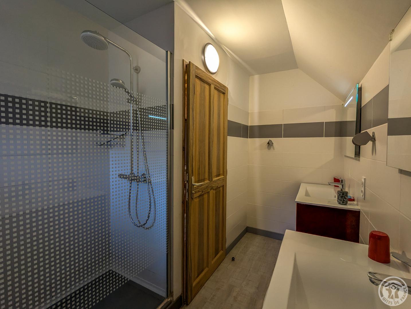 Au rez-de-chaussée du gîte : entrée après deux marches, cuisine intégrée (four intégré, plaque vitrocéramique à 3 feux, réfrigérateur-congélateur, micro-ondes), séjour avec coin-repas et espace salon, une chambre avec sa petite salle d’eau et WC séparés à l’intérieur de la chambre (1 lit pour 2 personnes en 160*200cm). A l’étage : salle d’eau avec une grande douche et deux vasques, WC séparés, 2 chambres avec chacune (1 lit pour 2 personnes en 160*200 et 1 lit pour 1 personne en 90*190). Jardin. Aire de stationnement. Chauffage électrique. Accès Internet Wifi. Animaux non-admis. Jardin clos.