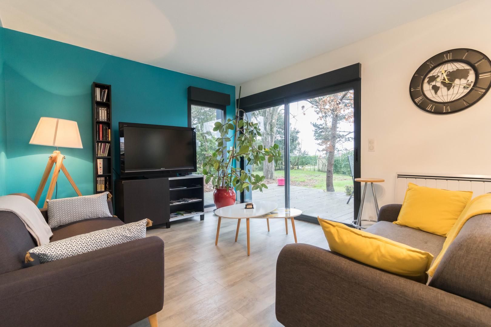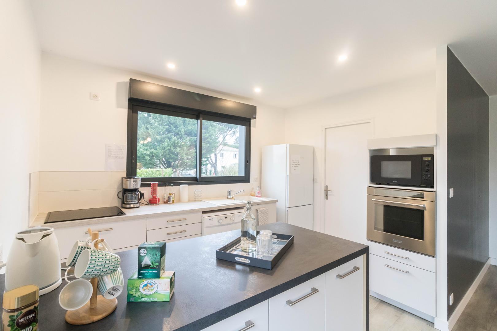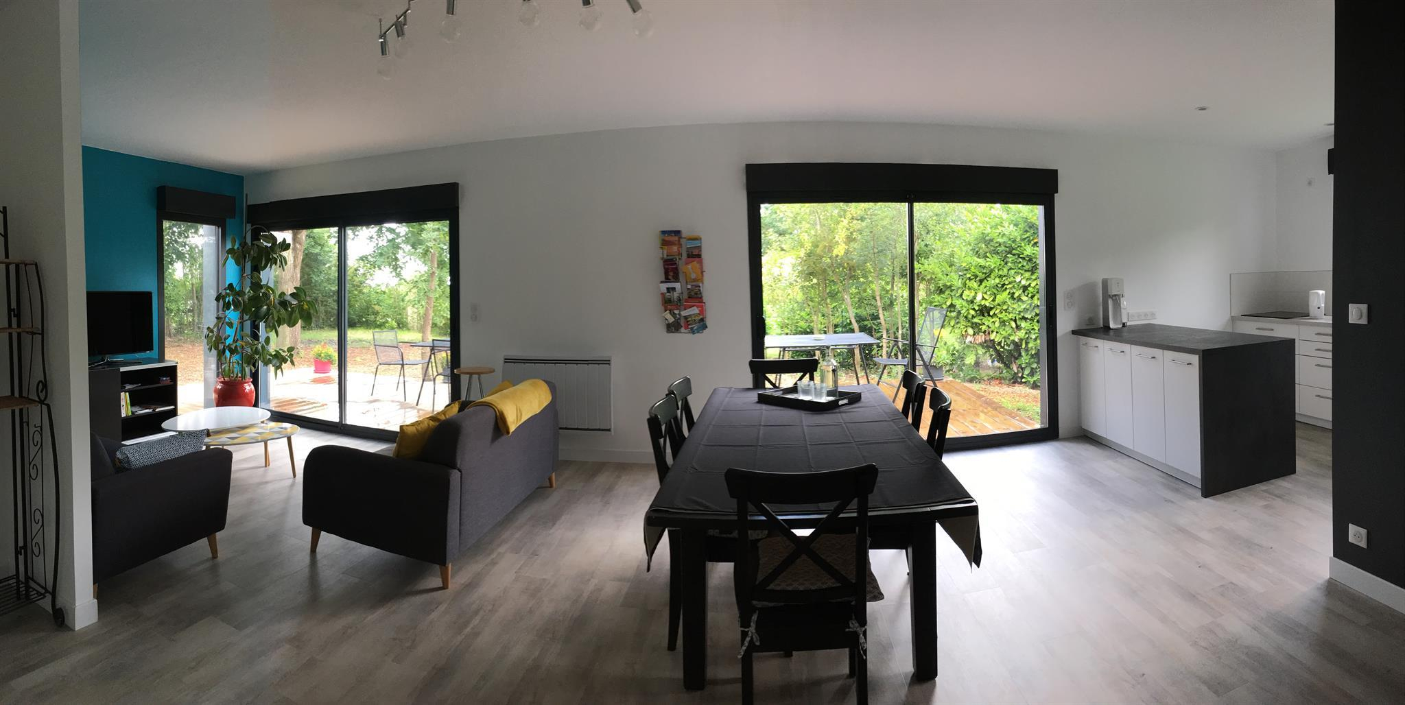 La maison, mitoyenne de celle des propriétaires, est aménagée de plain pied avec une belle pièce de vie, commune à aux 2 chambres, qui accueille la table des petits déjeuners, un salon pour la détente équipé d’un téléviseur et de 2 canapés. ainsi qu’une cuisine avec réfrigérateur, congélateur, micro onde, plaque de cuisson, four et bouilloire.