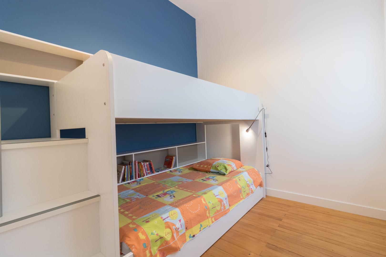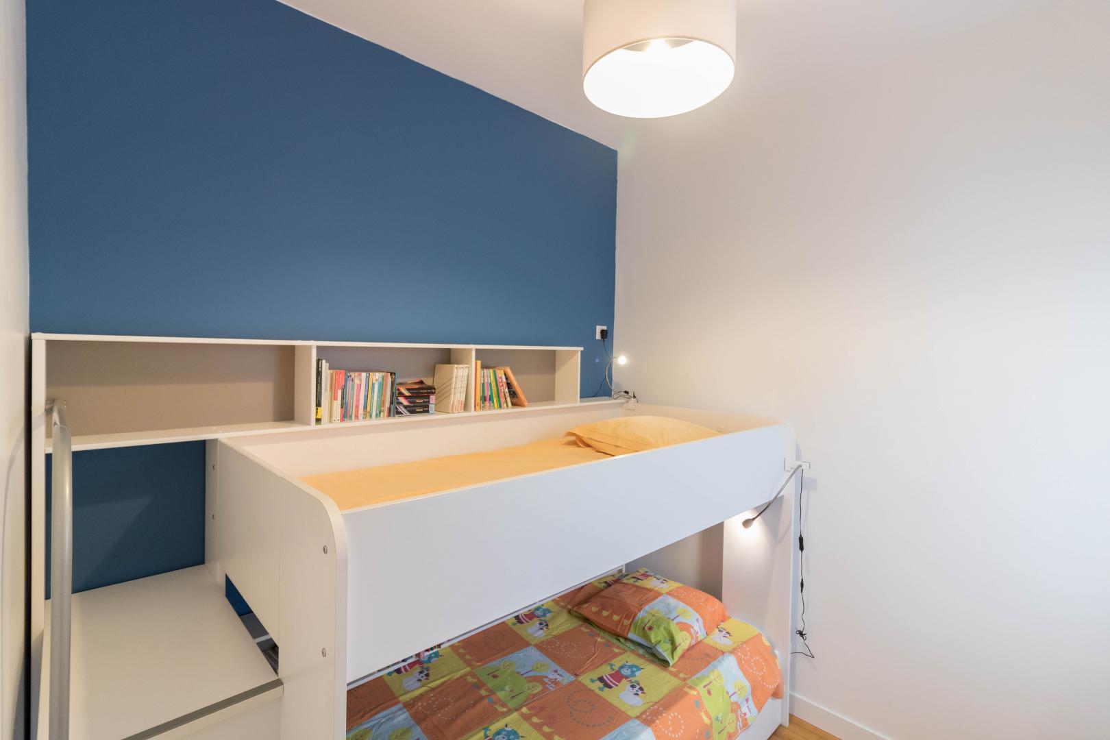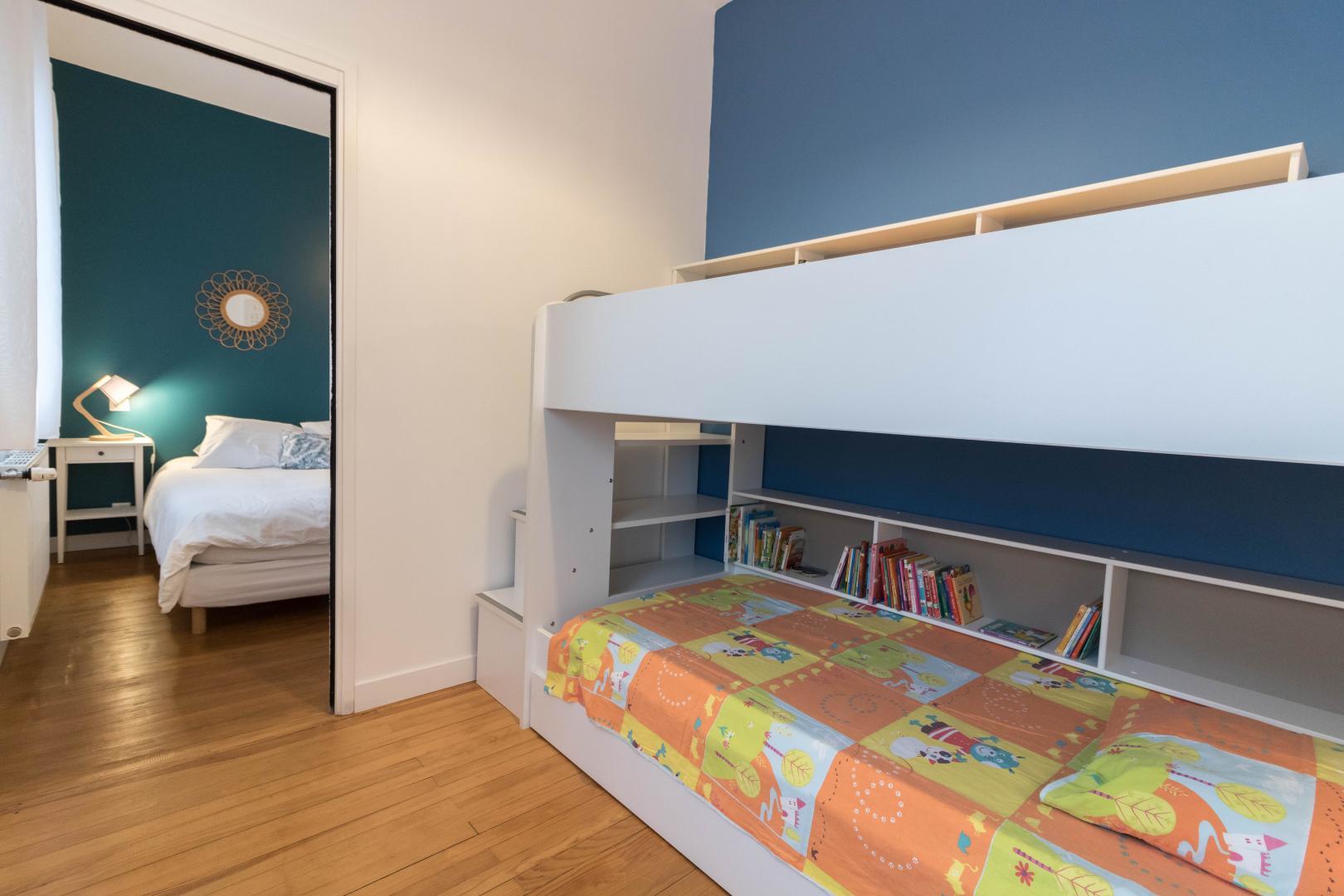– La Chambre Familiale est faite pour un couple avec 2 enfants . Dans la chambre parentale, vous trouverez un lit pour double en 160*200cm, une petite chambre d’enfant attenante et séparée avec un lit superposé adapté aux enfants de 2 à 13 ans** (lit simple en 90*190cm), une salle d’eau privative avec douche et WC.