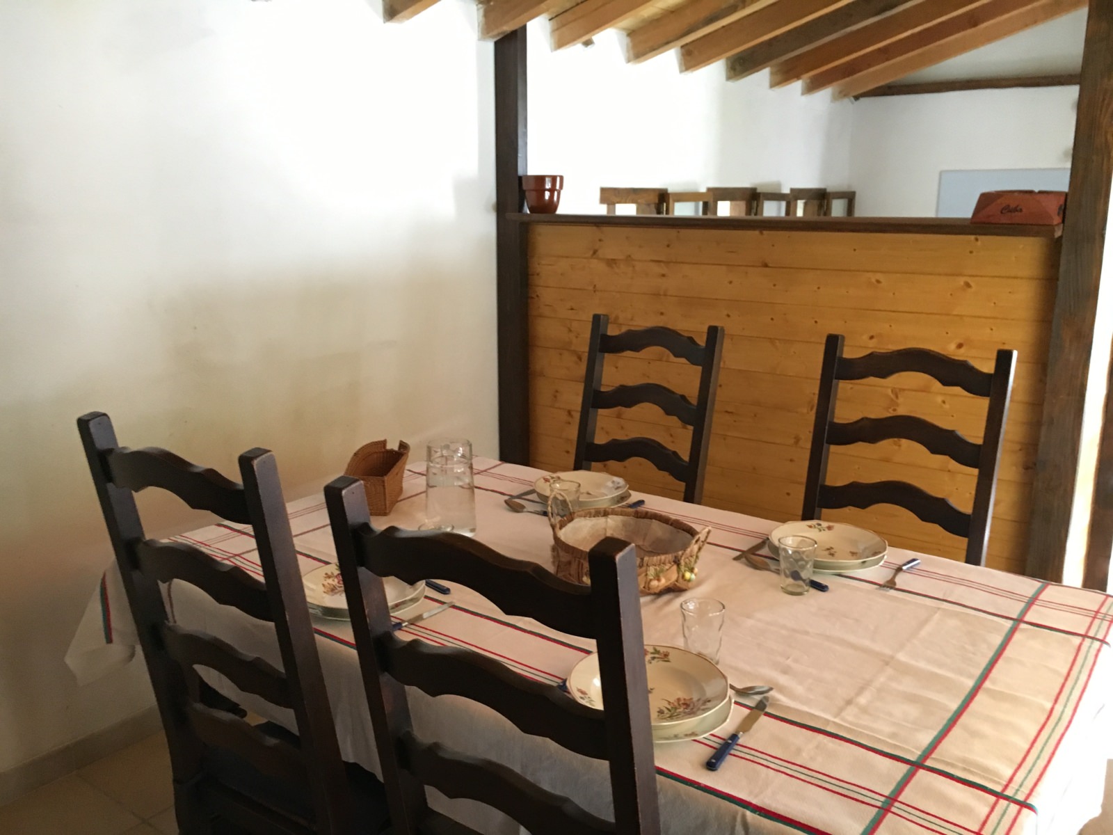 L’espace repas comporte une table, 6 chaises et un buffet.
