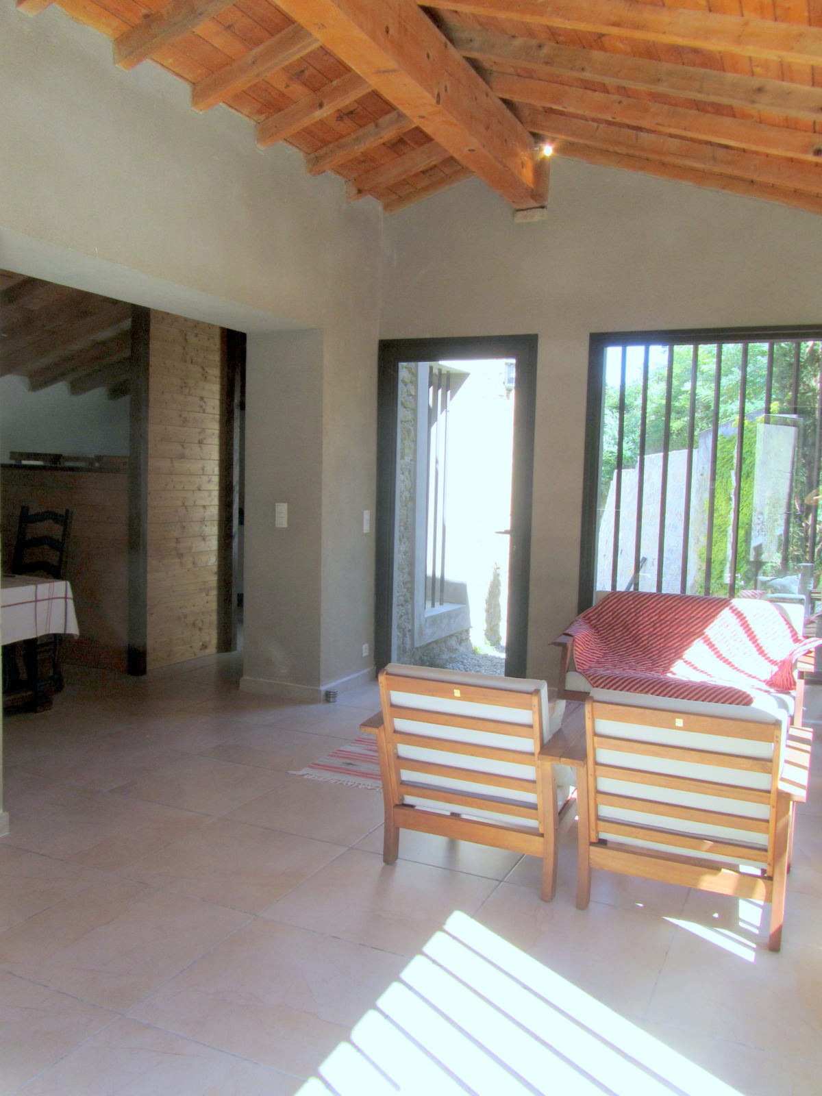 Vous trouverez au salon ouvert sur le jardin, un canapé, deux fauteuils et une table basse,