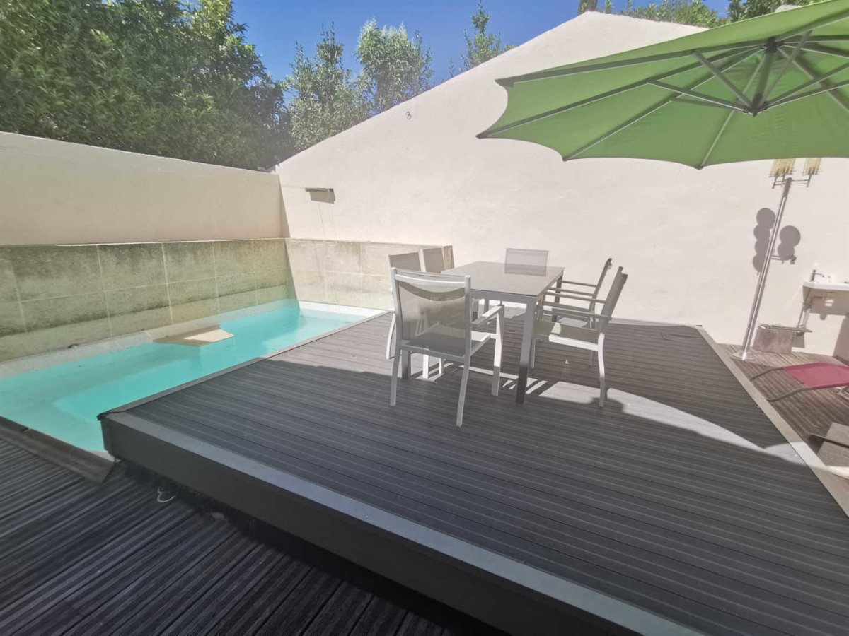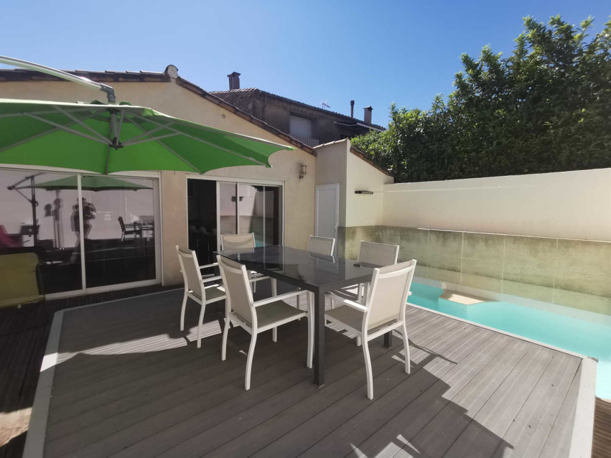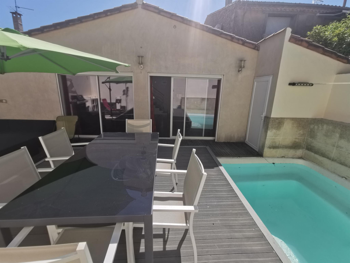 Autre gîte sur le même niveau, côté opposé : 1 chambre (1 lit 160X200cm), 1 chambre (2 lits 1 personne), salle de bains/wc, dressing/salle d’eau, demi niveau inférieur : grande pièce à vivre (50m²) avec espace cuisine/salle à manger/salon ouvrant sur terrasse, chauffage clim réversible inclus, TV. Terrasse (60m²), piscine privative de juin à septembre (4,30X2,70), salon de jardin, garage commun avec un autre gîte (1 seul véhicule/gîte). Possibilité location de draps et ménage fin de séjour à la demande. Entreprises non autorisées. Superficie : 106 m²._ ATTRAITS TOURISTIQUES : Montpellier, les plages, l’étang de Thau, Sète (patrie de Paul Valéry et Georges Brassens, musées, théatre de la mer), Abbaye de Valmagne, Pézenas, base ULM à 1 km.