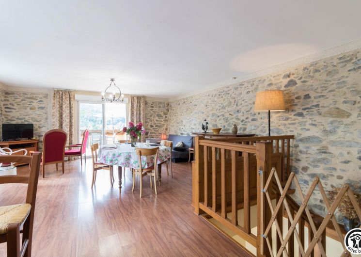 – au premier étage : grand séjour avec cuisine américaine, donnant sur une terrasse de 30m², 1 chambre (1 lit 2 personnes en 140cm) avec salle d’eau, 1 WC indépendant.