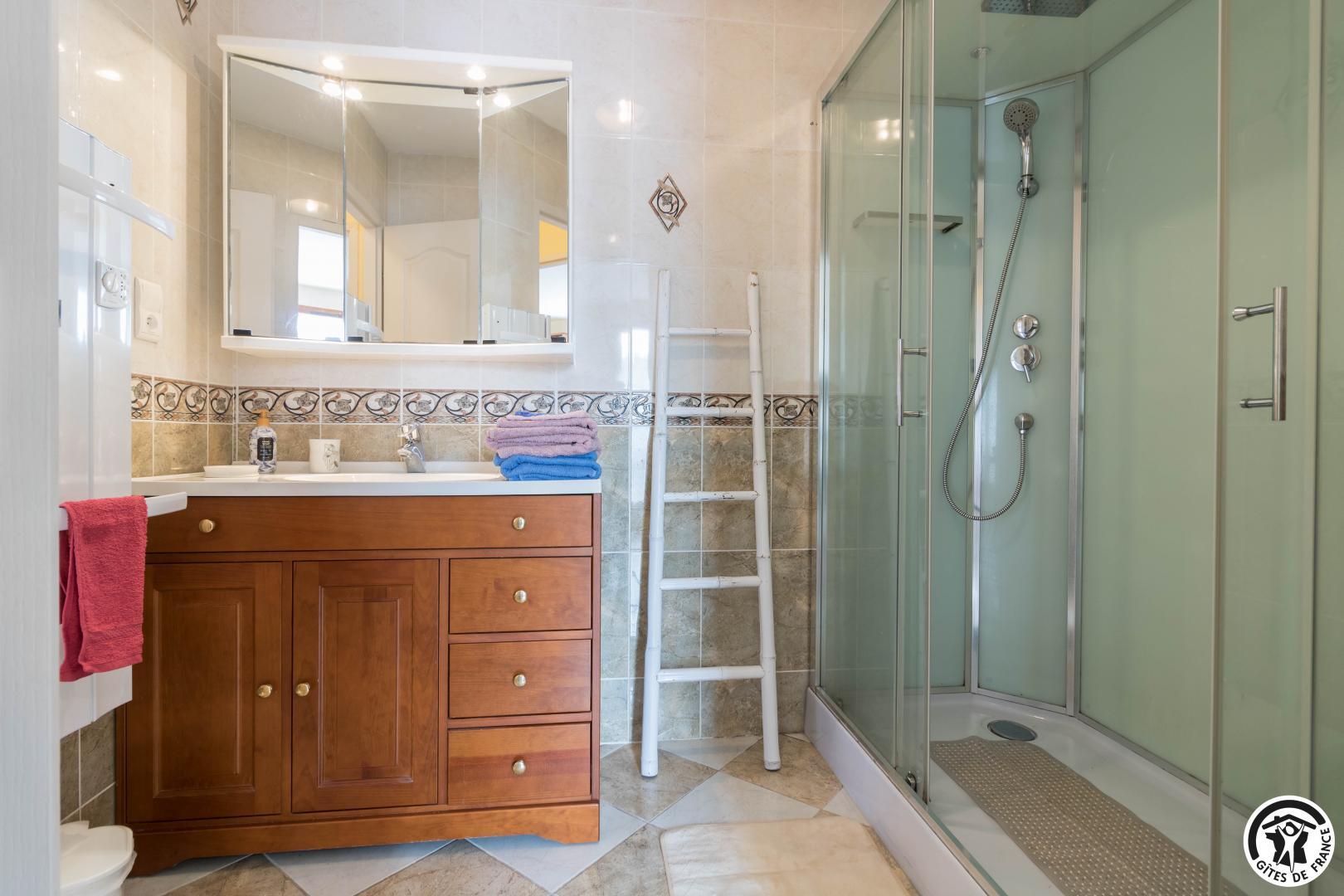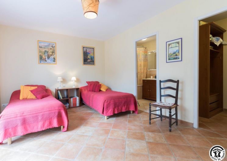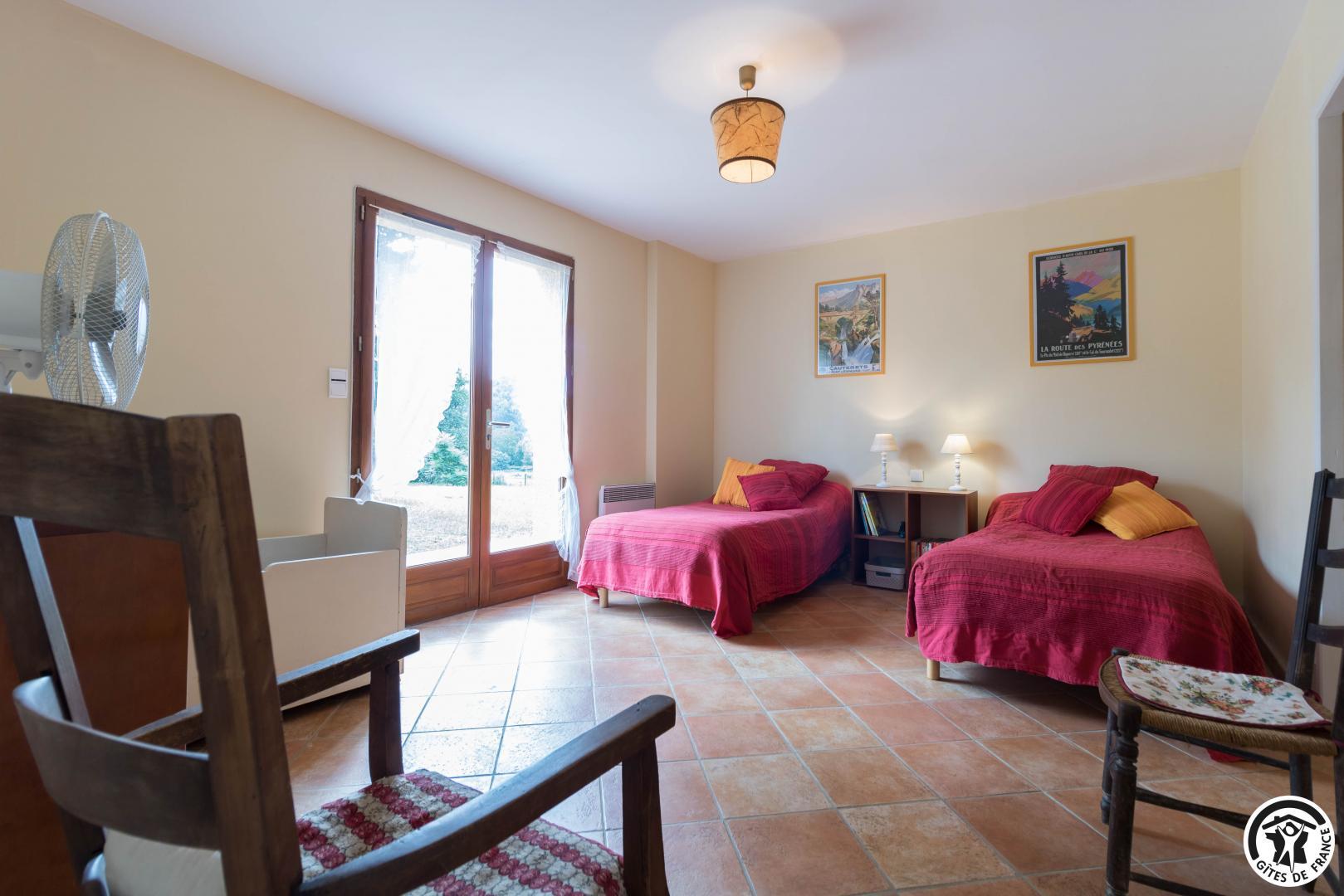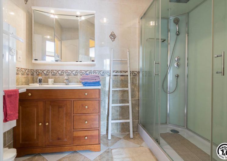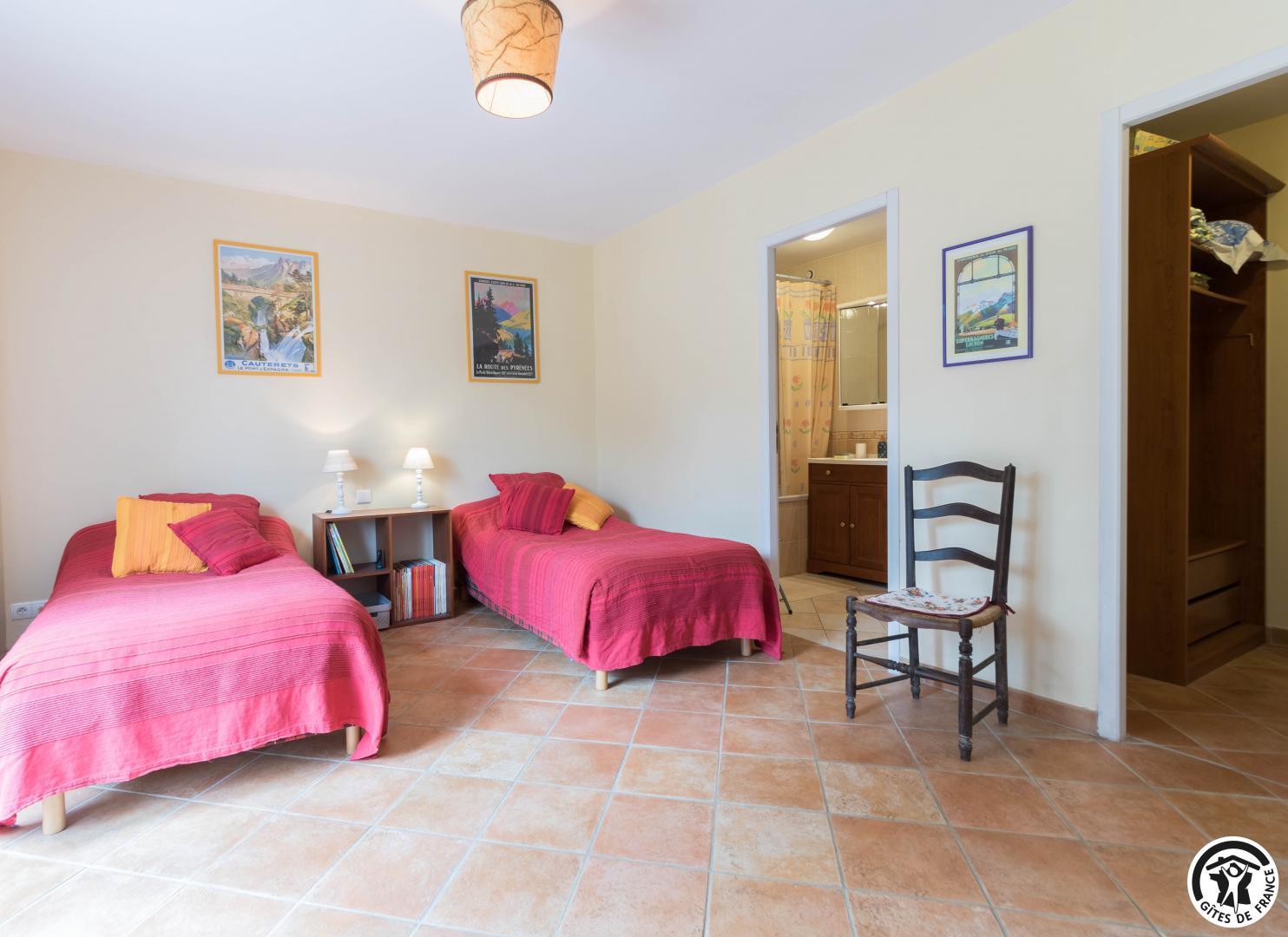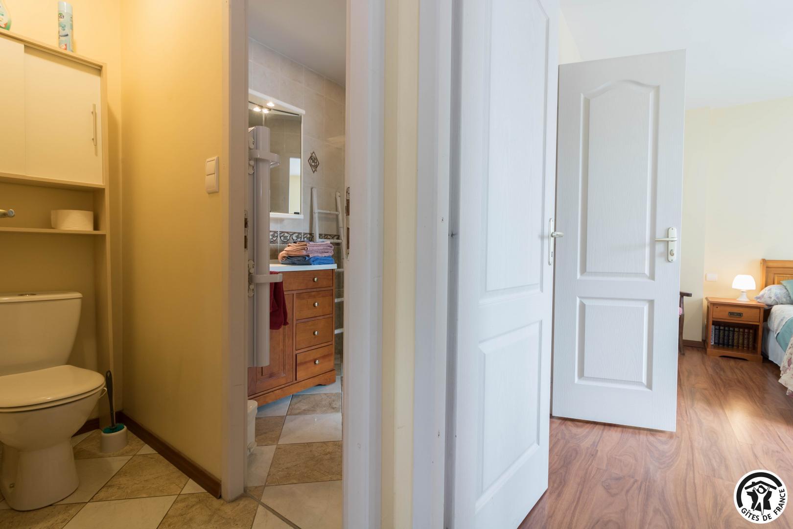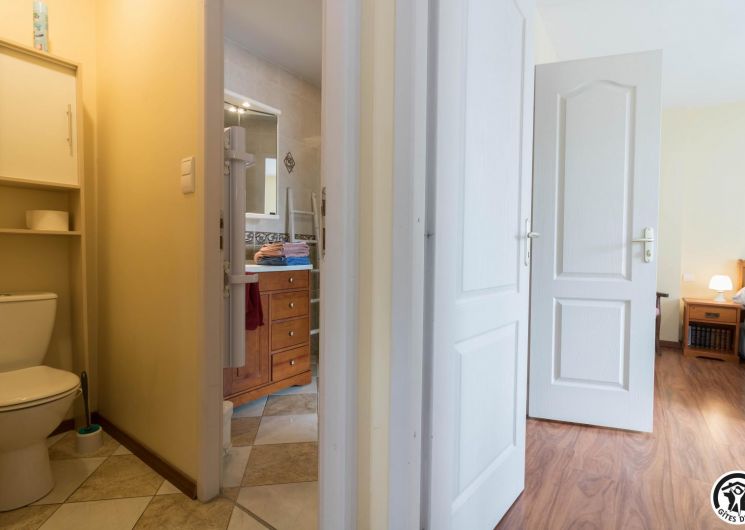 – au rez-de-chaussée : entrée desservant 1 WC indépendant et 1 chambre (2 lits en 90cm + lit bébé) avec salle de bains.