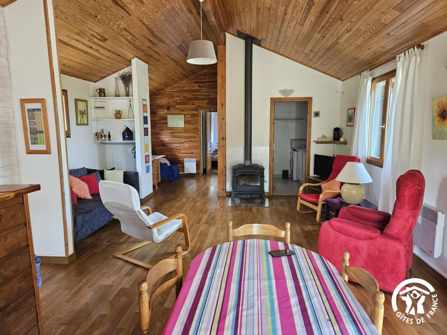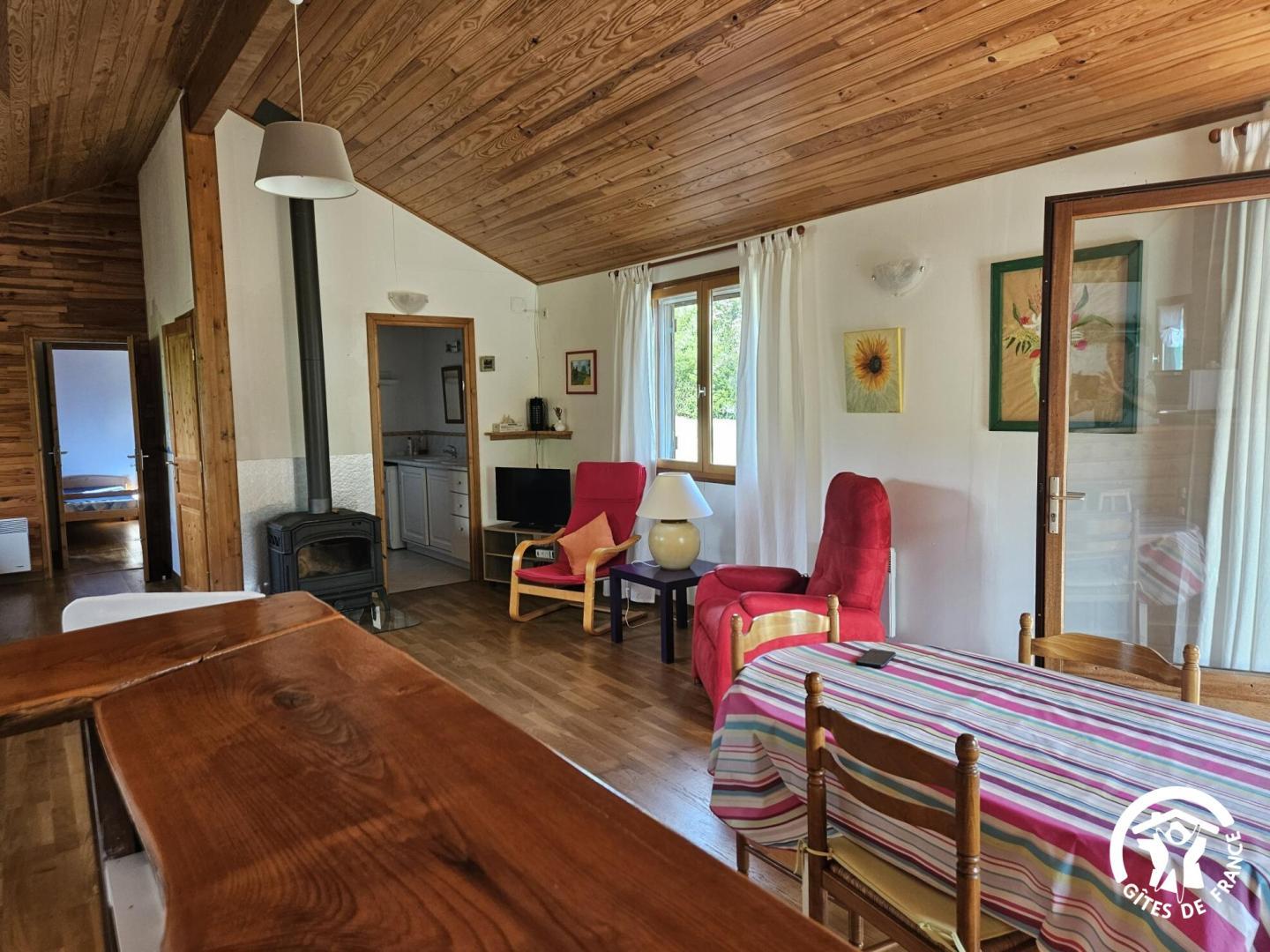 * pièce à vivre avec cuisine ouverte, coin salon : canapé et fauteuils, tv, poêle à bois. Equipement cuisine : réfrigérateur + congélateur, 4 feux gaz, four gaz + petit four électrique, micro-ondes