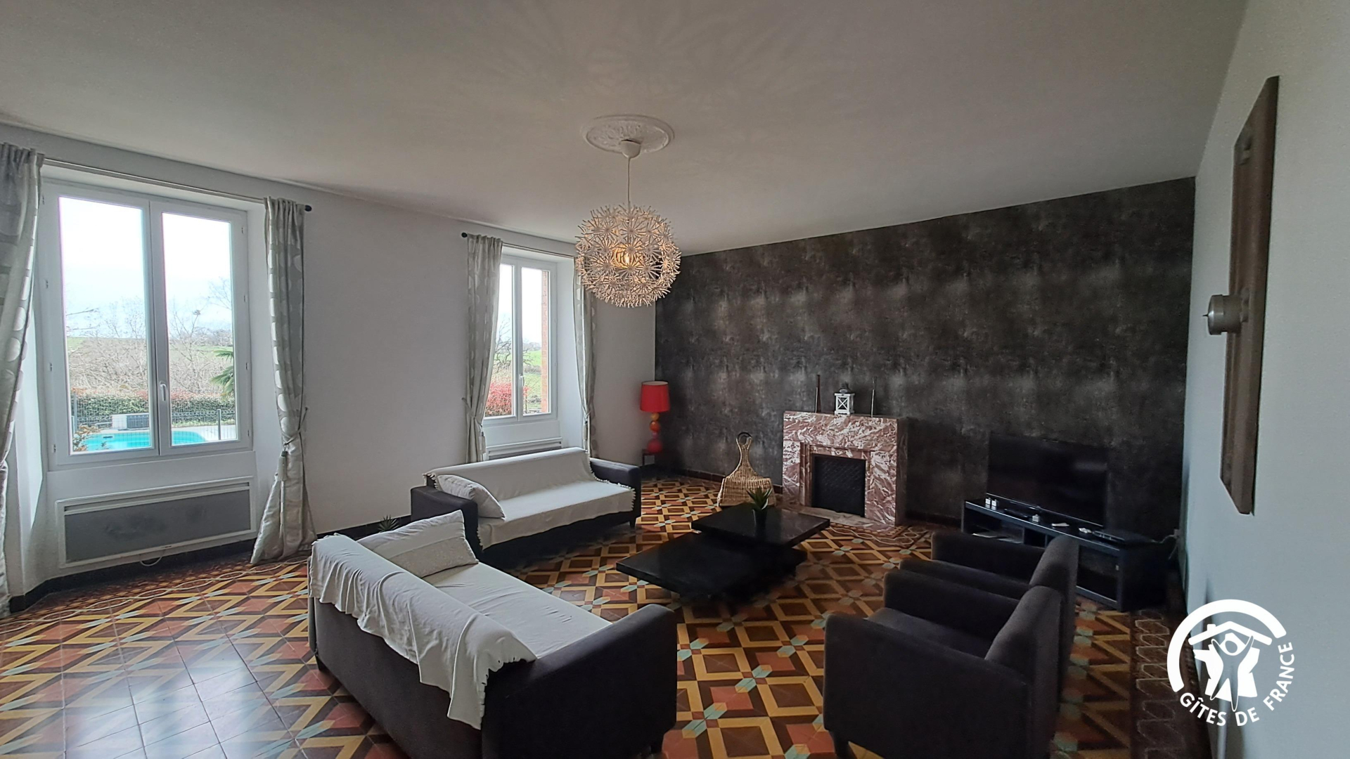 – Salon avec TV donnant sur la piscine