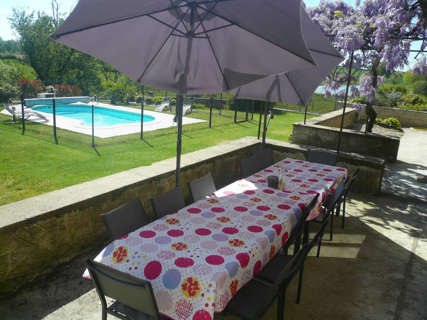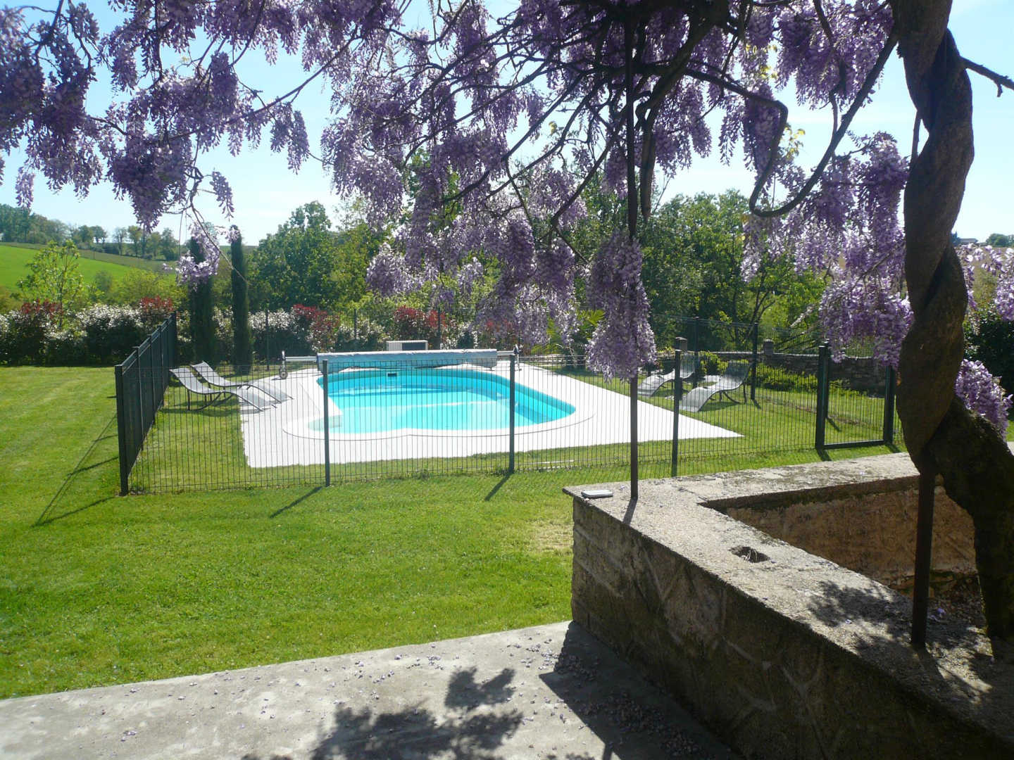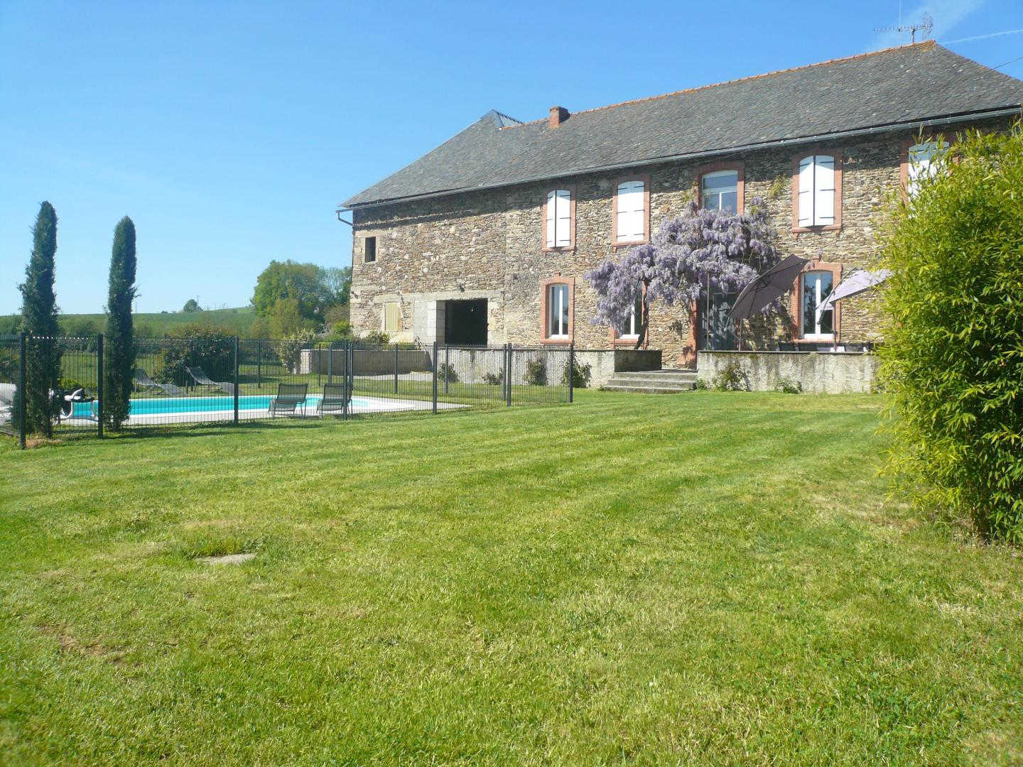 Vous pourrez flâner soit dans la cour intérieure dominée par son pigeonnier, soit dans le jardin privatif. Depuis le séjour, vous accédez à une terrasse avec salon de jardin qui fait face à la piscine. Une grande aire de jeux bétonnée se situe à coté du jardin pour le plaisir des plus petits et des plus grands avec un terrain de pétanque.