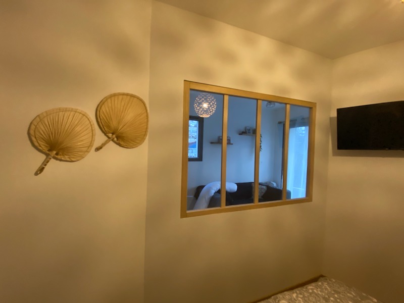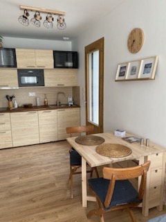 Appartement de 26 m² comprenant : Une cuisine équipée ouverte sur le salon/salle à manger, une chambre (1 lit en 140), une salle d’eau (douche) avec WC. La location bénéficie d’une terrasse et d’un jardin commun avec les propriétaires.