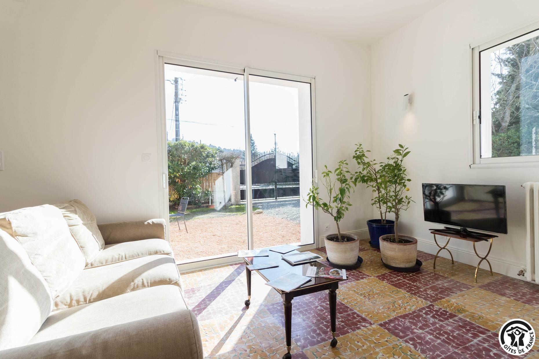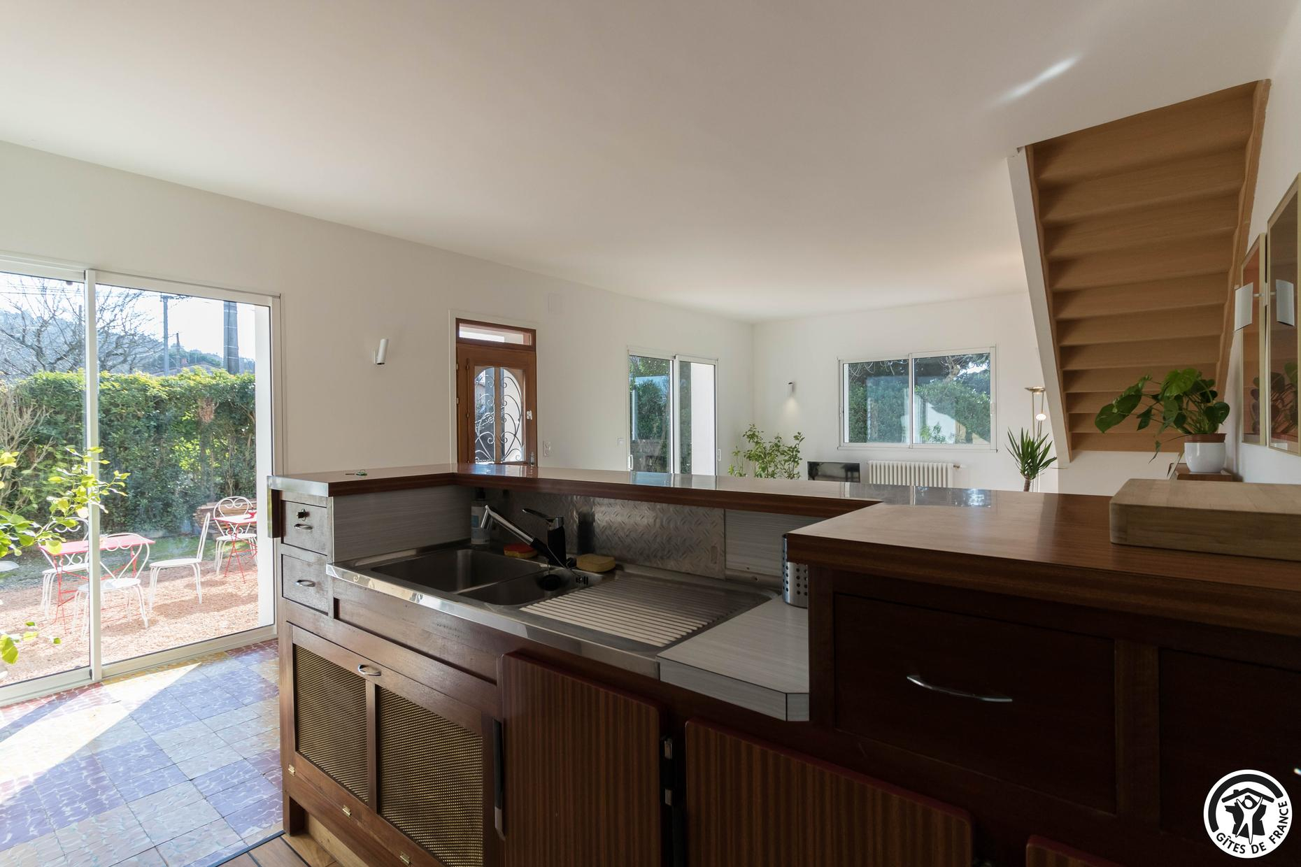 Terrasse en gravier avec salon de jardin, transats et barbecue. Jardin en commun avec les propriétaires. Les propriétaires vivent dans la partie mitoyenne à l’arrière de la maison.