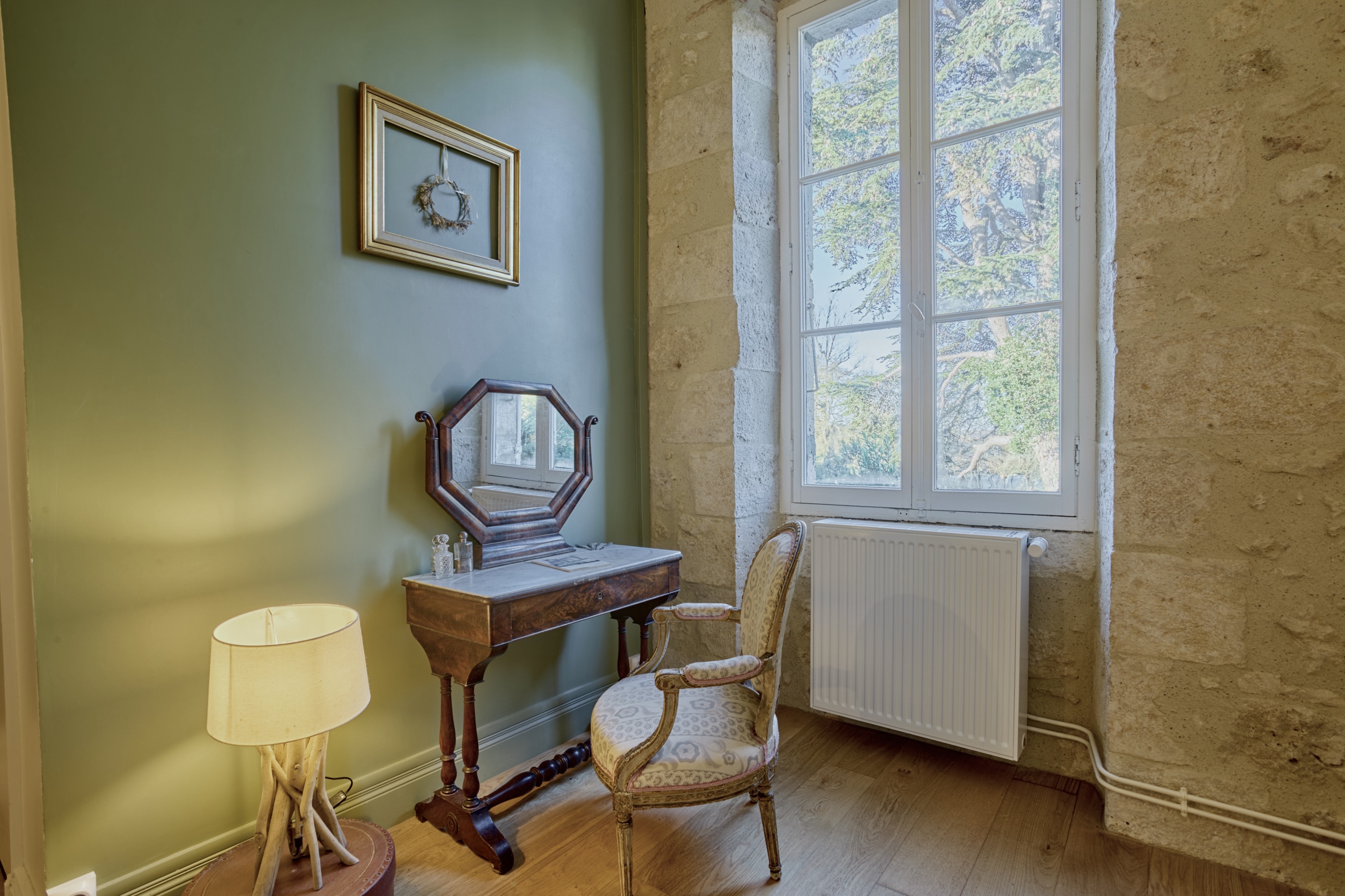 Côté jardin, la chambre Nature, aux teintes douces, vous offrira une vue sur le parc et ses différentes essences d’arbres. Vous disposerez d’une terrasse privée.