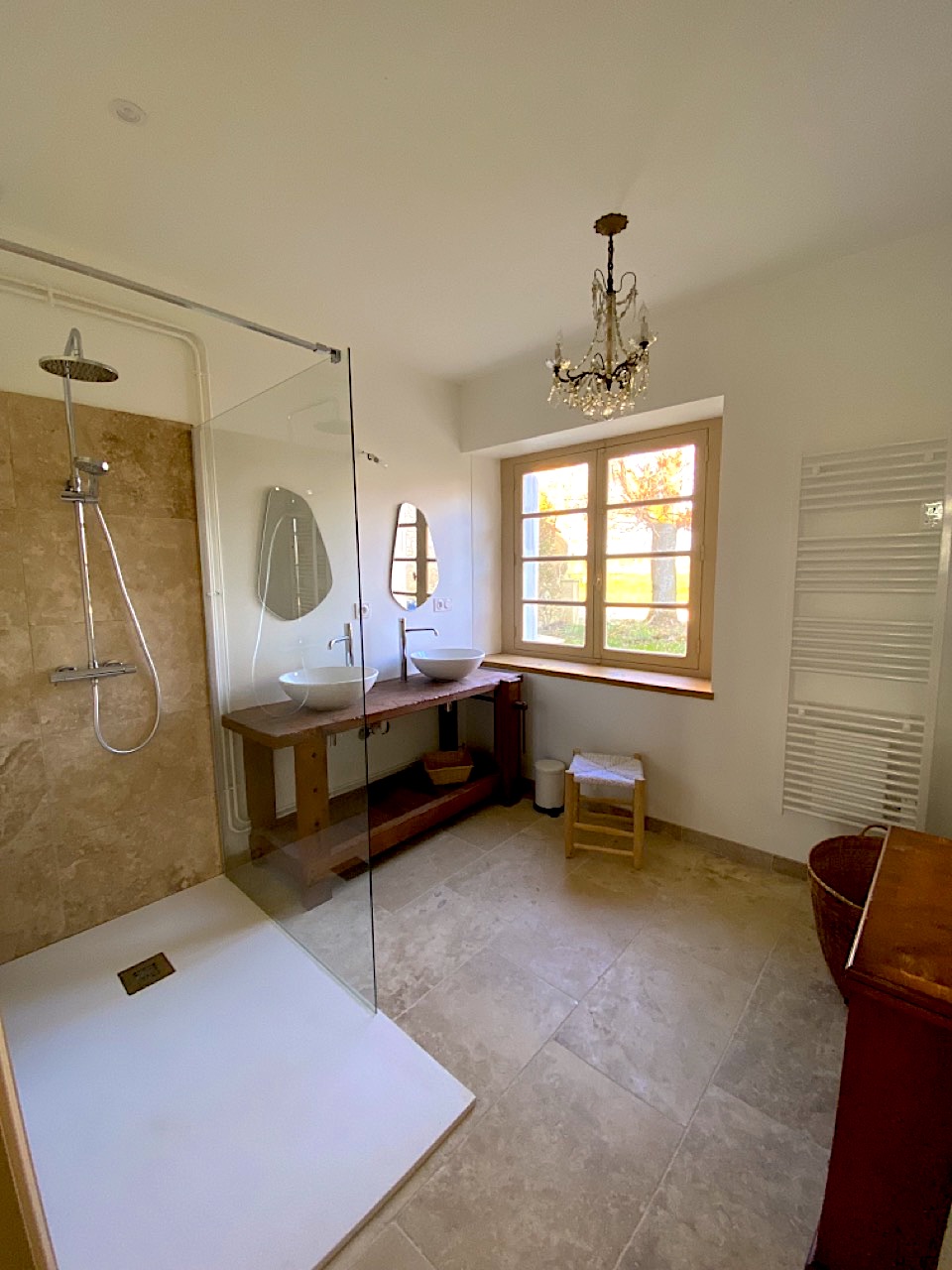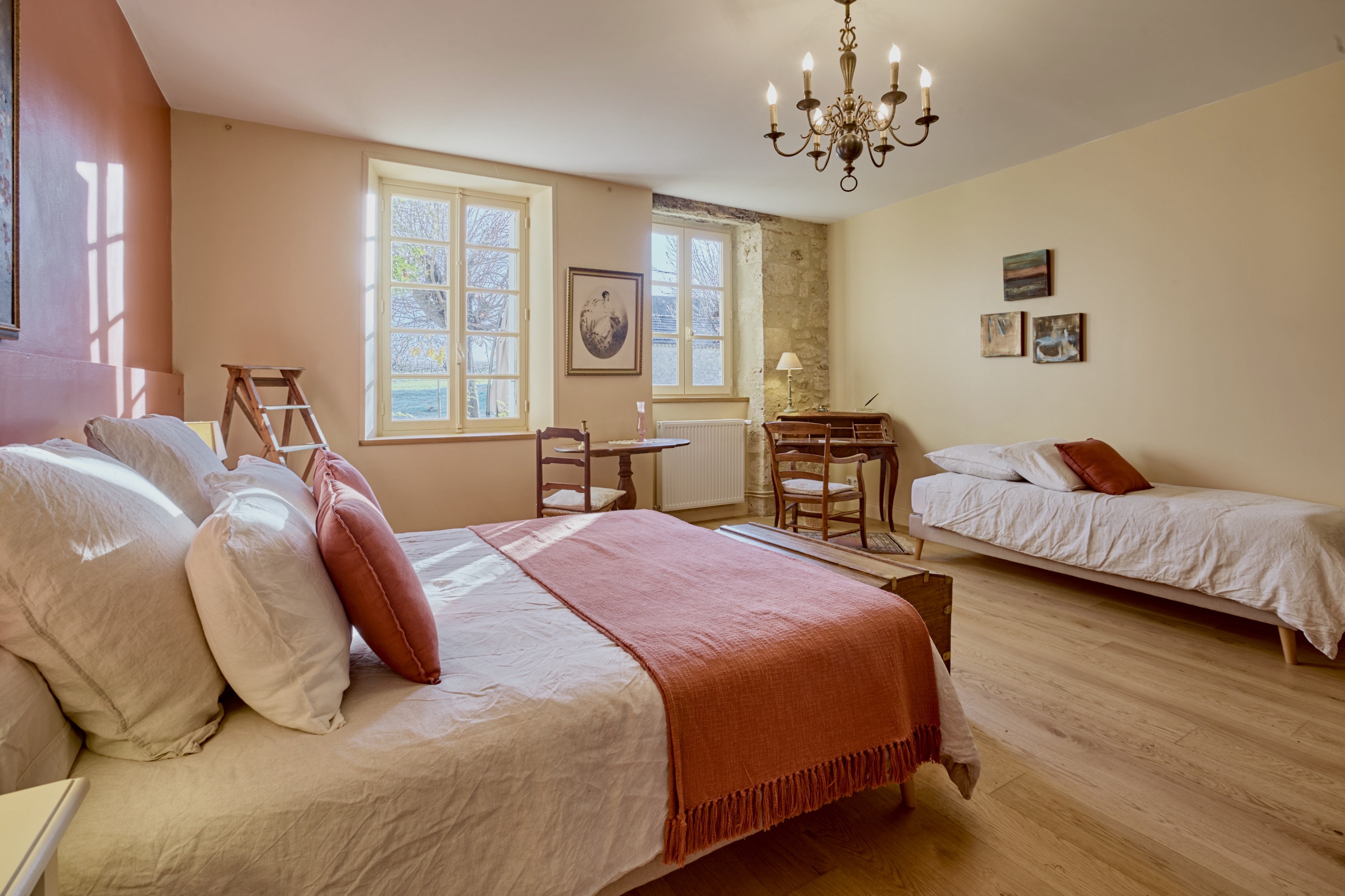 Chaque chambre possède 3 lits simples (2 en 90×200 et 1 en 90×190), modulable en un lit double et un simple selon la configuration que vous souhaitez. La literie est neuve, française et d’excellente qualité. Chaque chambre dispose d’une salle de bain et d’un WC séparé.