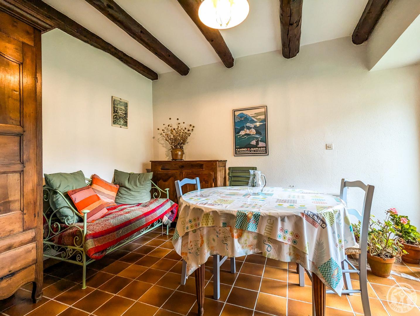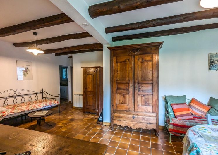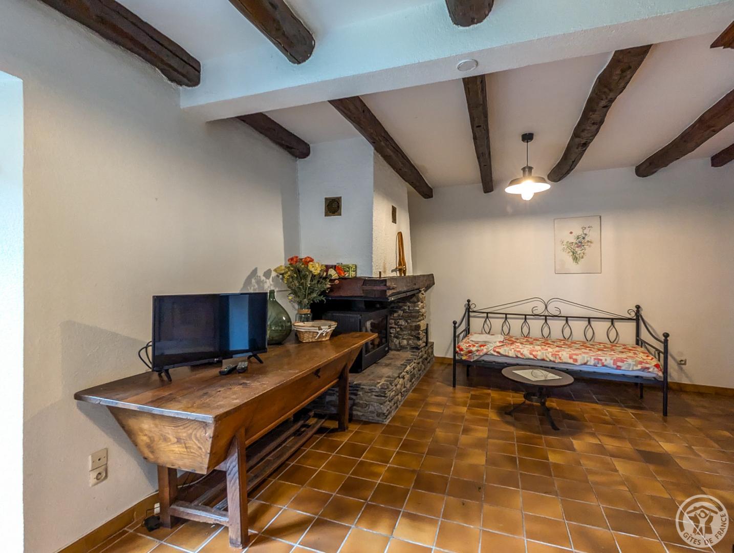 Gîte de plain-pied, mitoyen verticalement d’une location en été uniquement, et voisin du propriétaire : séjour avec espace repas et espace salon (lit banquette), cuisine séparée, chambre (1 lit double en 140*190cm), salle de bains, WC indépendant. Grand jardin ensoleillé presque toute la journée, avec une place pour la voiture en été. Stationnement public en bordure du jardin. Chauffage électrique et première flambée allumée à votre arrivée, par une cheminée insert. Internet par la WIFI du propriétaire. Attention, la fenêtre de la chambre donne sur le potager du propriétaire.
