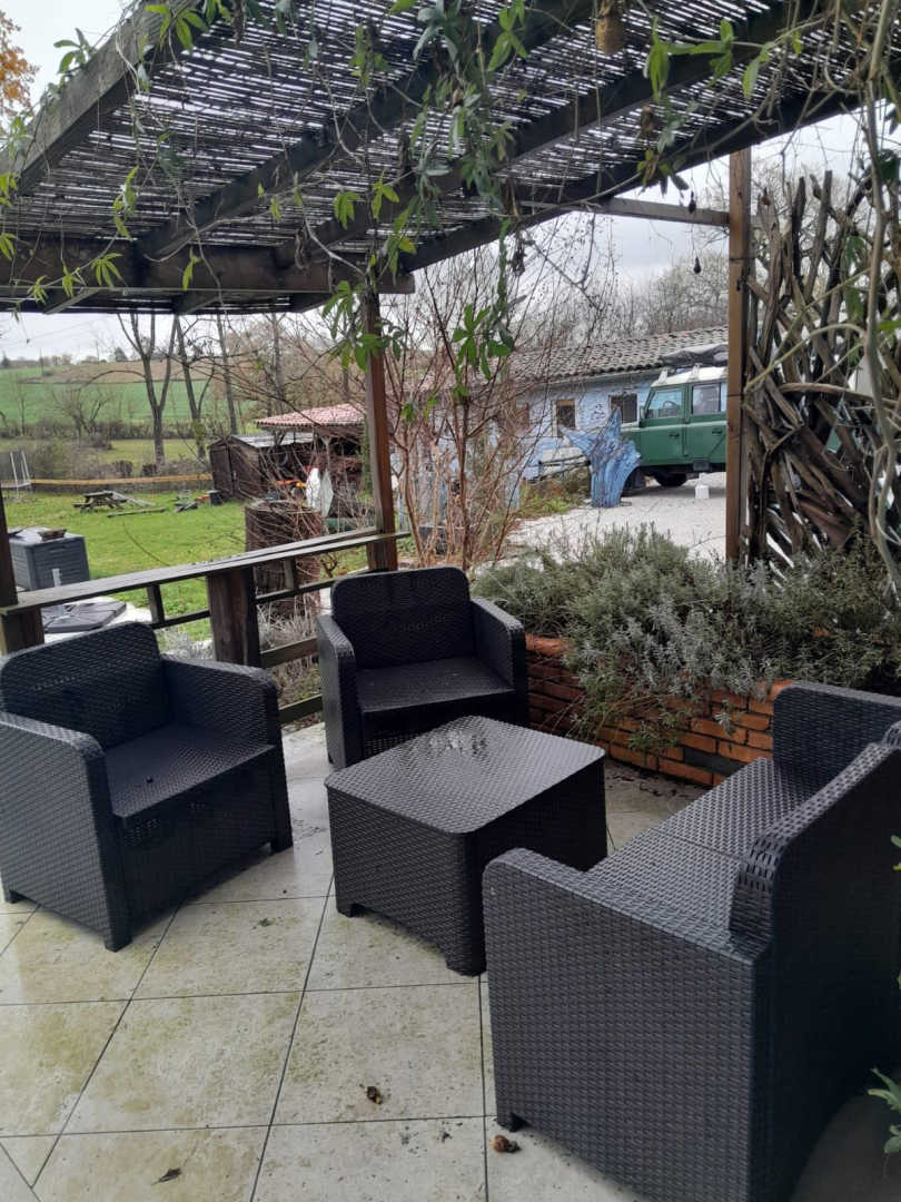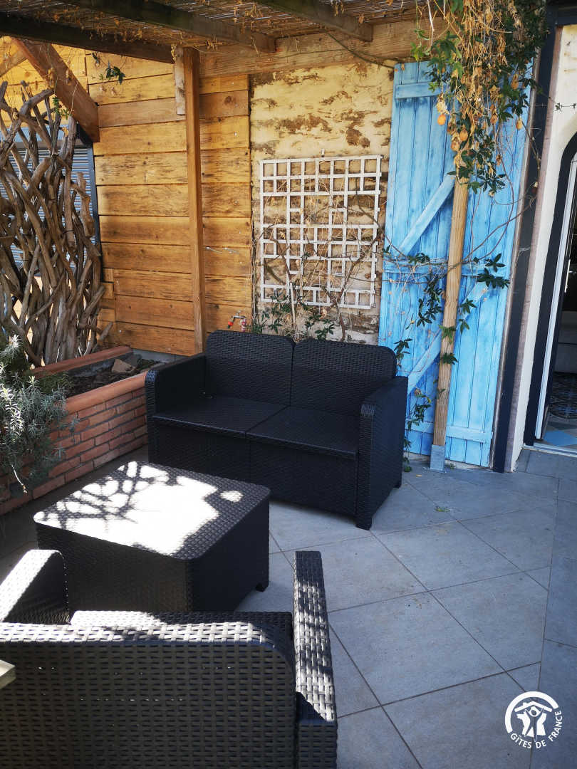 Terrasse avec salon de jardin, table à manger et barbecue/ plancha.