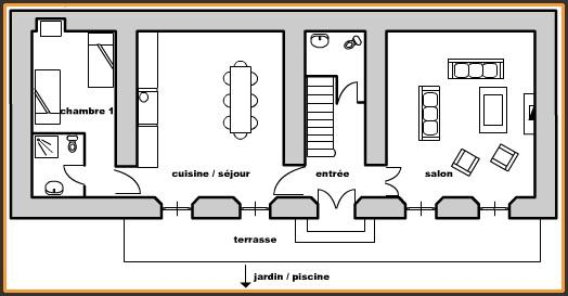 – Espace extérieur : jardin privatif clos, portique et terrasse. Piscine clôturée (5*10), commune avec les propriétaires et l’autre gîte.
