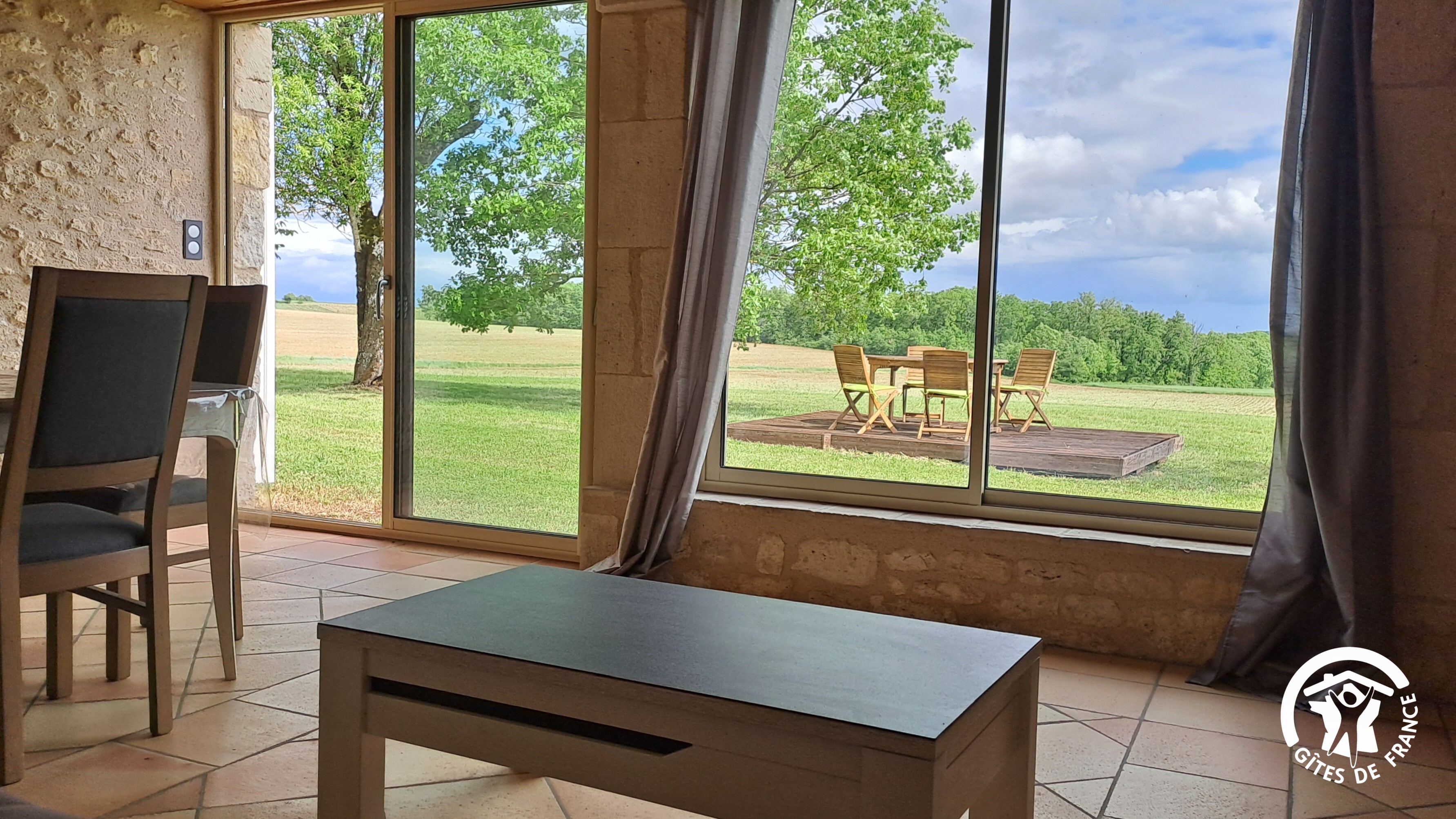 – Pièce à vivre avec salle à manger et salon avec TV. Grande baie vitrée qui s’ouvre pour accéder à la terrasse