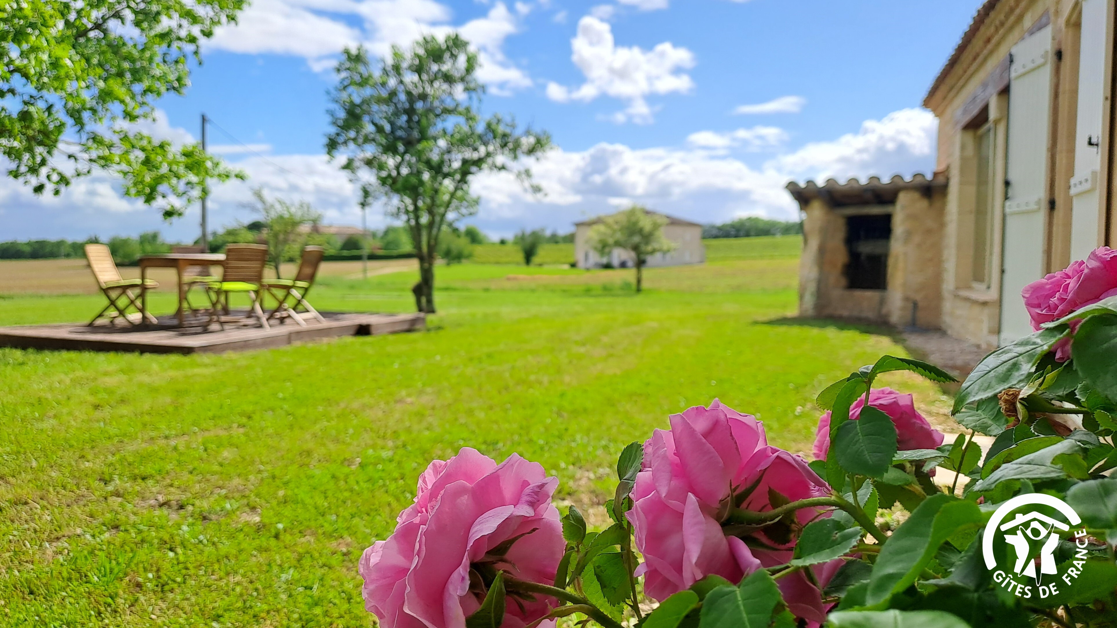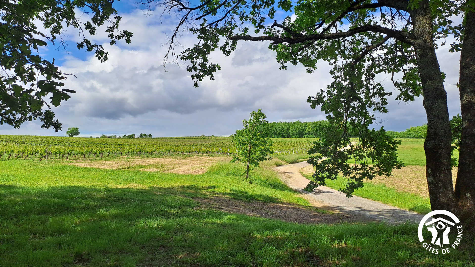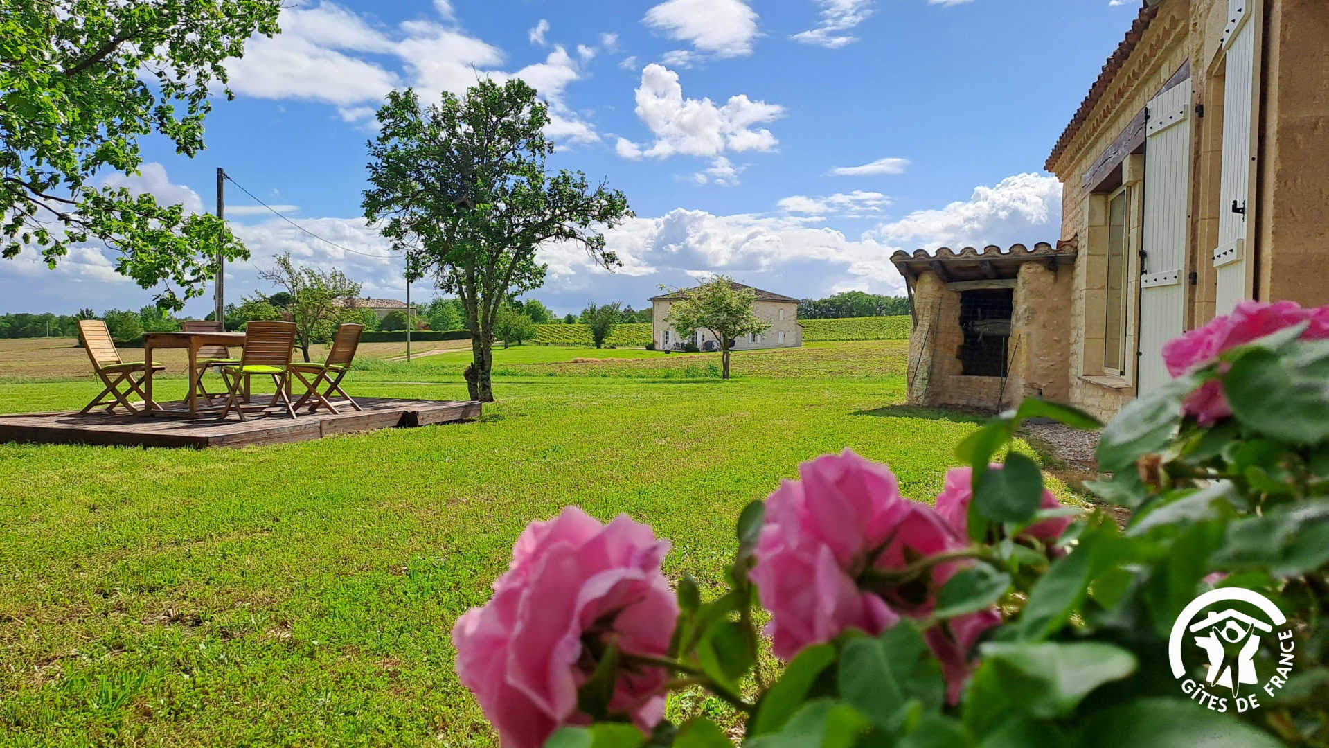 Grand jardin non clos tout autour de la maison avec un petit bois à l’arrière du gîte où vous pouvez profiter de l’ombre des arbres et des vignes à quelques mètres. Vous pouvez vous garer devant la maison.
