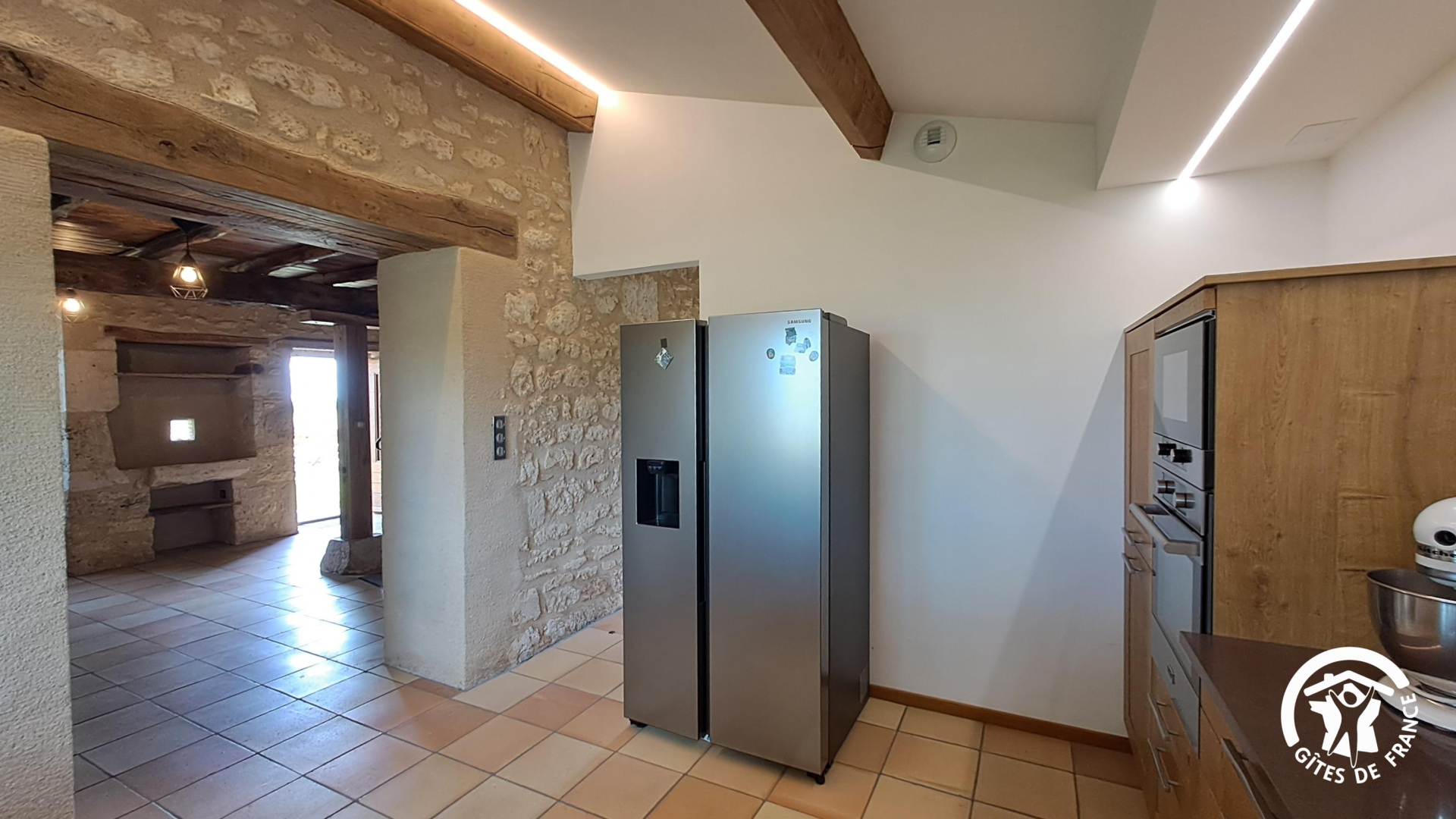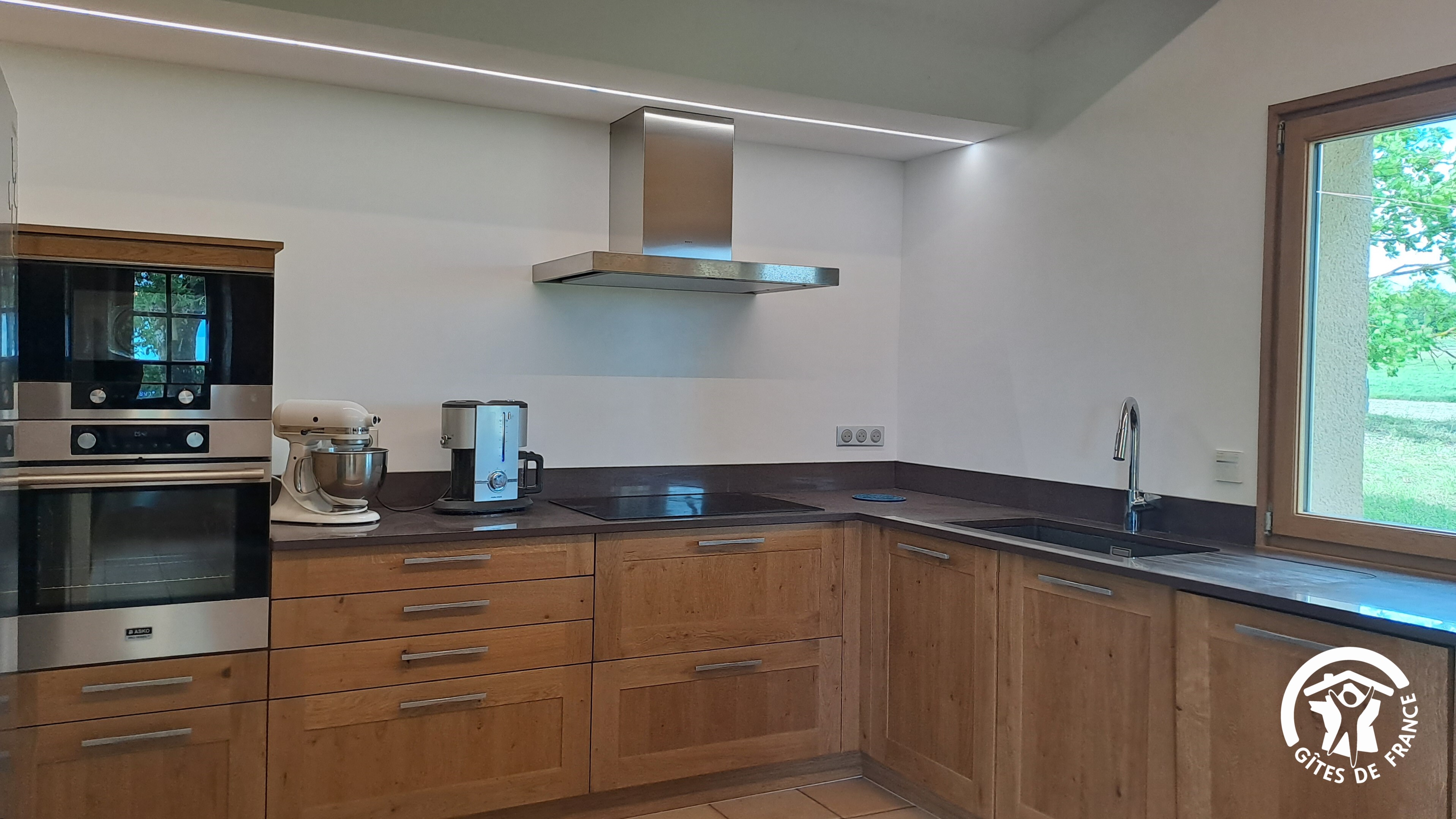 – Cuisine ouverte sur l’entrée avec grand frigo et congélateur, plaque de cuisson à induction, lave-vaisselle, four, robot pâtissier, cafetière Smeg© (café moulu), presse-agrume, mixeur plongeur, grille-pain.