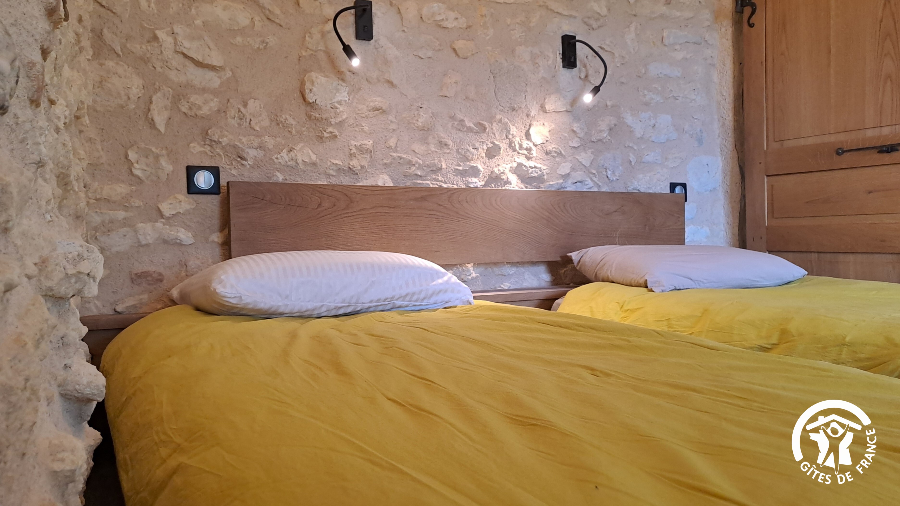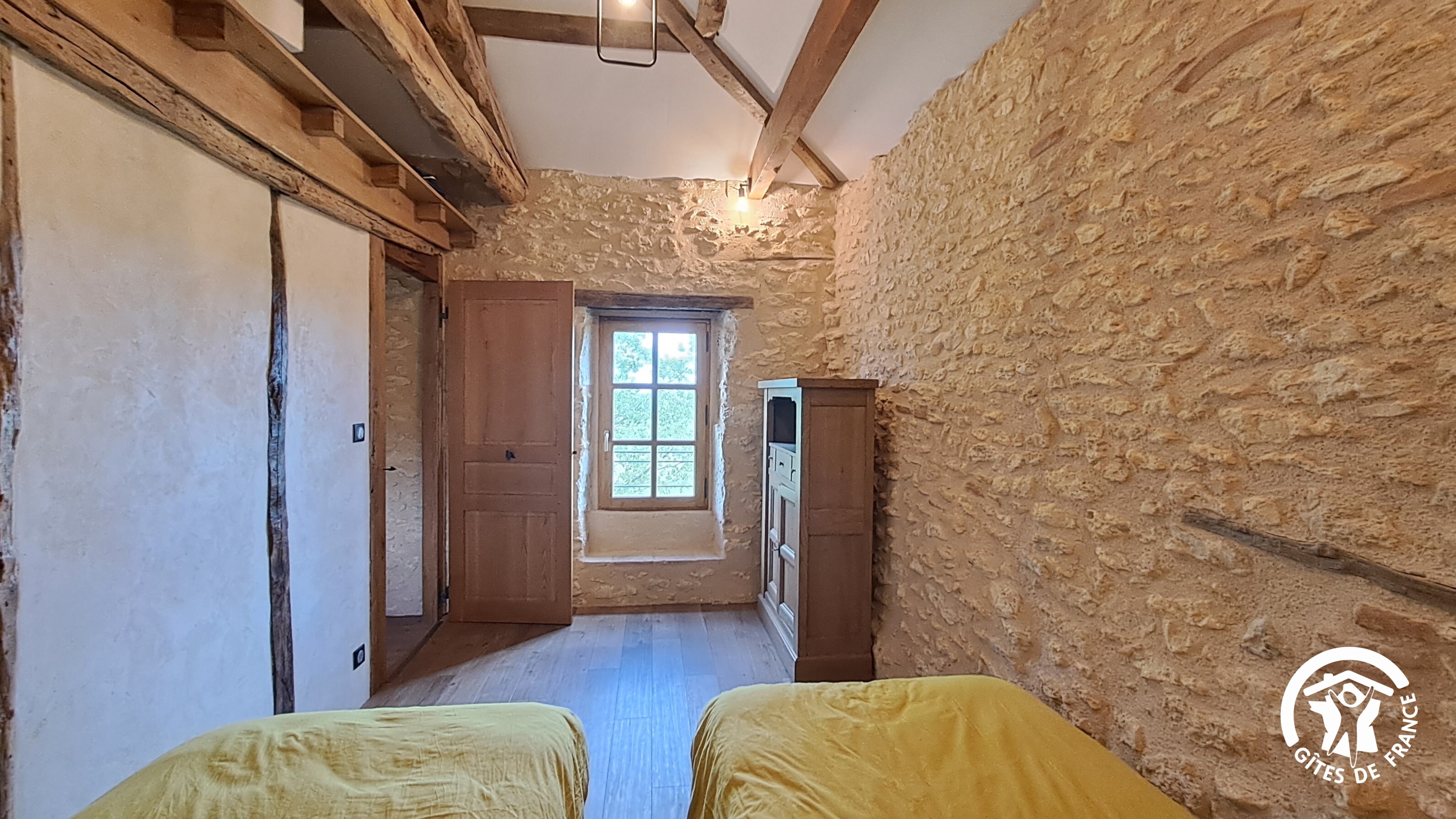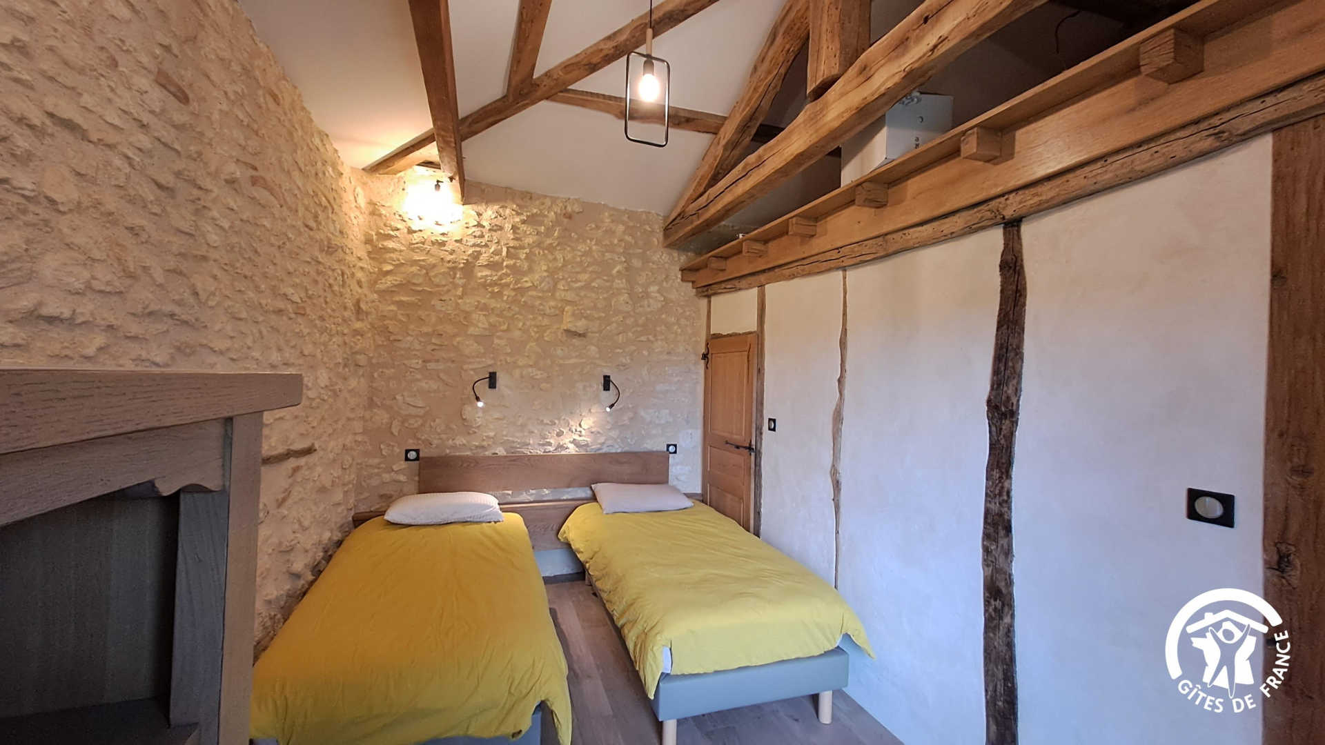 A l’étage se trouve les deux chambres. Une première avec un lit en 160x200cm et la seconde plus petite avec deux lits en 90x190cm qui peuvent se rapprocher.
