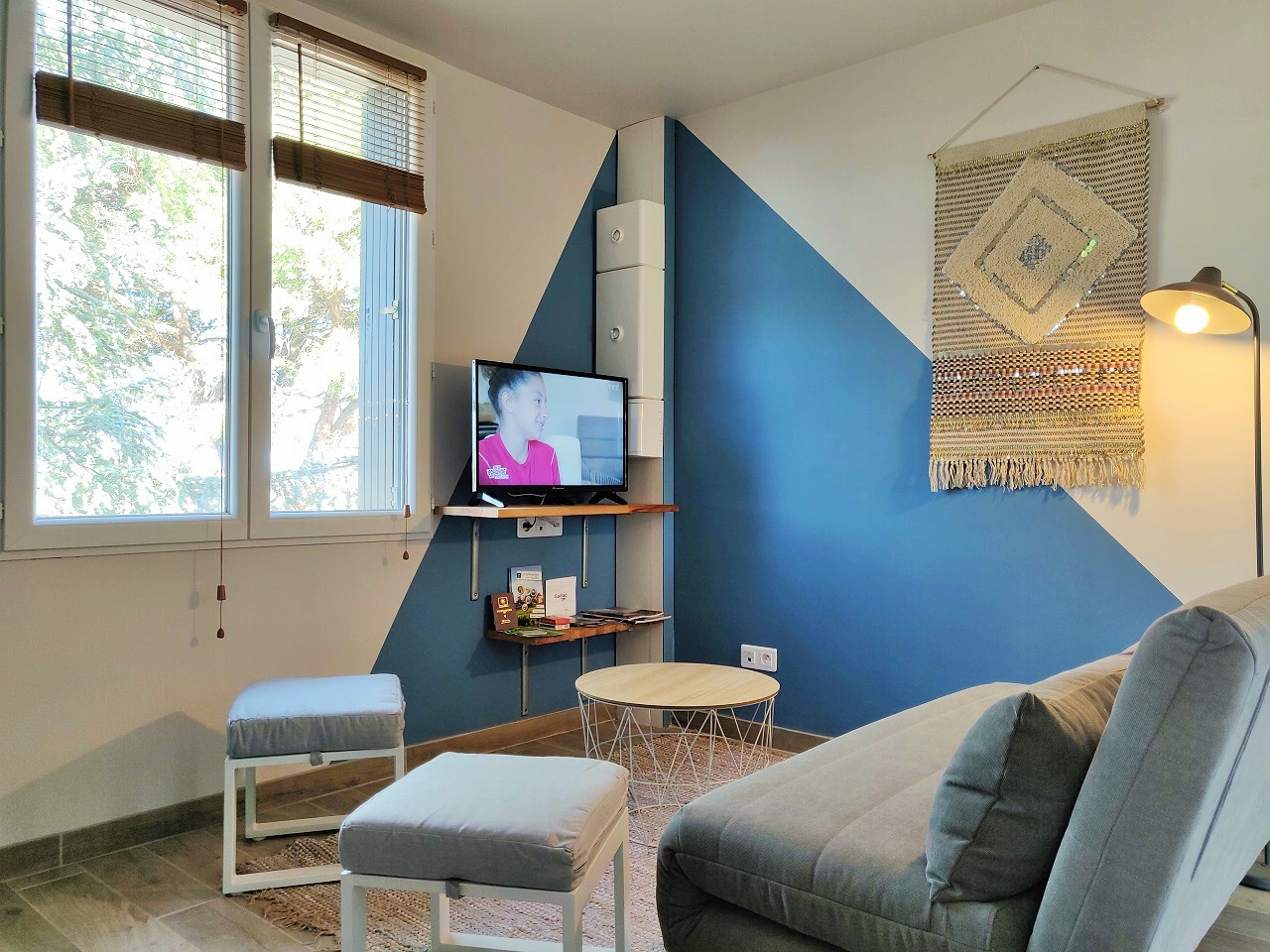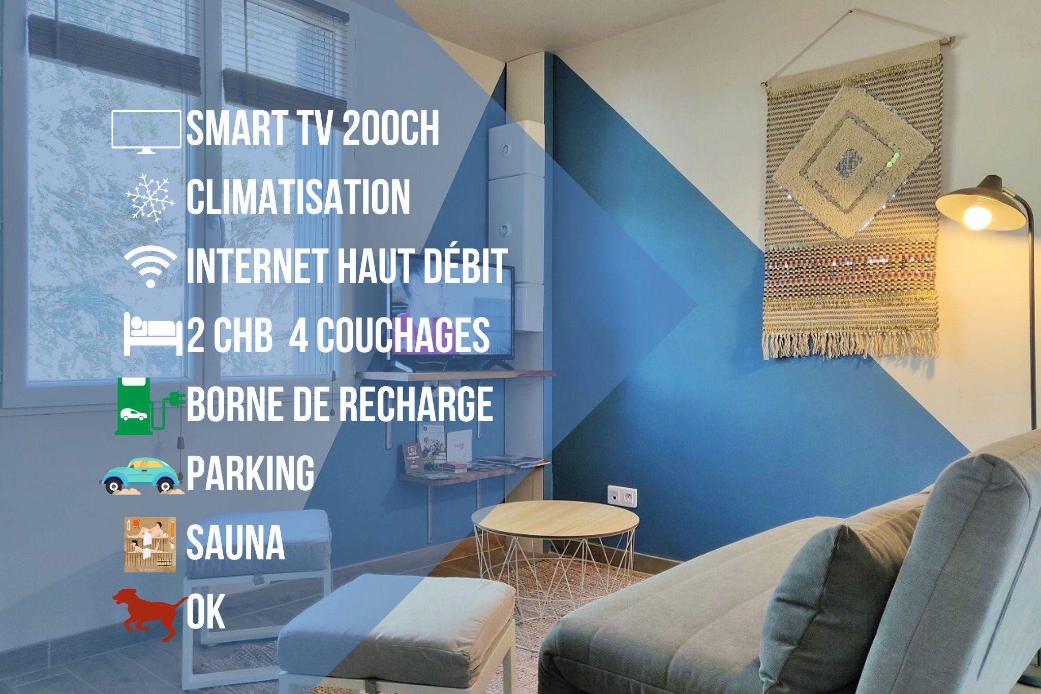 La porte couleur bleu rubis rappelant le vin « Syrah » vous donne accès au séjour-cuisine avec une décoration qui souligne l’appel à la détente. Un canapé pour vous invite à vous relaxer en partageant de merveilleux moments conviviaux où des équipements tels que la télévision connectée avec environ 200 chaines, YouTube et