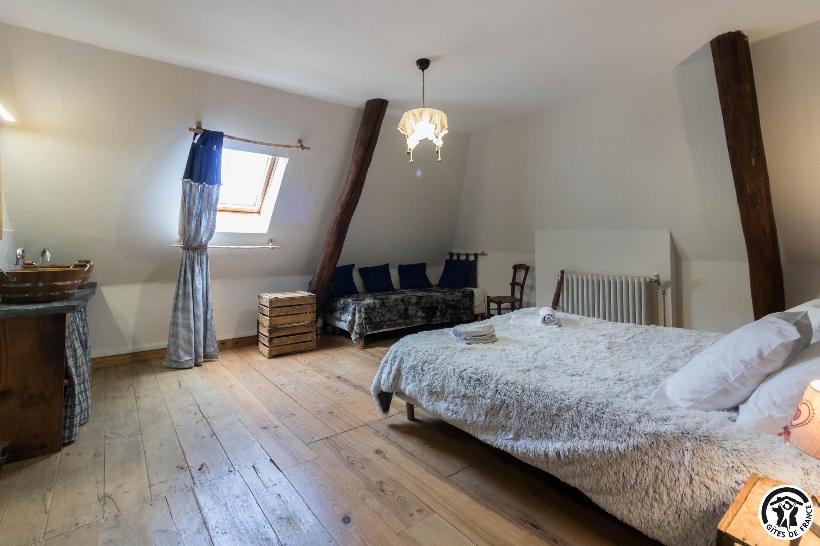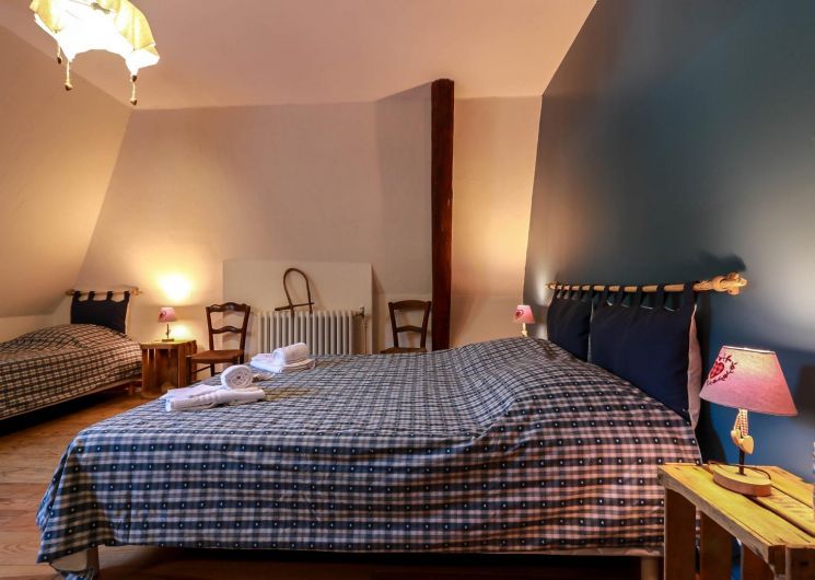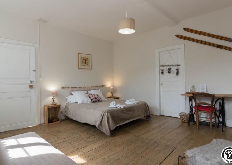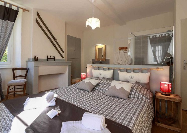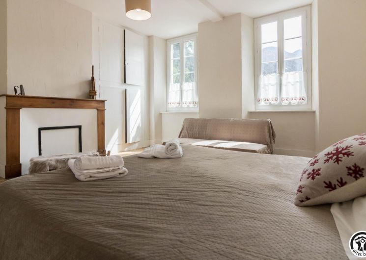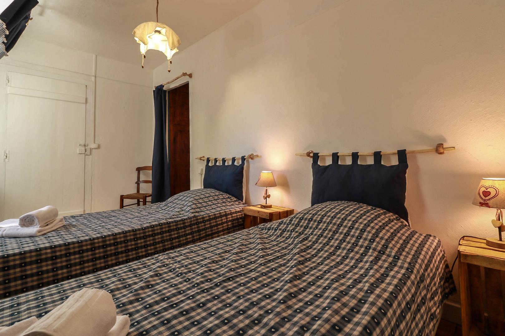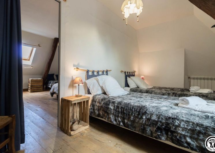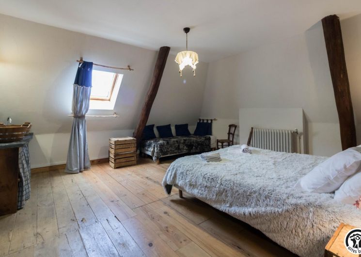 – au deuxième étage sous combles, une chambre familiale : « L’Aneto » avec, en enfilade, la chambre enfants (2 lits simples en 90cm), la chambre parents (1 lit double en 160cm, et une double vasque) et la douche et le WC séparés.