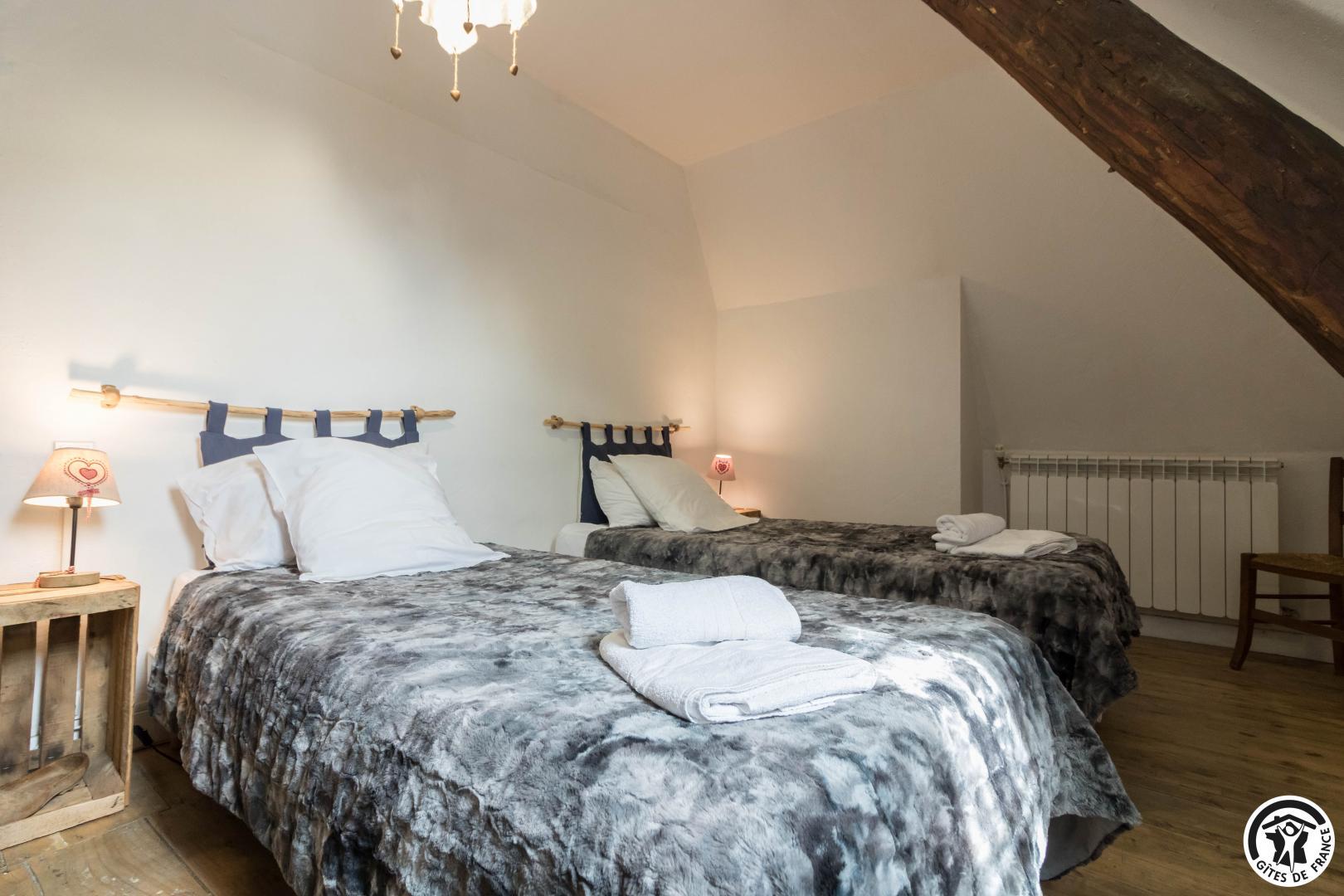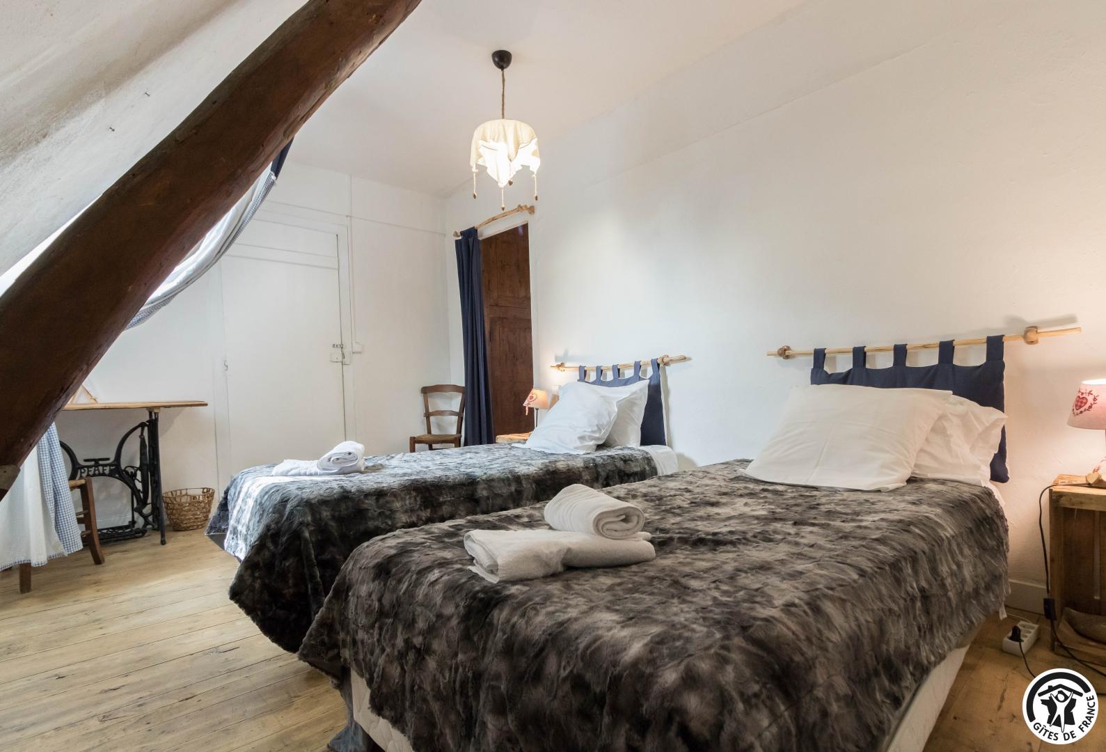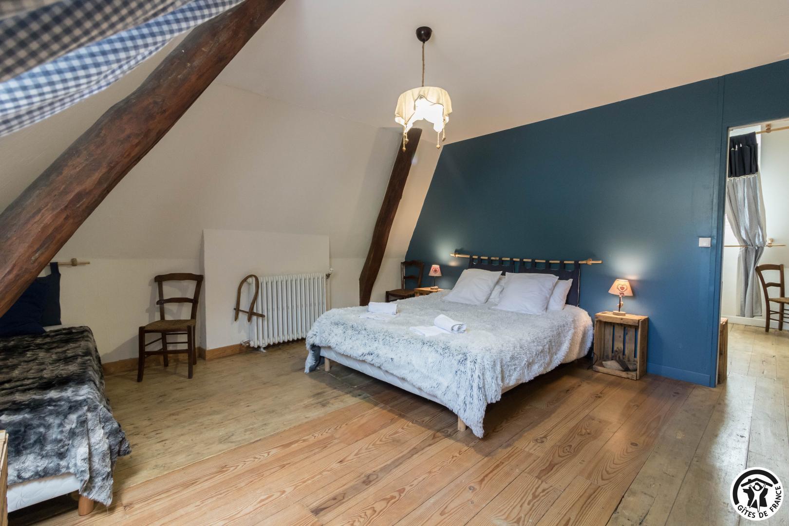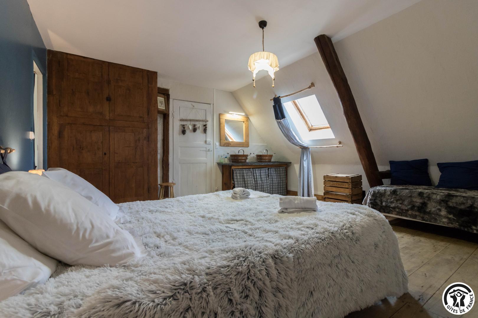 – au deuxième étage sous combles, une chambre familiale : « L’Aneto » avec, en enfilade, la chambre enfants (2 lits simples en 90cm), la chambre parents (1 lit double en 160cm, et une double vasque) et la douche et le WC séparés.