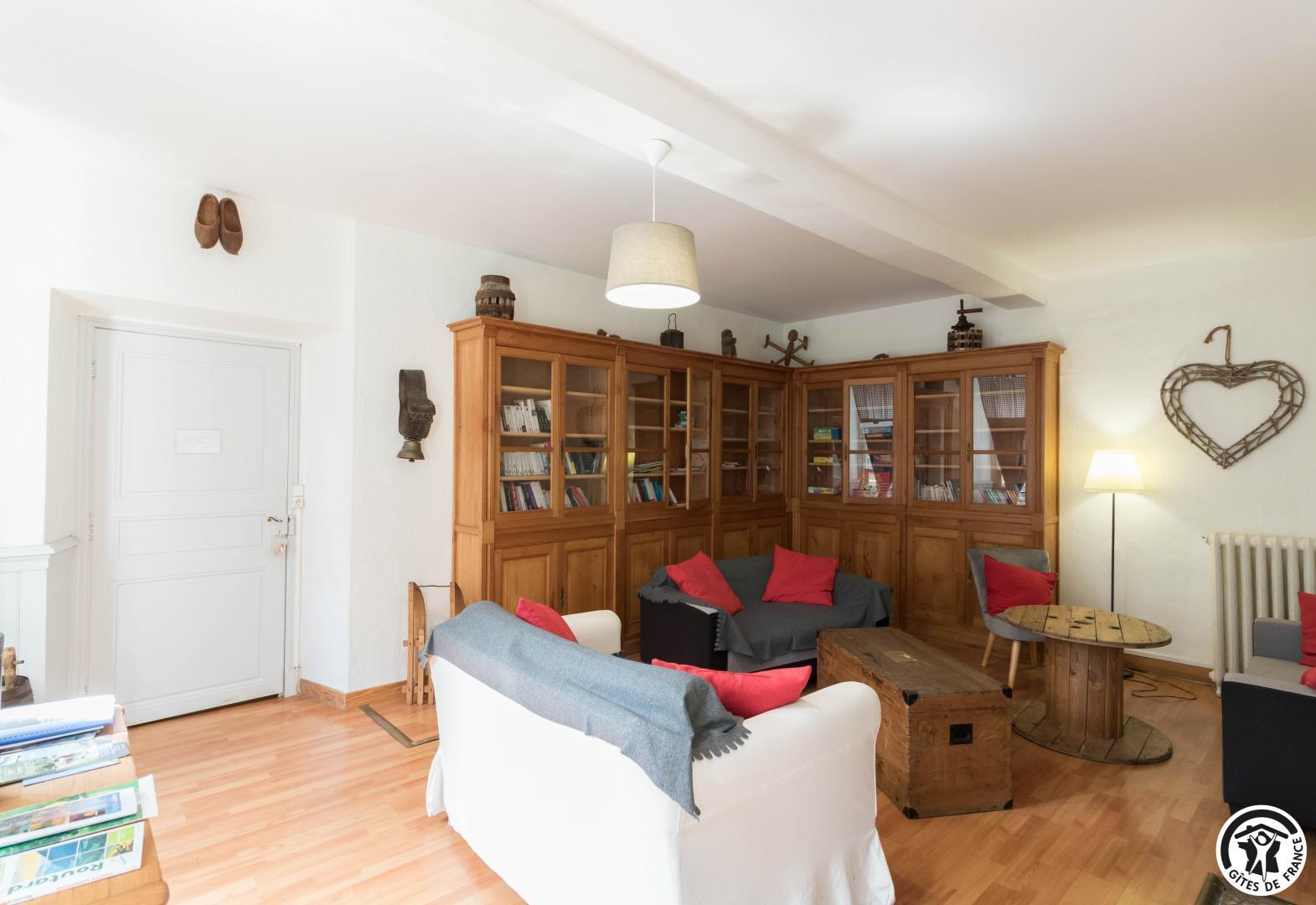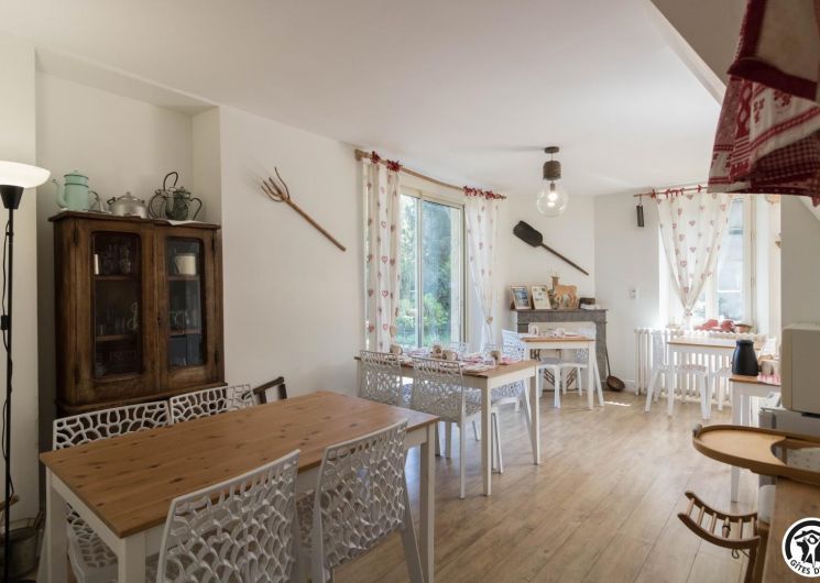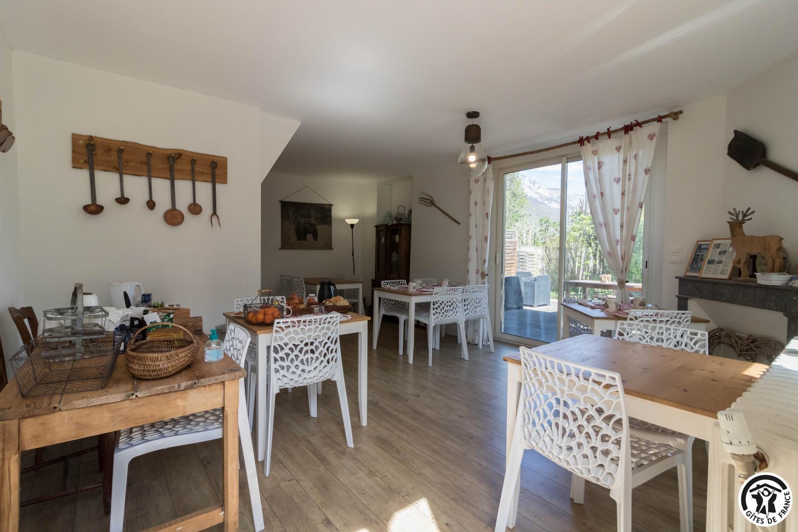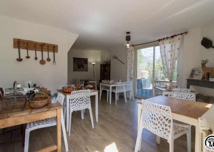 – au rez-de-chaussée : le hall d’entrée dessert d’une part la salle des petits-déjeuners qui ouvre sur la terrasse plein Sud, d’autre part un salon avec cheminée et télévision et un grand séjour où sont servis les repas en table d’hôtes. Un sauna intérieur est proposé pour le bien-être des hôtes.