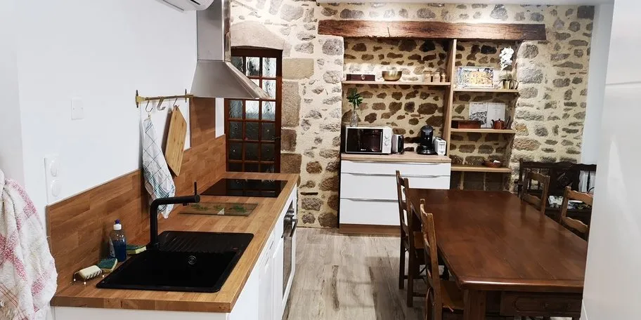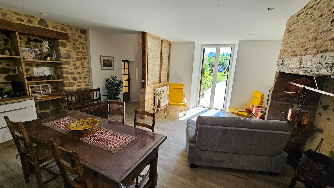Vous disposerez d’un espace intérieur de 100 m2 entièrement rénové en 2024. Dans la grande pièce de la cheminée médiévale et face au jardin, se situe le séjour salon cuisine.