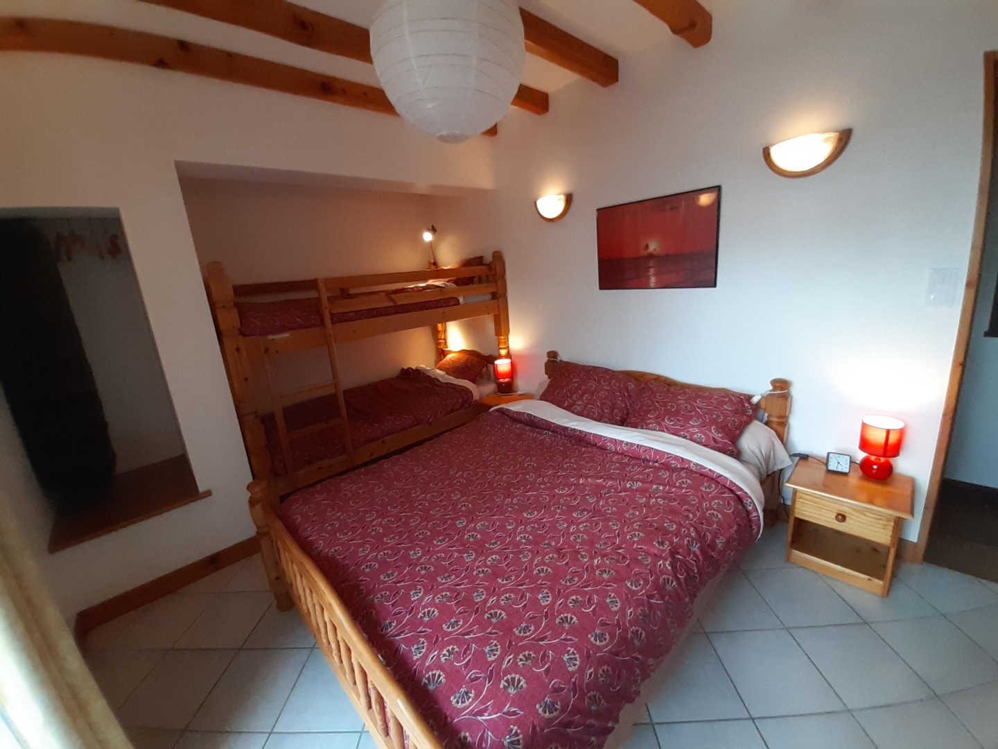 Au ½ étage supérieur : chambre avec salle d’eau privative (un lit double, deux lits simples superposés, accès loggia), salle d’eau, wc indépendant.