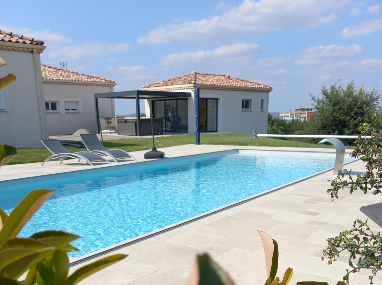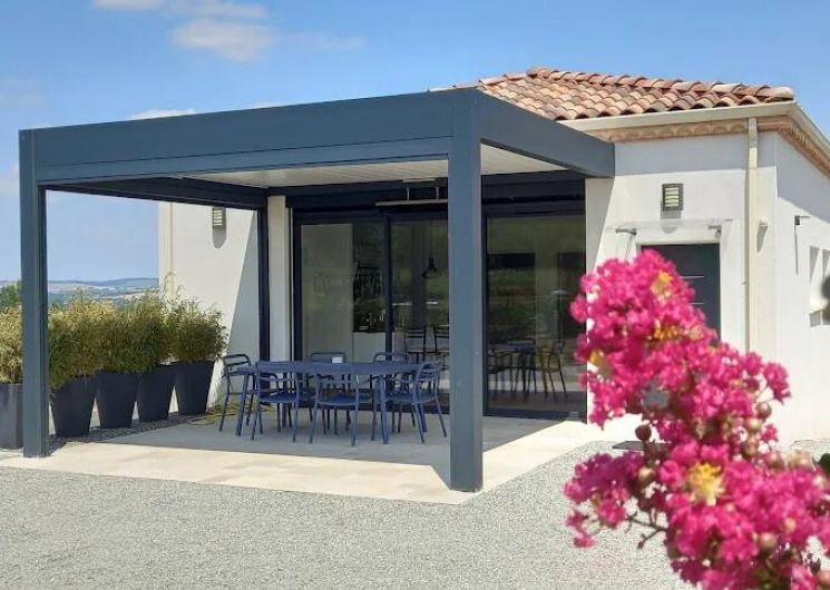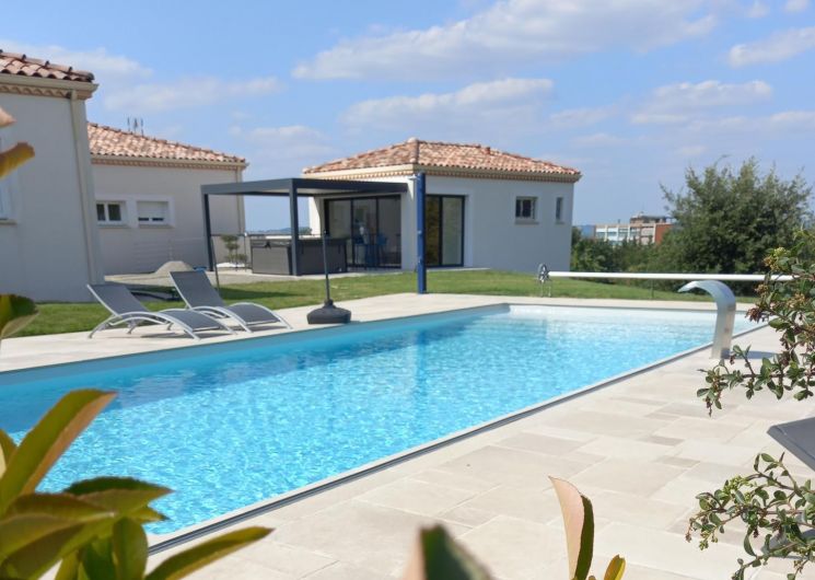 À l’extérieur, la terrasse couverte sous pergola bioclimatique offre un espace abrité pour les repas ou les temps de détente, en continuité directe avec le jardin partagé. La piscine chauffée (10 x 5 m, profondeur maximale 1,45 m), protégée par un dôme, est accessible en saison.