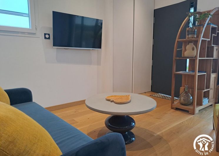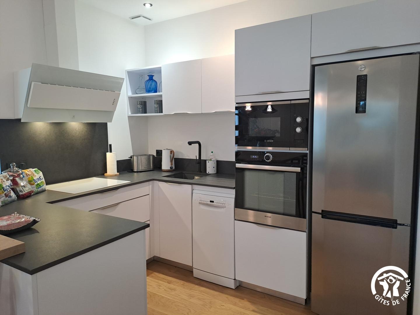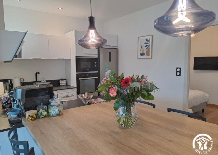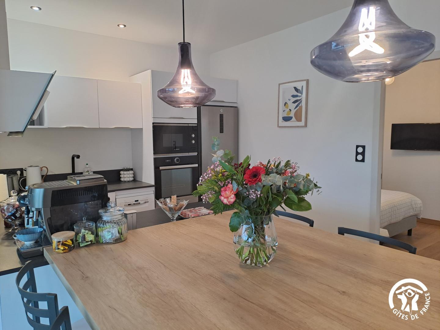 L’espace de vie central regroupe un salon avec télévision connectée, un coin repas et une cuisine ouverte entièrement équipée (avec cafetière Tassimo et à grains). L’ensemble est conçu pour un usage efficace au quotidien, avec des équipements récents. La domotique, discrète et intuitive, vient compléter l’ensemble pour faciliter la gestion du séjour.