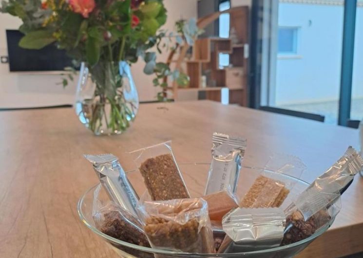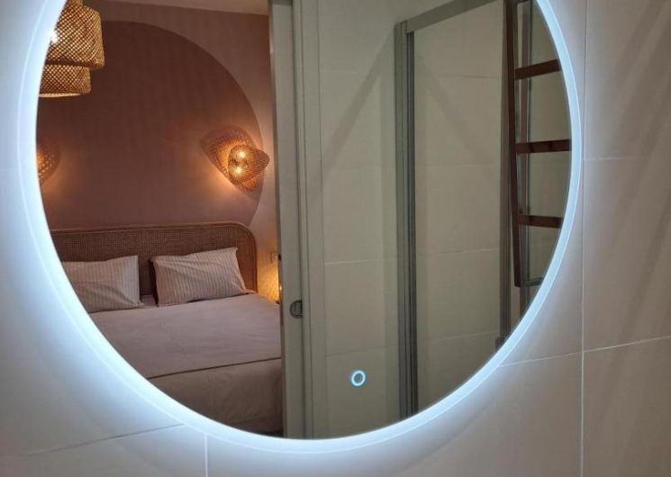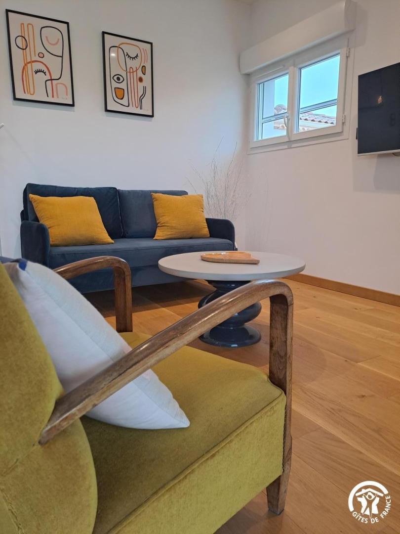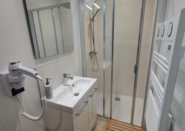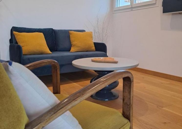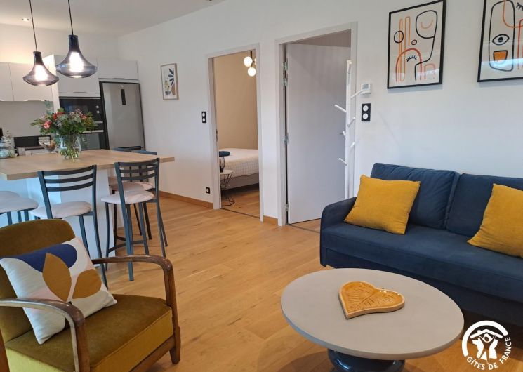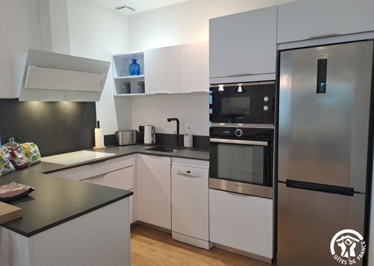 L’espace de vie central regroupe un salon avec télévision connectée, un coin repas et une cuisine ouverte entièrement équipée (avec cafetière Tassimo et à grains). L’ensemble est conçu pour un usage efficace au quotidien, avec des équipements récents. La domotique, discrète et intuitive, vient compléter l’ensemble pour faciliter la gestion du séjour.