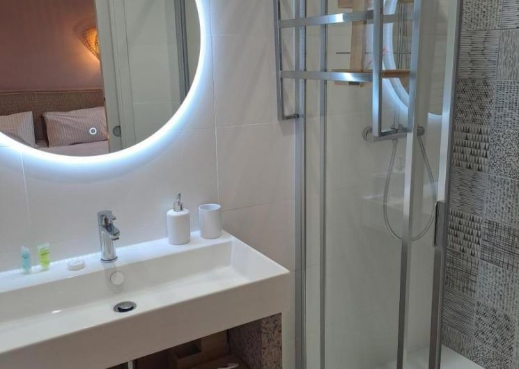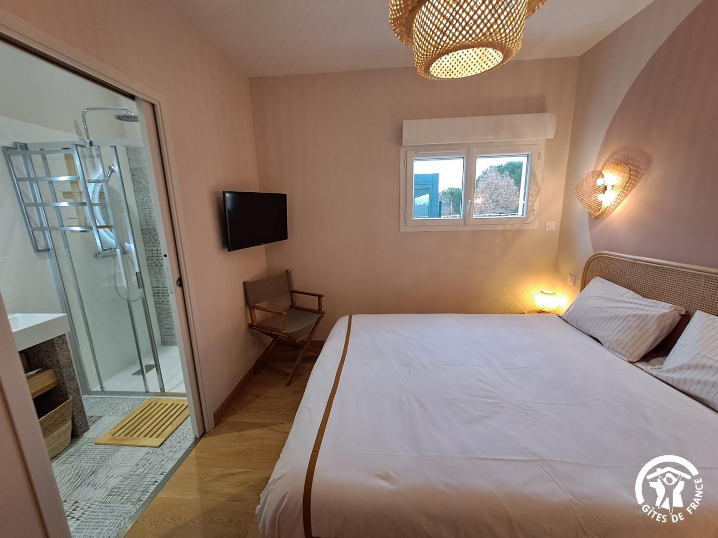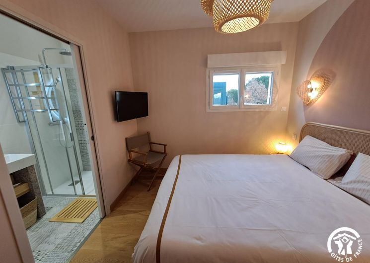 Le logement, entièrement de plain-pied, est configuré pour accueillir jusqu’à 4 personnes avec un niveau d’équipement apprécié sur ce type de capacité. Il se compose de deux chambres distinctes, chacune disposant de sa propre salle d’eau et de ses toilettes. Cette organisation permet une utilisation fluide du logement, sans contrainte de partage, et convient aussi bien à deux couples qu’à une famille.