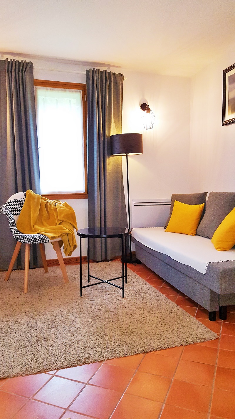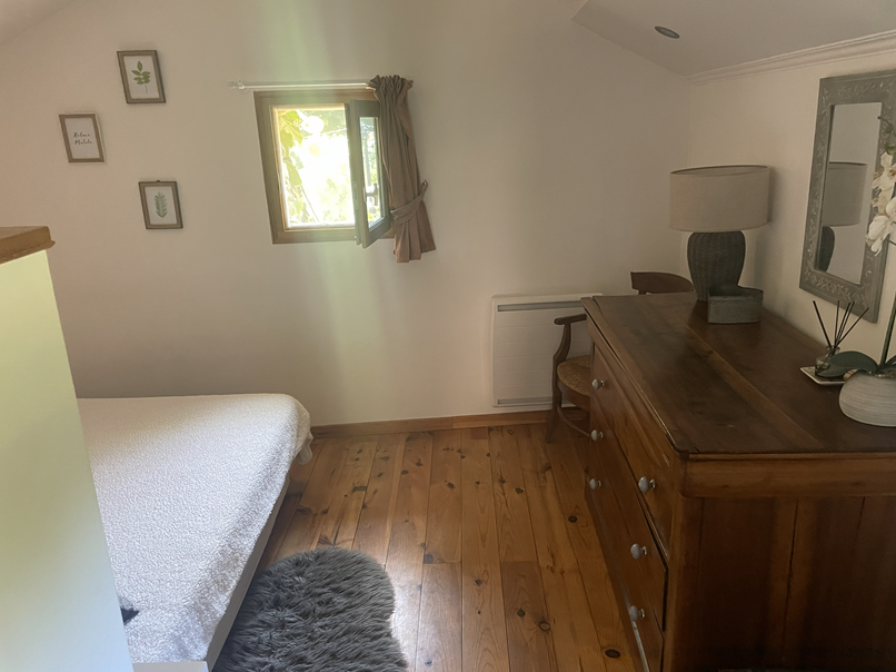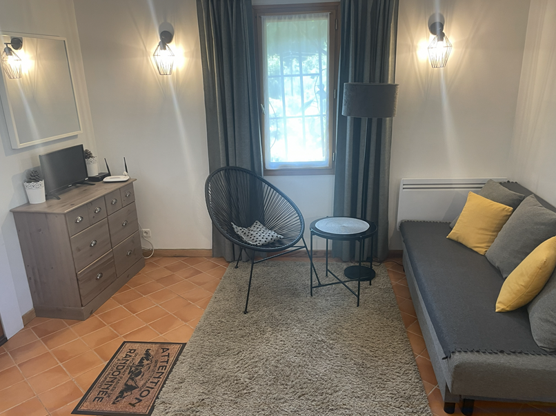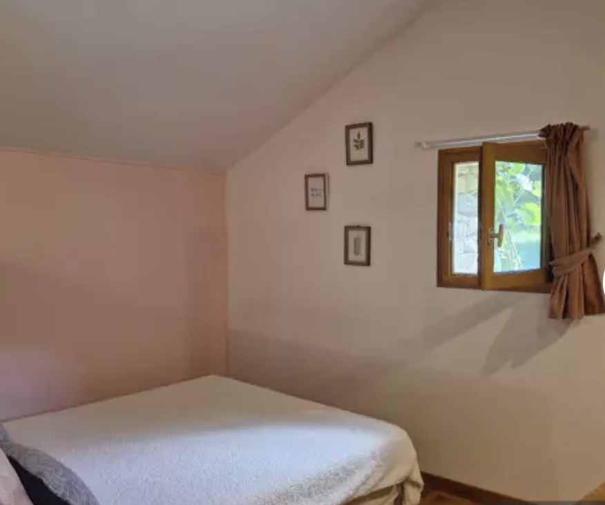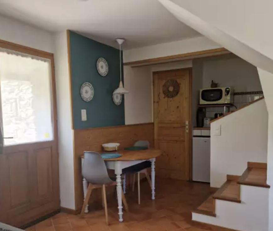 Gîte de 40m², idéal pour couple et randonneurs, comprenant au RDC séjour, coin repas et coin cuisine, et au 1er étage chambre et salle d’eau.