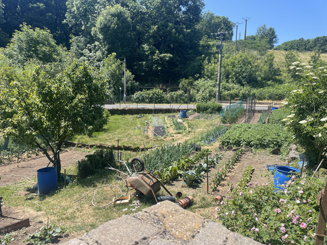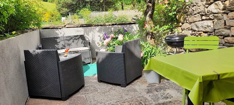 Terrasse privative d’environ 20m² avec salon de jardin et barbecue. Jardinet attenant avec légumes à disposition.