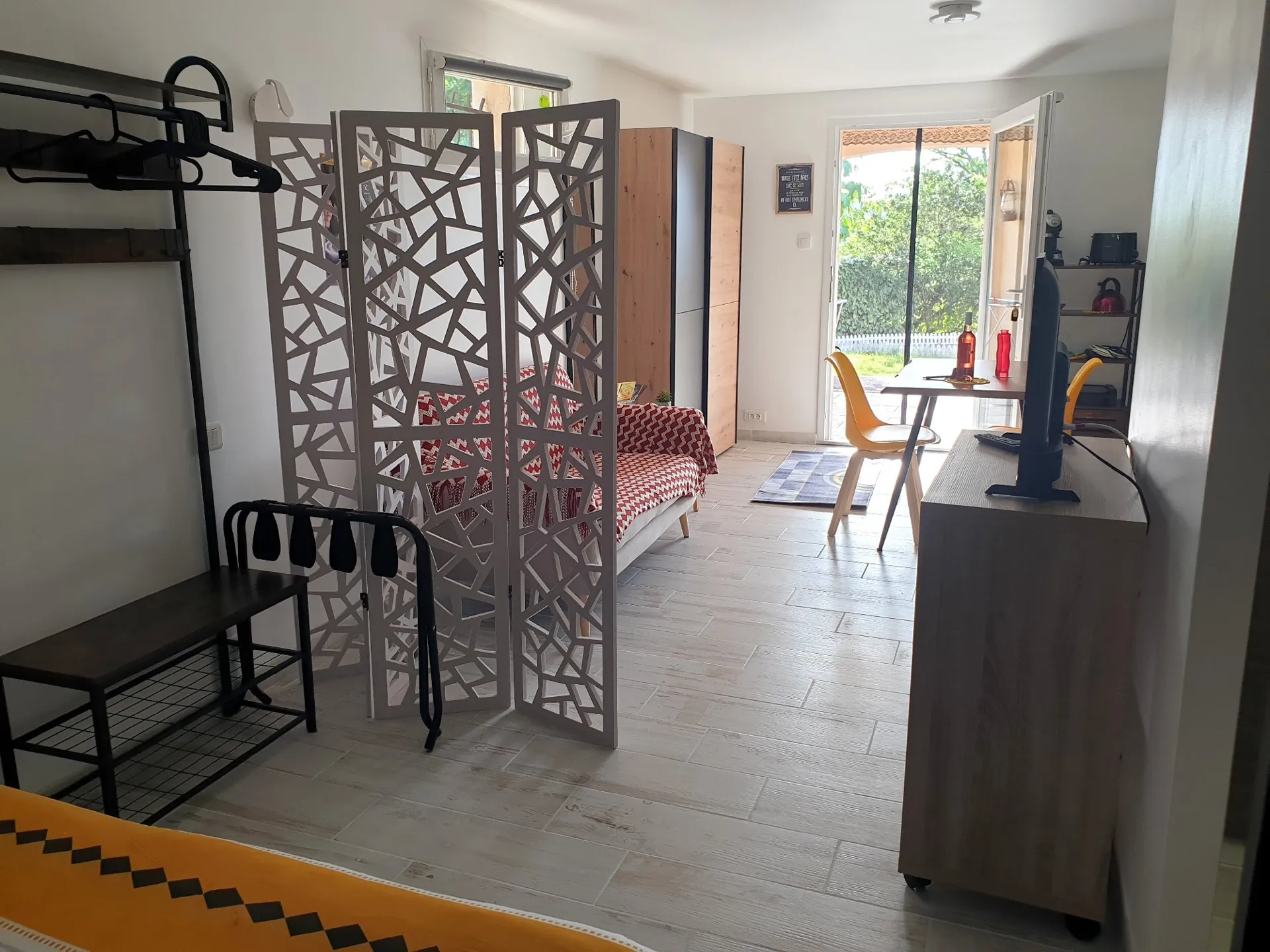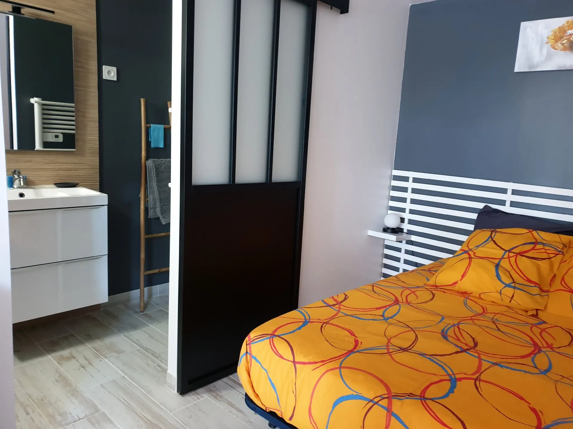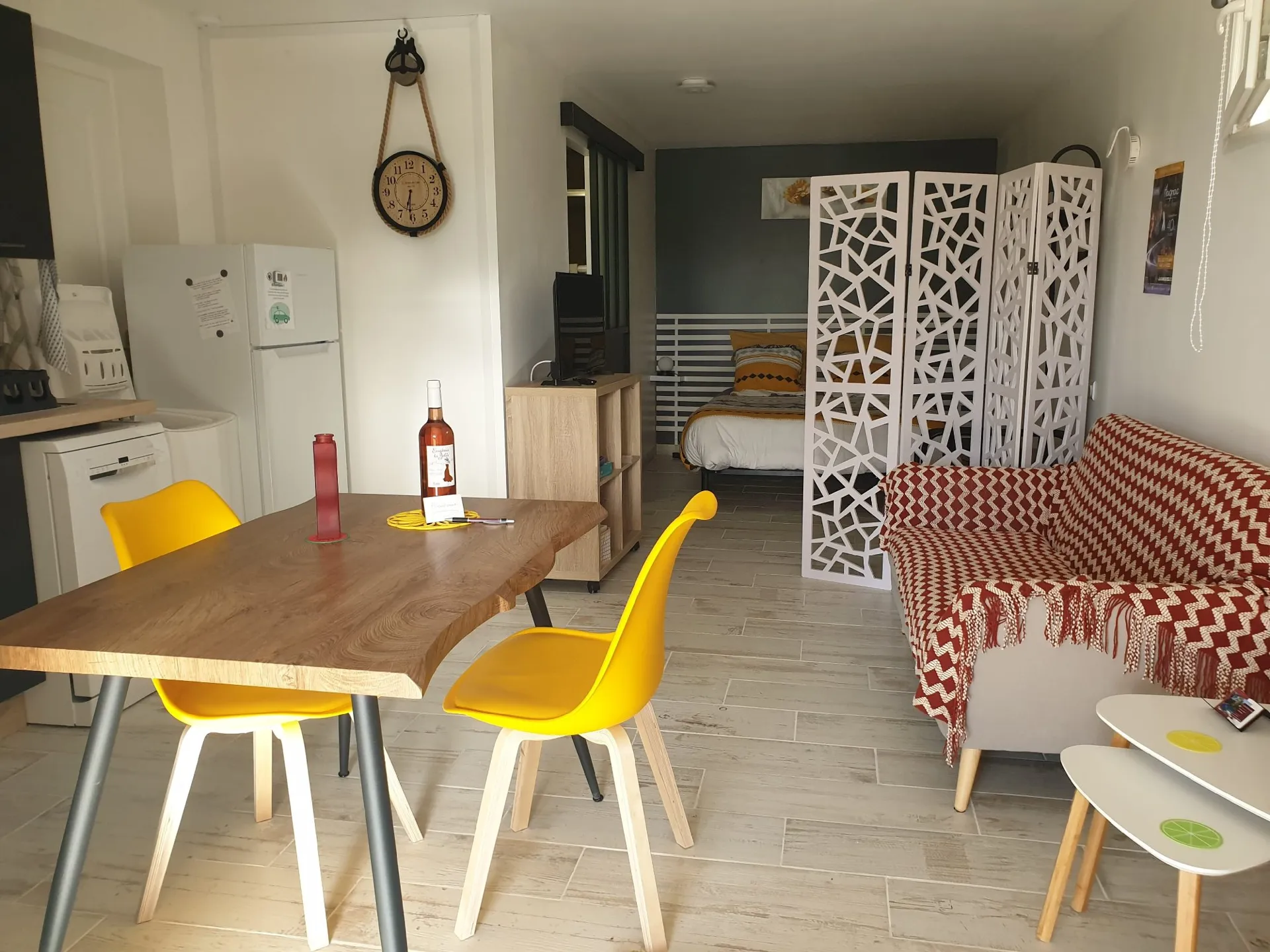 Gîte/studio indépendant, de plain-pied, au-rez-de-chaussée de notre maison, à la sortie du village. Studio (canapé, télévision) / coin-cuisine (lave-vaisselle, lave-linge) / coin-nuit (1 lit 140), accès internet/wifi, salle d’eau, chauffage électrique en saison froide, ventilateur en saison chaude, terrasse privée couverte, terrain privé, salon de jardin, plancha, 2 transats, parking privé, ping-pong, pétanque. Piscine extérieure chauffée partagée avec les propriétaires.