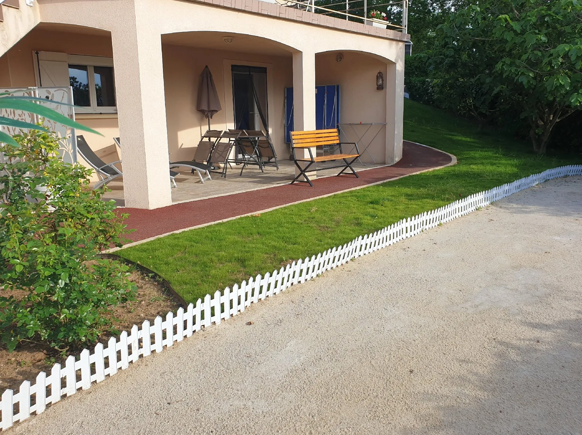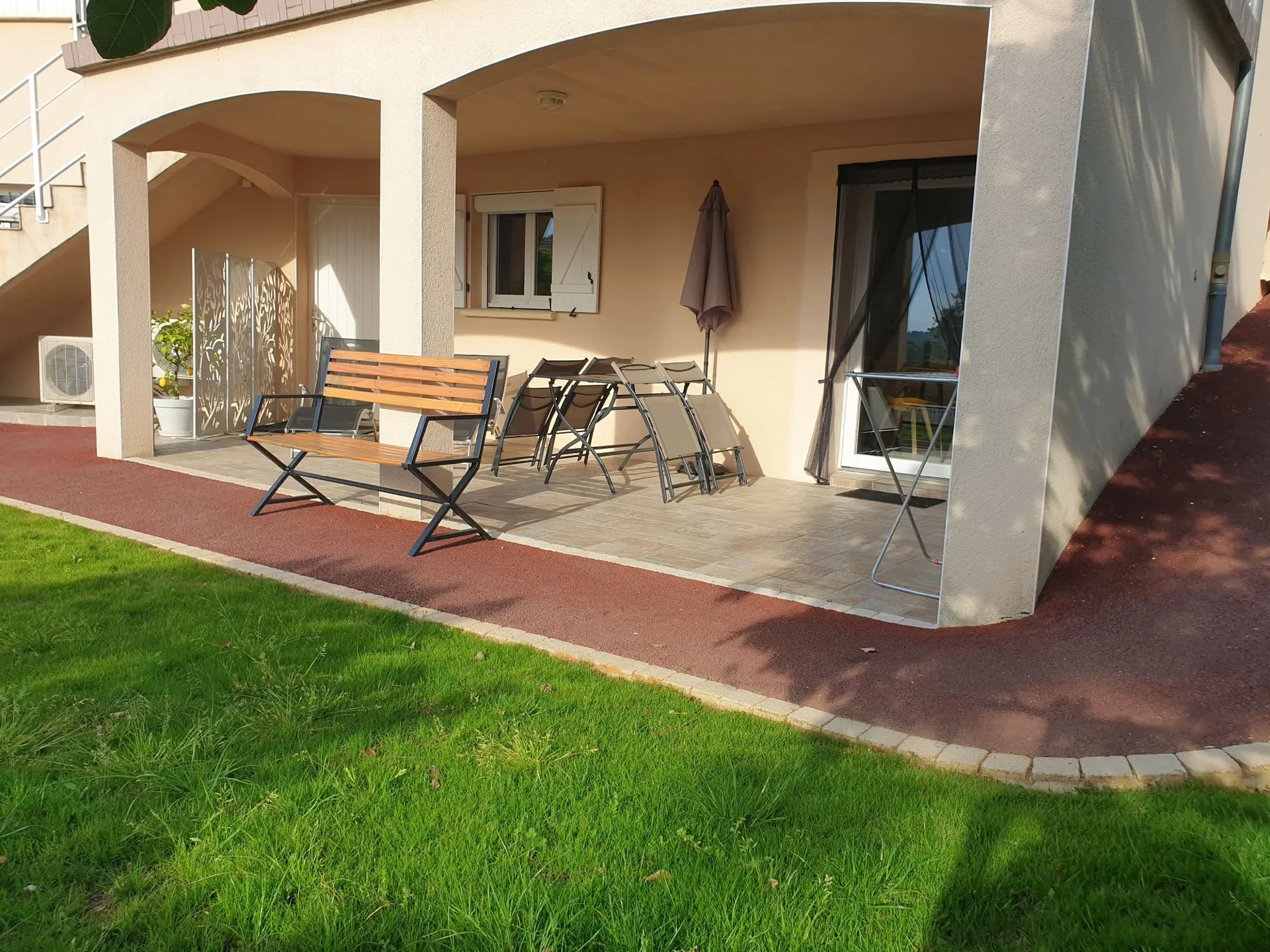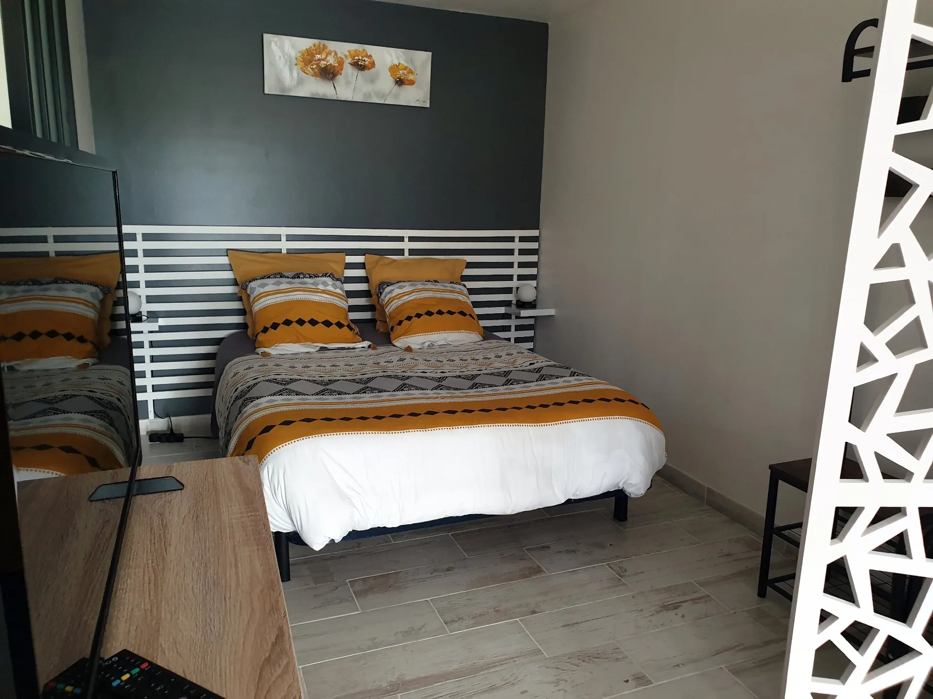 Gîte/studio indépendant, de plain-pied, au-rez-de-chaussée de notre maison, à la sortie du village. Studio (canapé, télévision) / coin-cuisine (lave-vaisselle, lave-linge) / coin-nuit (1 lit 140), accès internet/wifi, salle d’eau, chauffage électrique en saison froide, ventilateur en saison chaude, terrasse privée couverte, terrain privé, salon de jardin, plancha, 2 transats, parking privé, ping-pong, pétanque. Piscine extérieure chauffée partagée avec les propriétaires.