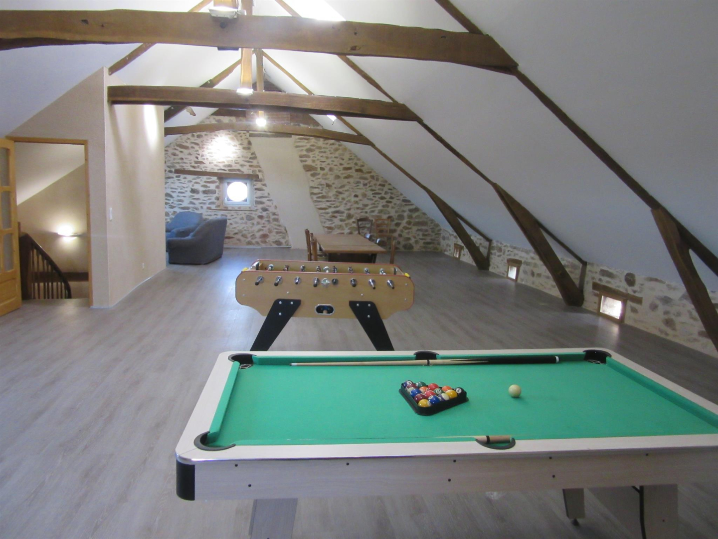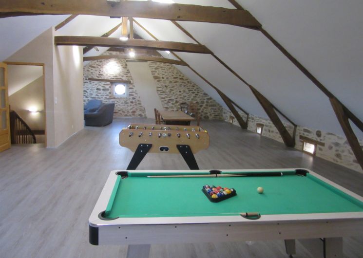 Au second étage, le grenier s’est transformée en immense salle d’activités (140m²) pouvant faire office de salle de jeux, salle de travail, de séminaire…Billard, baby-foot, coin TV avec canapé et fauteuil. La climatisation est disponible uniquement à cet étage.