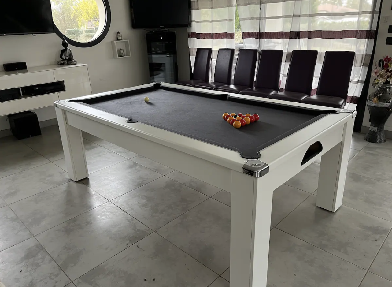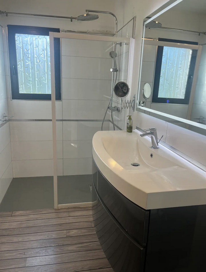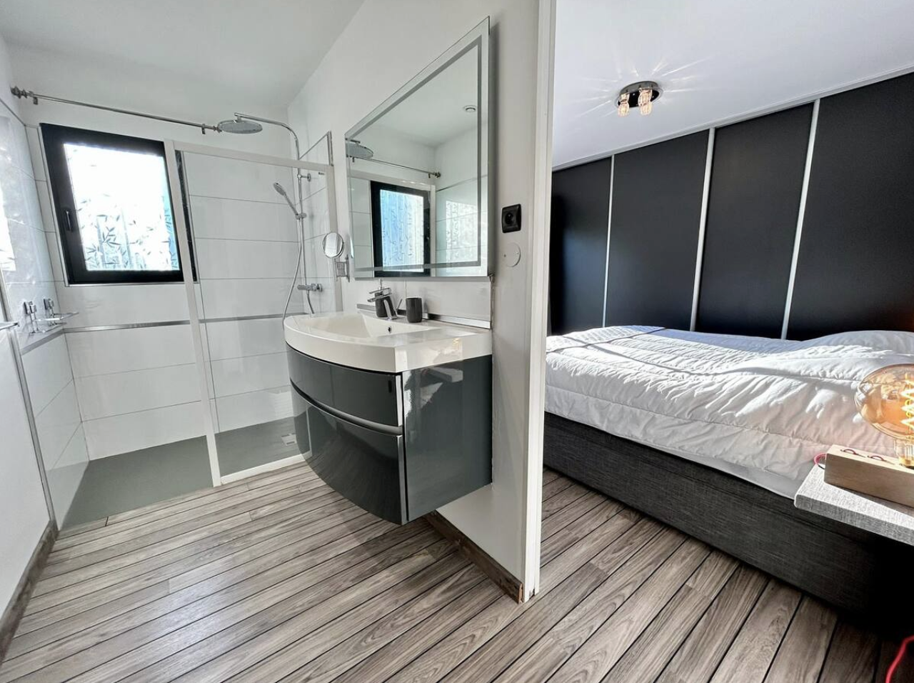 avec un salon (poêle à bois, canapé, TV connectée, billard) et un coin-cuisine (micro-ondes, plaque induction, robot de cuisine), 1 chambre (1 lit 180, 1 lit bébé) avec salle d’eau (douche italienne), 1 chambre (1 lit 160, 1 lit bébé) avec une salle de bain (baignoire balnéo), 1 chambre (1 lit 140, 2 lits 90 superposés) avec salle d’eau (douche cabine), 1 WC indépendant.